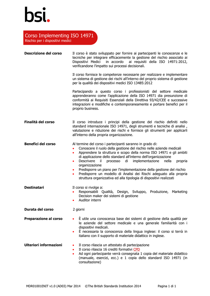 Corso Implementing ISO 14971 Rischio per i dispositivi medici Descrizione del corso Il corso è stato sviluppato per fornire ai partecipanti le conoscenze e le tecniche per integrare efficacemente la gestione del rischio associato ai Dispositivi Medici in accordo ai requisiti della ISO 14971:2012, verificandone l’impatto sui processi decisionali. Il corso fornisce le competenze necessarie per realizzare e implementare un sistema di gestione dei rischi all’interno del proprio sistema di gestione per la qualità dei dispositivi medici ISO 13485:2012 Partecipando a questo corso i professionisti del settore medicale apprenderanno come l’applicazione della ISO 14971 dia presunzione di conformità ai Requisiti Essenziali della Direttiva 93/42/CEE e successive integrazioni e modifiche e contemporaneamente e portare benefici per il proprio business. Finalità del corso Il corso introduce i principi della gestione del rischio definiti nello standard internazionale ISO 14971, degli strumenti e tecniche di analisi , valutazione e riduzione dei rischi e fornisce gli strumenti per applicarli all’interno della propria organizzazione. Benefici del corso Al termine del corso i partecipanti saranno in grado di: • Conoscere il ruolo della gestione del rischio nelle aziende medicali • Apprendere la struttura e scopo della norma ISO 14971 e gli ambiti di applicazione dello standard all’interno dell’organizzazione • Descrivere il processo di implementazione nella propria organizzazione • Predisporre un piano per l’implementazione della gestione del rischio • Predisporre un modello di Analisi dei Rischi adeguato alla propria struttura organizzativa ed alla tipologia di dispositivi realizzati Destinatari Il corso si rivolge a: • Responsabili Qualità, Design, Sviluppo, Decision maker dei sistemi di gestione • Auditor interni Durata del corso 2 giorni Preparazione al corso • • Ulteriori informazioni • • • Produzione, Marketing È utile una conoscenza base dei sistemi di gestione della qualità per le aziende del settore medicale e una generale familiarità con i dispositivi medicali. È necessaria la conoscenza della lingua inglese: il corso si terrà in italiano con il supporto di materiale didattico in inglese. Il corso rilascia un attestato di partecipazione Il corso rilascia 16 crediti formativi CPD Ad ogni partecipante verrà consegnata 1 copia del materiale didattico (manuale, esercizi, ecc.) e 1 copia dello standard ISO 14971 (in consultazione) MDR01001ENIT v1.0 (AD03) Mar 2014 ©The British Standards Institution 2014 Pagina 1 di 1