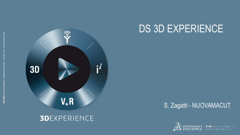 1 3DS.COM © Dassault Systèmes | Confidential Information | 10/5/2015 | ref.: 3DS_Document_2012 DS 3D EXPERIENCE S. Zagatti - NUOVAMACUT 3DS.COM © Dassault Systèmes | Confidential Information | 10/5/2015 | ref.: 3DS_Document_2012 Nuovamacut - La nostra azienda Fondata 1955 Sede Centrale Reggio Emilia Uffici in Italia 10 Persone 140 2 3DS.COM © Dassault Systèmes | Confidential Information | 10/5/2015 | ref.: 3DS_Document_2012 3DS - La nostra azienda Una società scientifica Al servizio di scienza, tecnologia e arte per una società sostenibile 190.000 imprese clienti 12.000 settori industriali in 140 Paesi persone impegnate •• 12 Oltre 10 milioni di utenti con soluzioni installate • 106 nazionalità • Oltre 100 milioni di utenti online • R&S mondiale/34 laboratori • Un'unica piattaforma software 3.500 partner • Ricerca e formazione • Software e tecnologia • Vendite e servizi Visione di lungo termine • Controllo dell'azionista di maggioranza • Ricavi: $ 3,1 mrd* • Margine operativo: 31,6%* * Non-IFRS 3 3DS.COM © Dassault Systèmes | Confidential Information | 10/5/2015 | ref.: 3DS_Document_2012 3DS - La nostra presenza 34 laboratori R&D Uffici 3DS (140) e principali partner commerciali 4 3DS.COM © Dassault Systèmes | Confidential Information | 10/5/2015 | ref.: 3DS_Document_2012 3DS - La nostra storia V3 5 V4 V5 V6 3DS.COM © Dassault Systèmes | Confidential Information | 10/5/2015 | ref.: 3DS_Document_2012 Perché la piattaforma 3DEXPERIENCE? 6 Per consentire ai nostri clienti di creare esperienze uniche per i loro consumatori o clienti finali 3DS.COM © Dassault Systèmes | Confidential Information | 10/5/2015 | ref.: 3DS_Document_2012 Elementi chiave della nostra Piattaforma 7 Applicativi social e collaborativi Applicativi di "intelligenza delle informazioni" Applicativi di modellazione 3D Applicativi di visualizzazione e simulazione Piattaforma 3DEXPERIENCE in tempo reale 3DS.COM © Dassault Systèmes | Confidential Information | 10/5/2015 | ref.: 3DS_Document_2012 La nostra Piattaforma 3DEXPERIENCE 8 3DS.COM © Dassault Systèmes | Confidential Information | 10/5/2015 | ref.: 3DS_Document_2012 La nostra Piattaforma 3DEXPERIENCE 9 Un portafoglio di esperienze per diversi settori industriali Al servizio di 12 settori industriali I nostri clienti… presenze importanti in ogni settore 3DS.COM © Dassault Systèmes | Confidential Information | 10/5/2015 | ref.: 3DS_Document_2012 TRASPORTI E MOBILITÀ AEROSPAZIALE E DIFESA NAVALE E OFFSHORE MACCHINE E IMPIANTI INDUSTRIALI HIGH-TECH PRODOTTI DI LARGO CONSUMO PRODOTTI DI CONSUMO CONFEZIONATI BIOSCIENZE ENERGIA E PROCESSO ARCHITETTURA, EDILIZIA E COSTRUZIONI SERVIZI FINANZIARI E ALLE IMPRESE RISORSE NATURALI 10 3DS.COM © Dassault Systèmes | Confidential Information | 10/5/2015 | ref.: 3DS_Document_2012 Aumentare la competitività innovando il PLM 2.0 “Improve product development efficiency and product quality” Gestire il capitale intellettuale dell’azienda governando il processo di sviluppo prodotto 11 Il Terreno di Gioco 3DS.COM © Dassault Systèmes | Confidential Information | 10/5/2015 | ref.: 3DS_Document_2012 I Clienti, i Concorrenti ed i Fornitori (dal locale al globale) La concorrenza ha raggiunto un significante vantaggio in termini di Time-to-Market Le richieste del cliente sono sempre più sofisticate e la sua disponibilità a spendere è sempre minore • Cost pressure has intensified (51% report as top three challenge- Aberdeen G.); • Markets and supply chains are globalizing • Competition is tougher (48% in top three); (36% in top three); Stiamo riducendo la gamma dei prodotti mentre la concorrenza la sta allargando • Product complexity has increased (30% in top three); Il ciclo di sviluppo Prodotto è più lungo del ciclo di vita del Prodotto stesso. • Product lifecycles have shrunk (49% in top three); 12 I Fornitori lavorano per tutti e quelli bravi costano sempre di più La velocità di Risposta/Consegna la otteniamo in cambio di una minore QUALITA’ del prodotto 3DS.COM © Dassault Systèmes | Confidential Information | 10/5/2015 | ref.: 3DS_Document_2012 Innovare significa cambiare 13 “ La competizione basata solo su una strategia di riduzione costi è inutile, se non combinata con quella basata sulla pianificazione del tempo e delle risorse a disposizione, sulla rivisitazione dei processi e sulla certezza che questi possano essere eseguiti con successo la prima volta” 3DS.COM © Dassault Systèmes | Confidential Information | 10/5/2015 | ref.: 3DS_Document_2012 Lo sviluppo prodotto è un processo complesso • Il 40% dei prodotti vengono lanciati sul mercato in ritardo o incompleti o non validati • Il 70% dei costi di un prodotto vengono determinati durante la fase di ricerca e sviluppo • Il 60% del tempo di progettazione è perso in attività a zero valore aggiunto (ricerca dati o trasferimento informazioni) • Il 50% delle informazioni sono ricreate dalla filiera • Il numero delle modifiche tardive è sempre troppo elevato • Il 50% dei ricavi di in media proviene da prodotti che sono stati introdotti sul mercato negli ultimi 2 anni • Solamente 1/3 dei nuovi prodotti lanciati resta sul mercato più di 2 anni Ricerche effettuate da fonti diverse 14 3DS.COM © Dassault Systèmes | Confidential Information | 10/5/2015 | ref.: 3DS_Document_2012 La strategia da adottare 15 FARE IN FRETTA NON E’ PIU’ SUFFICIENTE! Dal Computer Aided (X) everything … Enfasi sul ruolo dello strumento informatico per velocizzare o automatizzare una singola attività da svolgere ... al PLM Product LifeCycle Management uso dell’informatica per affrontare un problema, identificare una soluzione (Dati / Workflows), e standardizzare un metodo (best practice) di riferimento per applicare sempre lo stesso approccio al raggiungimento dell’obiettivo e aprire la porta al miglioramento continuo. 3DS.COM © Dassault Systèmes | Confidential Information | 10/5/2015 | ref.: 3DS_Document_2