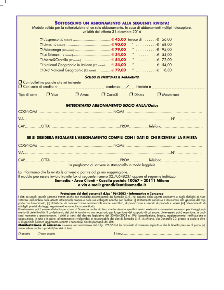 SOTTOSCRIVO UN ABBONAMENTO ALLA SEGUENTE RIVISTA: Modulo valido per la sottoscrizione di un solo abbonamento. In caso di abbonamenti multipli fotocopiare. validità dell’offerta 31 dicembre 2016 ❐ L’Espresso (52 numeri) ....................................€ ❐ Limes (12 numeri) ...........................................€ ❐ Micromega (10 numeri) ..................................€ ❐ Le Scienze (12 numeri) ....................................€ ❐ Mente&Cervello (12 numeri) ............................€ ❐ National Geographic in italiano (12 numeri) .....€ ❐ Dvd National Geographic (12 numeri)..............€ SCELGO DI EFFETTUARE IL PAGAMENTO ❐ Con bollettino postale che mi invierete ❐ Con carta di credito nr _ _ _ _ _ _ _ _ _ _ _ _ _ _ _ _ Tipo di carta ❐ Visa ❐ Amex 45,00 invece di . . . . . .€ 156,00 90,00 “ . . . . . . . . . .€ 168,00 79,00 “ . . . . . . . . . .€ 195,00 34,00 “ . . . . . . . . . .€ 54,00 54,00 “ . . . . . . . . . .€ 72,00 34,00 “ . . . . . . . . . .€ 54,00 79,00 “ . . . . . . . . . .€ 118,80 scadenza _ _/_ _ Intestata a _ _ _ _ _ _ _ _ _ _ _ _ _ _ _ _ _ _ _ ❐ CartaSi ❐ Diners ❐ Mastercard INTESTATARIO ABBONAMENTO SOCIO ANLA/Onlus COGNOME ………………………………………...............……NOME…………...................................………………….. VIA……………………………………………………………..........................................................…..N°………………….. CAP…………..CITTA’………………………………….......……………PROV……........... Telefono……………………………… SE SI DESIDERA REGALARE L’ABBONAMENTO COMPILI CON I DATI DI CHI RICEVERA’ LA RIVISTA COGNOME ………………………………………...............……NOME…………...................................………………….. VIA……………………………………………………………..........................................................…..N°………………….. CAP…………..CITTA’………………………………….......……………PROV……........... Telefono……………………………… La preghiamo di scrivere in stampatello in modo leggibile La informiamo che la rivista le arriverà a partire dal primo raggiungibile. Il modulo può essere inviato tramite fax al seguente numero 02.70648237 oppure al seguente indirizzo Somedia - Area Clienti - Casella postale 10067 – 20111 Milano o via e-mail: [email protected] –––––––––––––––––––––––––––––––––––––––––––––––––––––––––––––––––––––––––––––––––––––––––––––––––––––––––– Protezione dei dati personali d.lgs 196/2003 – Informativa e Consenso I dati personali raccolti saranno trattati anche con modalità automatizzate da Somedia S.r.l., nel rispetto della vigente normativa e degli obblighi di riservatezza, nell’ambito delle attività istituzionali proprie e delle sue collegate nonché per finalità: (i) strettamente connesse e strumentali alla gestione del rapporto con l’interessato, (ii) statistiche, di comunicazione commerciale anche interattiva, di promozione e vendita di prodotti e servizi (iii) adempimento di obblighi previsti da leggi, regolamenti e normativa comunitaria. Il trattamento potrà essere effettuato per conto di Somedia anche da terzi che forniscono specifici servizi elaborati e strumentali necessari per il raggiungimento di dette finalità. Il conferimento dei dati è facoltativo ma necessario per la gestione del rapporto di cui sopra. L’interessato potrà esercitare, in qualsiasi momento e gratuitamente, i diritti ai sensi del decreto legislativo del 30/06/2003 n. 196 (cancellazione, blocco, aggiornamento, rettificazione e opposizione, in tutto o in parte, al trattamento) rivolgendosi al responsabile dei dati di Somedia S.r.l., in Milano, Via Donatello 30, presso la quale è altresì disponibile l’elenco aggiornato recante i nominativi dei Responsabili dei dati. Manifestazione di consenso Ricevuta una informativa del d.lgs 196/2003 lei manifesta il consenso esplicito a che le finalità previste al punto (ii), siano estese anche a prodotti/servizi di terzi. ❐ accetto ❐ non accetto Firma……………………………………………………………..