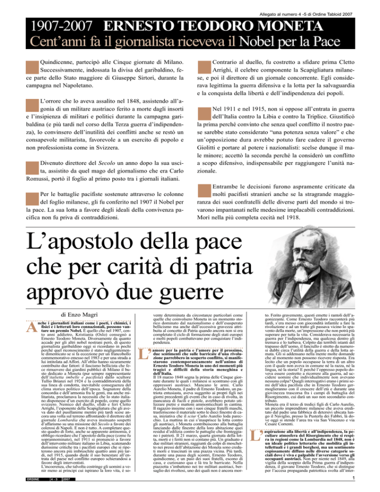 Allegato al numero 4 -5 di Ordine Tabloid 2007 1907-2007 ERNESTO TEODORO MONETA Cent’anni fa il giornalista riceveva il Nobel per la Pace Quindicenne, partecipò alle Cinque giornate di Milano. Successivamente, indossata la divisa del garibaldino, fece parte dello Stato maggiore di Giuseppe Sirtori, durante la campagna nel Napoletano. L’orrore che lo aveva assalito nel 1848, assistendo all’agonia di un militare austriaco ferito a morte dagli insorti e l’insipienza di militari e politici durante la campagna garibaldina (e più tardi nel corso della Terza guerra d’indipendenza), lo convinsero dell’inutilità dei conflitti anche se restò un consapevole militarista, favorevole a un esercito di popolo e non professionista come in Svizzera. Divenuto direttore del Secolo un anno dopo la sua uscita, assistito da quel mago del giornalismo che era Carlo Romussi, portò il foglio al primo posto tra i giornali italiani. Per le battaglie pacifiste sostenute attraverso le colonne del foglio milanese, gli fu conferito nel 1907 il Nobel per la pace. La sua lotta a favore degli ideali della convivenza pacifica non fu priva di contraddizioni. Contrario al duello, fu costretto a sfidare prima Cletto Arrighi, il celebre componente la Scapigliatura milanese, e poi il direttore di un giornale concorrente. Egli considerava legittima la guerra difensiva e la lotta per la salvaguardia e la conquista della libertà e dell’indipendenza dei popoli. Nel 1911 e nel 1915, non si oppose all’entrata in guerra dell’Italia contro la Libia e contro la Triplice. Giustificò la prima perché convinto che senza quel conflitto il nostro paese sarebbe stato considerato “una potenza senza valore” e che un’opposizione dura avrebbe potuto fare cadere il governo Giolitti e portare al potere i nazionalisti: scelse dunque il male minore; accettò la seconda perché la considerò un conflitto a scopo difensivo, indispensabile per raggiungere l’unità nazionale. Entrambe le decisioni furono aspramente criticate da molti pacifisti stranieri anche se la stragrande maggioranza dei suoi confratelli delle diverse parti del mondo si trovarono impantanati nelle medesime implacabili contraddizioni. Morì nella più completa cecità nel 1918. L’apostolo della pace che per carità di patria approvò due guerre di Enzo Magrì ORDINE 4-5 2007 to. Ferito gravemente, questi emette i rantoli dell’agonizzante. Come Ernesto Teodoro racconterà più tardi, s’era messo con giocondità infantile a fare la rivoluzione e ad un tratto gli passava vicino lo spavento della morte, un’impressione che non potrà più superare per tutta la vita. Considerava necessaria la guerra per l’indipendenza, ma qualcosa dentro gli tremava e lo turbava. Colpito dai terribili istanti del trapasso dell’uomo, il fanciullo è stretto da numerosi dubbi circa l’utilità della guerra e della lotta armata. Gli si addensano nella mente molte domande che al momento non possono ricevere risposta. Era lecito che un popolo occupasse la terra di un altro con il quale non aveva in comune né la razza, né la lingua, né la storia? E perché l’oppresso popolo doveva essere costretto a ricorrere alla guerra, ad uccidere uomini che individualmente non avevano nessuna colpa? Quegli interrogativi erano i primi semi dell’idea pacifista che in Ernesto Teodoro germoglieranno con il crescere dell’età e durante una giovinezza trascorsa fra i campi di battaglia del Risorgimento, cui darà un suo non secondario contributo. Moneta era il terzo di tredici figli di Carlo Aurelio, un piccolo imprenditore milanese che aveva ereditato dal padre una fabbrica di detersivi ubicata lungo il Naviglio, presso la Pusterla dei Fabbri, là dove oggi si stende l’area tra via San Vincenzo e via Cesare Correnti. vente determinata da circostanze particolari come quelle che coinvolsero Moneta in un momento storico dominato dal nazionalismo e dell’esasperato bellicismo ma anche dall’eccessiva gravezza attribuita al concetto di Patria quando ancora non si era completato il ciclo di formazione degli stati europei e molti popoli combattevano per conquistare l’indipendenza. A nche i giornalisti italiani come i poeti, i chimici, i fisici e i letterati loro connazionali, possono vantare un premio Nobel. È quello che nel 1907, cento anni addietro, Kristiania (Oslo) consegnò a Ernesto Teodoro Moneta. Diversamente da quanto accade per gli altri nobel nostrani però, di questo giornalista garibaldino oggi si ricordano in pochi perché quel riconoscimento è stato negligentemente dimenticato se si fa eccezione per un francobollo commemorativo emesso nel 1983 e per una strada a lui intitolata ad Affori. All’oblio hanno sicuramente contribuito due fattori: il fascismo bellicista che fece rimuovere dai giardini pubblici di Milano il busto dedicato a Moneta (pur sempre rappresentante dell’italietta imbelle e pacifista) dallo scultore Tullio Brianzi nel 1924 e la contraddittorietà della sua linea di condotta, inevitabile conseguenza del clima storico politico dell’epoca. Sognatore della concordia e dell’armonia fra le genti, ma anche militarista, proclamava la necessità che lo stato italiano disponesse d’un esercito di popolo, come quello svizzero. Nemico del duello, sfidò e ferì Cletto Arrighi, l’esponente della Scapigliatura che gli aveva dato del pusillanime mentre più tardi scese ancora una volta sul terreno affrontando il direttore del giornale Lombardia che aveva insinuato sospetti d’affarismo su una missione del Secolo a favore dei colerosi di Napoli. E non è tutto. A completare questo quadro di forte, anche se apparente antinomia, è obbligo ricordare che l’apostolo della pace (come fu soprannominato), nel 1911 si pronunciò a favore dell’intervento militare italiano in Libia, scatenando durissime critiche tra i pacifisti europei che si ripeterono ancora più imbruschite quattro anni più tardi, nel 1915, quando diede il suo benestare all’entrata d