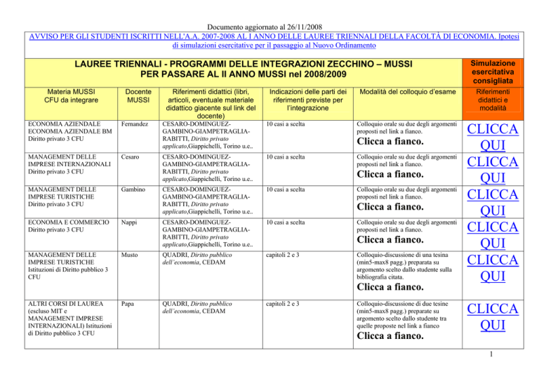 Documento aggiornato al 26/11/2008 AVVISO PER GLI STUDENTI ISCRITTI NELL'A.A. 2007-2008 AL I ANNO DELLE LAUREE TRIENNALI DELLA FACOLTÀ DI ECONOMIA. Ipotesi di simulazioni esercitative per il passaggio al Nuovo Ordinamento LAUREE TRIENNALI - PROGRAMMI DELLE INTEGRAZIONI ZECCHINO – MUSSI PER PASSARE AL II ANNO MUSSI nel 2008/2009 Materia MUSSI CFU da integrare Docente MUSSI ECONOMIA AZIENDALE ECONOMIA AZIENDALE BM Diritto privato 3 CFU Fernandez MANAGEMENT DELLE IMPRESE INTERNAZIONALI Diritto privato 3 CFU Cesaro MANAGEMENT DELLE IMPRESE TURISTICHE Diritto privato 3 CFU Gambino ECONOMIA E COMMERCIO Diritto privato 3 CFU Nappi MANAGEMENT DELLE IMPRESE TURISTICHE Istituzioni di Diritto pubblico 3 CFU Musto Riferimenti didattici (libri, articoli, eventuale materiale didattico giacente sul link del docente) Indicazioni delle parti dei riferimenti previste per l’integrazione CESARO-DOMINGUEZGAMBINO-GIAMPETRAGLIARABITTI, Diritto privato applicato,Giappichelli, Torino u.e.. 10 casi a scelta CESARO-DOMINGUEZGAMBINO-GIAMPETRAGLIARABITTI, Diritto privato applicato,Giappichelli, Torino u.e.. 10 casi a scelta CESARO-DOMINGUEZGAMBINO-GIAMPETRAGLIARABITTI, Diritto privato applicato,Giappichelli, Torino u.e.. 10 casi a scelta CESARO-DOMINGUEZGAMBINO-GIAMPETRAGLIARABITTI, Diritto privato applicato,Giappichelli, Torino u.e.. 10 casi a scelta QUADRI, Diritto pubblico dell’economia, CEDAM capitoli 2 e 3 Modalità del colloquio d’esame Riferimenti didattici e modalità Colloquio orale su due degli argomenti proposti nel link a fianco. CLICCA QUI CLICCA QUI CLICCA QUI CLICCA QUI CLICCA QUI Clicca a fianco. Colloquio orale su due degli argomenti proposti nel link a fianco. Clicca a fianco. Colloquio orale su due degli argomenti proposti nel link a fianco. Clicca a fianco. Colloquio orale su due degli argomenti proposti nel link a fianco. Clicca a fianco. Colloquio-discussione di una tesina (min5-max8 pagg.) preparata su argomento scelto dallo studente sulla bibliografia citata. Clicca a fianco. ALTRI CORSI DI LAUREA (escluso MIT e MANAGEMENT IMPRESE INTERNAZIONALI) Istituzioni di Diritto pubblico 3 CFU Papa QUADRI, Diritto pubblico dell’economia, CEDAM capitoli 2 e 3 Simulazione esercitativa consigliata Colloquio-discussione di due tesine (min5-max8 pagg.) preparate su argomento scelto dallo studente tra quelle proposte nel link a fianco Clicca a fianco. CLICCA QUI 1 Documento aggiornato al 26/11/2008 ECONOMIA AZIENDALE ECONOMIA AZIENDALE BM Politica economica 3 CFU (x studenti che hanno sostenuto Macroeconomia di 6 CFU) Garofalo / De Siano MANKIW, Macroeconomia , Zanichelli Ed. un capitolo dal testo di Macroeconomia di Mankiw (Zanichelli ed) a scelta tra: 1) Offerta aggregata (cap 13); 2) Debito pubblico e Deficit di bilancio (cap 15) Colloquio su un capitolo a scelta tra i due proposti e discussione di una tesina (min5-max8 pagg.) tra le due proposte. Clicca a fianco. CLICCA QUI una tesina a scelta tra quelle allegate: 1) la politica monetaria nell'UME; 2) la politica fiscale nell'UME. ECONOMIA AZIENDALE ECONOMIA AZIENDALE BM Metodi di matematica applicata 3 CFU De Angelis ECONOMIA AZIENDALE BM Economia aziendale 3 CFU Scaletti DE ANGELIS, Matematica di base, Giappichelli Vol. II capp. da III a VI Un esercizio estratto a sorte da una rosa di cinque esercizi proposti nel link a destra. Clicca a fianco. ECONOMIA AZIENDALE BM Economia e gestione delle imprese 3 CFU Calza ECONOMIA AZIENDALE (per chi transita daEA-BM Zecchino a EA-Mussi) Statistica per l’impresa 3 CFU Regoli CERBIONI, CINQUINI, SOSTERO, Contabilità e bilancio, McGrow-Hill, 2003 Materiale didattico vario in distribuzione presso la Segreteria Didattica del Dipartimento di Studi Aziendali in Via Acton, 38 Giovannini E. (2006), Le statistiche economiche, Il Mulino La partita doppia quale strumento di rilevazione dei valori suscitati da scambi con terze economie; il libro giornale; i conti; altri libri contabili. Le rilevazioni sistematiche e continuative dei valori attinenti il ciclo acquisti, il ciclo vendite, il ciclo paghe e stipendi. La chiusura dei conti nelle tavole di sintesi. Dispense disponibili presso la segreteria didattica del dipartimento di Studi aziendali via Acton Un esercizio estratto a sorte da una rosa di cinque esercizi proposti nel link a destra. Cap.II Colloquio orale. Clicca a fianco. Breve questionario scritto Clicca a fianco. Clicca a fianco. CLICCA QUI CLICCA QUI CLICCA QUI CLICCA QUI 2 Documento aggiornato al 26/11/2008 ECONOMIA AZIENDALE BM Abilità linguistica 3 CFU (INGLESE) Cavaliere MANAGEMENT DELLE IMPRESE TURISTICHE Metodi di matematica applicata 3 CFU per studenti provenienti da Management imprese turistiche (percorso RTBC) Squitieri MANAGEMENT DELLE IMPRESE TURISTICHE Metodi di matematica applicata 6 CFU per studenti provenienti da Management imprese turistiche (percorso base) Squitieri Lettura e traduzione di uno dei tre articoli indicati a fianco. Clicca a fianco. DE ANGELIS, Matematica di base, Giappichelli Vol. II capp. da III a VI Un esercizio estratto a sorte da una rosa di cinque esercizi proposti nel link a destra. Clicca a fianco. DE ANGELIS, Matematica di base, Giappichelli Vol. I DE ANGELIS, Matematica di base, Giappichelli Vol. II (completare il volume I ed i primi due capitoli del volume II) Due esercizi cosi individuati: 1. Un esercizio estratto a sorte da una rosa di cinque esercizi proposti nel link a destra. 2. Un esercizio estratto a sorte da una rosa di due esercizi proposti nel link a destra. CLICCA QUI CLICCA QUI CLICCA QUI Clicca a fianco. MANAGEMENT DELLE IMPRESE INTERNAZIONALI Diritto pubblico e dell’Unione Europea 3 CFU Schepisi DANIELE,, Diritto dell’Unione Europea, Giuffrè capp. I, III e IV Colloquio orale su due argomenti cosi individuati: un argomento obbligatorio per tutti (denominato “materiale 1” nel link a fianco), un argomento a scelta tra quelli individuati come “materiale 2”, “materiale 3”, “materiale 4” nel link a fianco. CLICCA QUI Clicca a fia