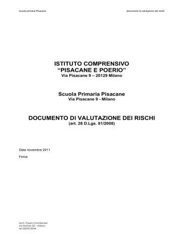 scuola primaria Pisacane documento di valutazione dei rischi ISTITUTO COMPRENSIVO “PISACANE E POERIO” Via Pisacane 9 – 20129 Milano Scuola Primaria Pisacane Via Pisacane 9 - Milano DOCUMENTO DI VALUTAZIONE DEI RISCHI (art. 28 D.Lgs. 81/2008) Data novembre 2011 Firma arch. Paola Confalonieri via Settala 35 – Milano tel 0229513044 scuola primaria Pisacane documento valutazione dei rischi DOCUMENTO DI VALUTAZIONE DEI RISCHI PER LA SALUTE E LA SICUREZZA DURANTE IL LAVORO (art 28 D.Lgs. 81/2008) PREMESSA Il presente documento è stato redatto con i seguenti capitoli: Descrizione della scuola Descrizione dell’attività lavorativa Rischi individuati all’interno della scuola che comprende: - valutazione dei rischi per la salute e la sicurezza conseguenti allo stato delle strutture edilizie e degli impianti; - valutazione dei rischi per la salute e la sicurezza conseguenti ai comportamenti umani ed alle risorse disponibili - valutazione rischi specifici (videoterminali, chimico, rumore, incendio, gravidanza) Misure di sicurezza adottate Programma integrato delle misure di sicurezza da adottare che comprende: - sostituzione di ciò che è pericoloso con ciò che lo è di meno; - misure igieniche; - misure in caso di pronto soccorso; - informazione agli addetti (personale e scolari) circa i rischi; - formazione degli addetti (personale e scolari) per la tutela della salute e delle condizioni di sicurezza; - istruzione agli addetti (personale e scolari) sulla tutela della salute e delle condizioni di sicurezza. Risultati della valutazione dei rischi Programma di miglioramento delle misure di sicurezza arch. Paola Confalonieri via Settala 35 – Milano tel 0229513044 scuola primaria Pisacane documento valutazione dei rischi DESCRIZIONE DELLA SCUOLA L'edificio scolastico di via Pisacane 9 è stato costruito nell'anno 1969 proprietà comunale . Tutto l’edificio comprende : - scuola primaria - micronido in gestione a cooperativa - scuola dell’infanzia gestita dal Comune di Milano ed è di Il dirigente scolastico (datore di lavoro) è la dott.ssa Giselda Nosella Il Responsabile del Servizio Prevenzione e Protezione è l’arch. Paola Confalonieri consulente esterno Il Rappresentante dei Lavoratori per la Sicurezza è signora Raffaella Mattei La valutazione dei rischi è stata effettuata dal dirigente insieme all’RSPP e previa consultazione dell’RLS. La scuola elementare è così composta per l’anno scolastico 2011/12 1 dirigente – datore di lavoro 56 insegnanti 1 direttore amministrativo 6 assistenti amministrativi 11 collaboratori scolastici 607 alunni Localizzazione: l’edificio scolastico è situato in una zona centrale della città quindi soggetto a fonti di inquinamento dell' aria, a fonti di inquinamento acustico, a pericoli per la presenza di traffico intenso. Lo spazio antistante l'ingresso, è sufficientemente ampio rispetto al numero degli scolari in ingresso/uscita, sul marciapiedi sono presenti delle transenne che proteggono dalla strada Le porte di ingresso e di uscita hanno dimensioni adeguate in rapporto al numero degli scolari ,sono dotate di maniglione antipanico e di apertura verso l’esterno All’ atrio di ingresso si accede dal cortile grande mediante rampa adeguata anche per i disabili; all’interno le dimensioni non sono ampie rispetto al carico delle presenze. Uscite di sicurezza , sono in numero adeguato all’affollamento della scuola Segnaletica interna per indicare vie di sgombero rapido e sistemi di spegnimento Incendi è adeguata Segnali di allarme in caso di emergenza c’è un impianto sonoro di allarme con pulsanti di azionamento nei corridoi Le facciate interne ed esterne sono in buono stato di manutenzione La copertura del fabbricato in parte a terrazzo e in parte copertura piana non praticabile non è in buono stato manutentivo ; ci sono spesso infiltrazioni d’acqua L’edificio non è compartimentato Le scale interne sono 5 ma ne vengono utilizzate 4: sono con gradini di marmo con arch. Paola Confalonieri via Settala 35 – Milano tel 0229513044 scuola primaria Pisacane documento valutazione dei rischi strisce antiscivolo parapetti di altezza adeguata e larghezza rampe a norma adeguate per il carico di persone. Le scale non sono protette e non sono isolate dal resto della scuola E’ presente una scala esterna di emergenza con struttura in ferro, gradini e pianerottoli in grigliato di ferro che collega i tre piani fuori terra. Le aule sono a norma come metratura disponibile rispetto agli scolari presenti, sono adeguati i rapporti aeroilluminanti (illuminazione naturale, ricambio d’aria); c’è una adeguata illuminazione artificiale e c’è una protezione dai raggi solari,con veneziane, lavate una volta all’anno I serramenti esterni sono in alluminio non sempre funzionanti I divisori interni tra aule e corridoi sono prefabbricati in legno e vetro (aumento del carico d’incendio) Le porte di accesso alle scale sono con telaio in alluminio e vetro antisfondamento; non tutte sono dotate di maniglione antipanico; non ci sono protezioni per evitare schiacciamenti nella chiusura I pavimenti sono in piastrelle e sono in buone condizioni salvo delle crepe dove ci sono i giunti dell’edificio Gli arredi sono adeguati all’uso ; bisogna avere la possibilità del ricambio di banchi e sedie nel caso di rottura degli stessi Era stata riscontrata presenza di amianto nel vespaio sotto il piano seminterrato ed è stato eseguito il lavoro di smaltimento. I controsoffitti sono in buono stato e ad essi sono appesi i corpi illuminati in numero sufficiente a parte l’ultimo piano dove ci sono infiltrazioni d’acqua. L’impianto elettrico è efficiente ma non risulta certificato; è presente l’impianto di terra ma non sono state eseguite le verifiche biennali obbligatorie; ci sono diverse prese a muro che non sono sicure e alcuni cavi volanti; le luci di emergenza non sono controllate L’impianto citofonico è funzionante ma non certificato Gli im