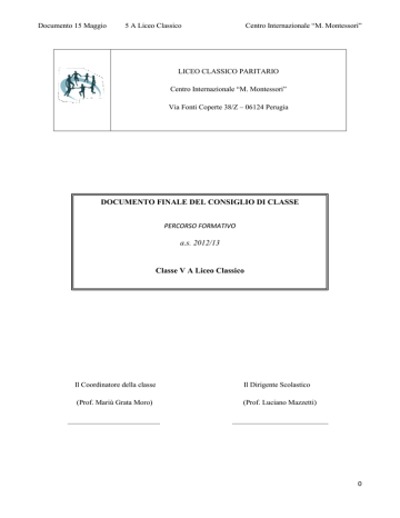 Documento 15 Maggio Centro Internazionale “M. Montessori” 5 A Liceo Classico LICEO CLASSICO PARITARIO Centro Internazionale “M. Montessori” Via Fonti Coperte 38/Z – 06124 Perugia DOCUMENTO FINALE DEL CONSIGLIO DI CLASSE PERCORSO FORMATIVO a.s. 2012/13 Classe V A Liceo Classico Il Coordinatore della classe Il Dirigente Scolastico (Prof. Mariù Grata Moro) (Prof. Luciano Mazzetti) _________________________ __________________________ 0 Documento 15 Maggio Centro Internazionale “M. Montessori” 5 A Liceo Classico DOCENTI DOCENTI FIRMA Italiano: Moro Mariù Latino: Fratalocchi Michela Greco: Fratalocchi Michela L. Straniera (INGLESE): Iannalfo Benedetta Filosofia: Berardi Marco Storia: Carubini Erica Scienze: Ludovisi Cinzia Matematica: Scorsipa Giacomo Fisica: Scorsipa Giacomo Storia dell’Arte: Rosa Lucia Educazione Fisica: La Rosa Marco DOCENTE Moro Mariù Benedetta Iannalfo Fratalocchi Michela Berardi Marco Carubini Erica Ludovisi Cinzia Scorsipa Giacomo Scorsipa Giacomo Rosa Lucia La Rosa Marco RAPPORTO DI LAVORO Tempo Indeterminato Tempo Determinato Tempo Indeterminato Prestazione d’opera Tempo Indeterminato Tempo Indeterminato Tempo Indeterminato Temoi Indeterminato Tempo Indeterminato Prestazione d’opera MATERIA DI INSEGNAMENTO Italiano Inglese Latino Greco Filosofia Storia Scienze Fisica Matematica Storia dell'Arte Educazione Fisica ORE SETT. 4 4 3+4 3 3 2 2 2 2 2 Continuità Didattica Si No Si Si Si No Si No Sì No 1 Documento 15 Maggio 5 A Liceo Classico Centro Internazionale “M. Montessori” PERCORSO FORMATIVO Il concetto di licealità, per essere efficace e leale, deve pervadere gli studi di tutti gli indirizzi di questo ordine di scuole. La licealità in sintesi si pone come unità di cultura e di metodo. Obiettivo del corso classico è contribuire all’acquisizione della padronanza delle metodologie, delle tecniche e dei linguaggi matematici nonché del rigore metodologico, della sensibilità dei valori estetici, dell’ampiezza e della fecondità della visione culturale del mondo classico che consentono di cogliere le radici dell’Umanesimo moderno. Il recupero della grande tradizione umanistica che da Karl Wilhelm Von Humboldt a Giovanni Gentile ha caratterizzato la cultura europea, la consapevolezza che si può conoscere il mondo con la mano destra delle scienze ma anche con la mano sinistra dell’arte e delle religioni, della poesia, della filosofia, la consapevolezza con Pascal “delle ragioni del cuore accanto alle ragioni della ragione”, la coscienza che “anche quando la scienza avrà risolto tutti i suoi problemi ognuno si alzerà al mattino con tutti i suoi problemi addosso” Wittgenstein, garantisce la specificità dell’indirizzo e la sua energia educante. Al termine del percorso scolastico dell’indirizzo classico lo studente, seppur con gradi diversi di maturazione, è in grado di: Interpretare la complessità del presente come risultato di un processo di stratificazione culturale, in cui la civiltà classica è elemento fondante; Riconoscere gli elementi di diversità culturale tra passato e presente, sapendoli comprendere e valorizzare alla luce delle trasformazioni in senso multietnico della società attuale; Utilizzare la lettura e l’interpretazione diretta dei documenti, come strumento privilegiato per accedere alle culture che essi esprimono e collocarli storicamente; Tradurre ed interpretare i testi del mondo classico riconoscendone le principali strutture morfosintattiche e le peculiarità stilistico-lessicali, sapendole rapportare con il patrimonio tematico e formale delle letterature europee; Possedere, grazie allo studio della lingua latina e greca, una particolare competenza linguistica e comunicativa che gli consentono di utilizzare la lingua italiana con piena consapevolezza della sua evoluzione storica e di riconoscere e decodificare sul piano etimologico termini specifici di linguaggi settoriali; Conoscere le testimonianze del mondo classico presenti sul territorio ed essere sensibile alla tutela del patrimonio artistico e storico-archeologico. 2 Documento 15 Maggio 5 A Liceo Classico Centro Internazionale “M. Montessori” OBIETTIVI COMUNI DEL CONSIGLIO DI CLASSE All’inizio dell’ a.s. il Consiglio di Classe ha formulato i seguenti obiettivi comuni a tutte le discipline: OBIETTIVI DI CARATTERE FORMATIVO favorire l’acquisizione di conoscenze contestualizzate, di abilità e di competenze disciplinari e interdisciplinari; offrire, in tal modo, anche un patrimonio di strumenti, affinché lo studente diventi autonomo nel percorso di perfezionamento culturale; individuare e potenziare stili cognitivi e specifiche attitudini attraverso percorsi individuali e originali di apprendimento; valorizzare le iniziative degli studenti per favorire la motivazione all’apprendimento, la consapevolezza e la responsabilità individuale, la partecipazione attiva e propositiva degli studenti; incoraggiare un atteggiamento problematico nei confronti del sapere, per far maturare la capacità critica di giudizio; porre come obiettivo fondamentale interdisciplinare l’educazione linguistica, attraverso cui favorire la padronanza di terminologie specifiche, l’acquisizione di linguaggi verbali e non, i processi di comprensione e produzione di testi di vario genere; educare a comportamenti solidali, che privilegino la difesa e l’estensione della democrazia negli aspetti relazionali; educare alla cultura della pace, della non violenza, dell’accettazione creativa delle reciproche differenze ed al rispetto di sé e della propria personalità; promuovere atteggiamenti responsabili nei confronti dell’ambiente e del territorio, favorendone la conoscenza e il rispetto. OBIETTIVI DI CARATTERE COGNITIVO sviluppare la capacità di ascolto e decodificazione di messaggi diversi, inerenti a diverse aree della comunicazione verbale e non verbale; affinare la capacità di comprensione di messaggi, concetti, situazioni, problemi, educando ad 