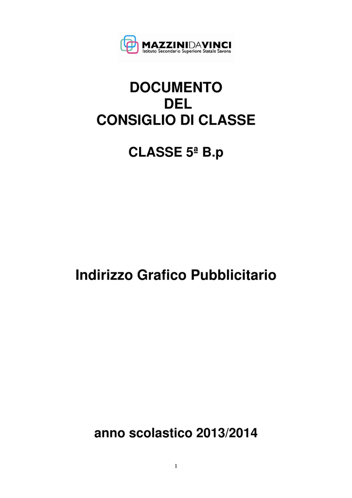 DOCUMENTO DEL CONSIGLIO DI CLASSE CLASSE 5ª B.p Indirizzo Grafico Pubblicitario anno scolastico 2013/2014 1 1. PROFILO DELL’INDIRIZZO TECNICO DELLA GRAFICA E DELLA PUBBLICITA’ 1.1 Finalità istituzionali connesse con la tipologia dell’Istituto L'Indirizzo Pubblicitario dell'Istituto Professionale di Stato Mazzini vede attivi due titoli di studio: • Operatore al termine del terzo anno • Tecnico Diplomato dopo l'esame di Stato del quinto anno. Il diploma quinquennale costituisce titolo valido per l'accesso a tutte le facoltà universitarie. Titolo di studio: qualifica (3° anno): Operatore Grafico Pubblicitario Figura in grado di utilizzare la comunicazione visiva per scopi funzionali legati al messaggio pubblicitario che nasce nelle agenzie, nelle imprese industriali ed artigianali. Ha competenze supportate da un'area culturale comune che fornisce ulteriori possibilità di capire la complessità del sociale, di attivare insieme conoscenze tecniche critiche e di avere piena disponibilità al cambiamento. Titolo di studio: maturità (5° anno): Tecnico della Grafica Pubblicitaria Il Tecnico Pubblicitario è in grado di applicare le tecnologie delle produzioni visive tradizionali (stampa, fotografia) e moderne (video-grafica, multimedialità) alla comunicazione dei massmedia coniugando gli aspetti formali della professione con quelli pratico-applicativi della comunicazione. 1.2 Caratteri dell’Istituto connessi con la tipologia del territorio e dell’utenza Per quanto riguarda le finalità dell’Istituto, è previsto: - Programmazione strutturata per ogni singola disciplina con verifiche e valutazione degli obiettivi raggiunti e con possibilità di recupero in itinere o al termine dell’attività didattica, nell’ambito delle linee guida stabilite dal P.O.F. - Adattamento del tempo scuola alle esigenze di carattere didattico, ambientale, logistico e strutturale - Flessibilità oraria in rapporto alle esigenze presenti negli indirizzi specifici e alle attività connesse alla programmazione modulare . - Supporto del personale non docente a servizi e progetti didattici. - Coordinamento didattico per discipline. - Centro servizi per il coordinamento dei laboratori informatici e per i collegamenti Internet. Per quanto riguarda i rapporti con il territorio, l’Istituto organizza: − Convenzioni con agenzie formative, imprese ed enti − Progetti in rete con scuole − Tirocini aziendali, stages − Collaborazioni esterne − Partecipazione a concorsi e/o progetti indetti da associazioni culturali ed istituzioni locali e nazionali 2 2. STORIA DELLA CLASSE 2.1 Elenco docenti COGNOME NOME MATERIA STATO GIURIDICO Bazzano Paola LINGUA INGLESE T.I. Fenoglio Lucia ITALIANO STORIA T.I. Persico Massimo PSICOLOGIA DELLA COMUNICAZIONE T.I. Marchionni Rossana SCIENZE MOTORIE T.I. Guazzotti Miriam MATEMATICA T.I. Di Mito Valeria TECNICA FOTOGRAFICA T.D. Enrico Raffaella PIANIFICAZIONE PUBBLICITARIA T.I. Caprino Angela PROGETTAZIONE GRAFICA T.I. Mariano Mauro STORIA DELLE ARTI VISIVE T.I. Siri Vittorio RELIGIONE T.I. SOSTEGNO T.I. SOSTEGNO T.I. Comune Donatella Becci Sabrina 3 Elenco alunni N. COGNOME NOME PROVENIENZA 1. Barberio Juri 2. Borrelli Carmelo Mattia 4ª B.p 4ª B.p 3. Cavalleri Denise 4ª B.p 4. De Micheli Piroddi Mara 4ª B.p 5. Ferraris Federico 4ª B.p 6. Ferraris Lucrezia 4ª B.p 7. Giana Andrea 4ª B.p 8. Kortoci Edmond 4ª B.p 9. Lequio Margherita 4ª B.p 10. Macco Alessandra 4ª B.p 11. Maggi Elena Rachele altro istituto 12. Mangani Alessia 4ª B.p 13. Marangi Giulia 4ª B.p 14. Pachì Greta 4ª B.p 15. Parodi Giulia 4ª B.p 16. Perrotta Isabella 4ª B.p 17. Pichierri Alessia 4ª B.p 18. Podestà Nicole 4ª B.p 19. Rollero Nadia 4ª B.p 20. Romano Gianluca 4ª B.p 21. Scaramozzino Macciardi Arianna 4ª B.p 4 2.2 Variazioni nel Consiglio di Classe DISCIPLINE CURRICOLO ANNI CORSO ITALIANO STORIA MATEMATICA SCIENZE MOTORIE LINGUA INGLESE PIANIFICAZIONE PUBBLICITARIA 4° - 5° 4° - 5° 4° - 5° 4° - 5° 4° - 5° PROGETTAZIONE GRAFICA PSICOLOGIA DELLA COMUNICAZIONE STORIA DELLE ARTI VISIVE TECNICA FOTOGRAFICA CLASSE IV CLASSE V • • • • • 4° - 5° • • • 4° - 5° • • • 4° - 5° 4° - 5° 4° - 5° 2.3 Flussi degli studenti della classe CLASSE QUARTA QUINTA ISCRITTI STESSA CLASSE 22 21 RITIRATI IN PROMOSSI ISCRITTI DA CORSO ALTRA PROMOSSI CON RESPINTI D’ANNO CLASSE A GIUGNO DEBITO 13 7 2 1 TOTALE STUDENTI REGOLARI che hanno frequentato lo stesso corso senza ripetizioni o spostamenti dalla quarta alla quinta classe: n. 20 La classe IV B.p era formata da 20 alunni, nello scrutino tutti sono stati ammessi alla classe V con la seguente situazione riguardante la media ed i debiti formativi: Media Numero alunni 6≤v<7 6 7≤v<8 13 8≤v<9 1 5 2.4 Risultati dello scrutinio della classe IV Materia Numero Studenti promossi con 6 ITALIANO Numero Numero Numero Studenti studenti studenti promossi promossi promossi con 7 con 8 con 9-10 9 10 1 8 11 2 3 4 6 10 15 3 1 1 PIANIFICAZIONE PUBBLICITARIA 7 7 3 1 PROGETTAZIONE GRAFICA 8 8 1 3 11 7 1 STORIA DELLE ARTI VISIVE 5 10 5 TECNICA FOTOGRAFICA 3 4 12 STORIA MATEMATICA 7 SCIENZE MOTORIE LINGUA INGLESE PSICOLOGIA DELLA COMUNICAZIONE 6 Numero Studenti con debito Formativo 1 8 2 1 1 2.5 Profilo della classe La classe composta da 21 allievi ha mantenuto nel corso dei cinque anni un nucleo abbastanza compatto. Si è creato un clima sereno, di collaborazione e solidarietà che ha permesso di lavorare in modo armonico. La classe ha avuto una certa difficoltà a rendere costante l’interesse e un buon profitto in tutte le materie. L’impegno e lo studio sono stati comunque nel complesso adeguati. Essendo presenti nella classe livelli di partenza, stili e ritmi di apprendimento diversi, i risultati conseguiti si mostrano differenti . In generale gli studenti in difficoltà si sono impegnati a sanare le lacune, migliorando progressivamente il proprio profitto. Alcuni allievi hanno dimostrato discrete qualità nelle materie di