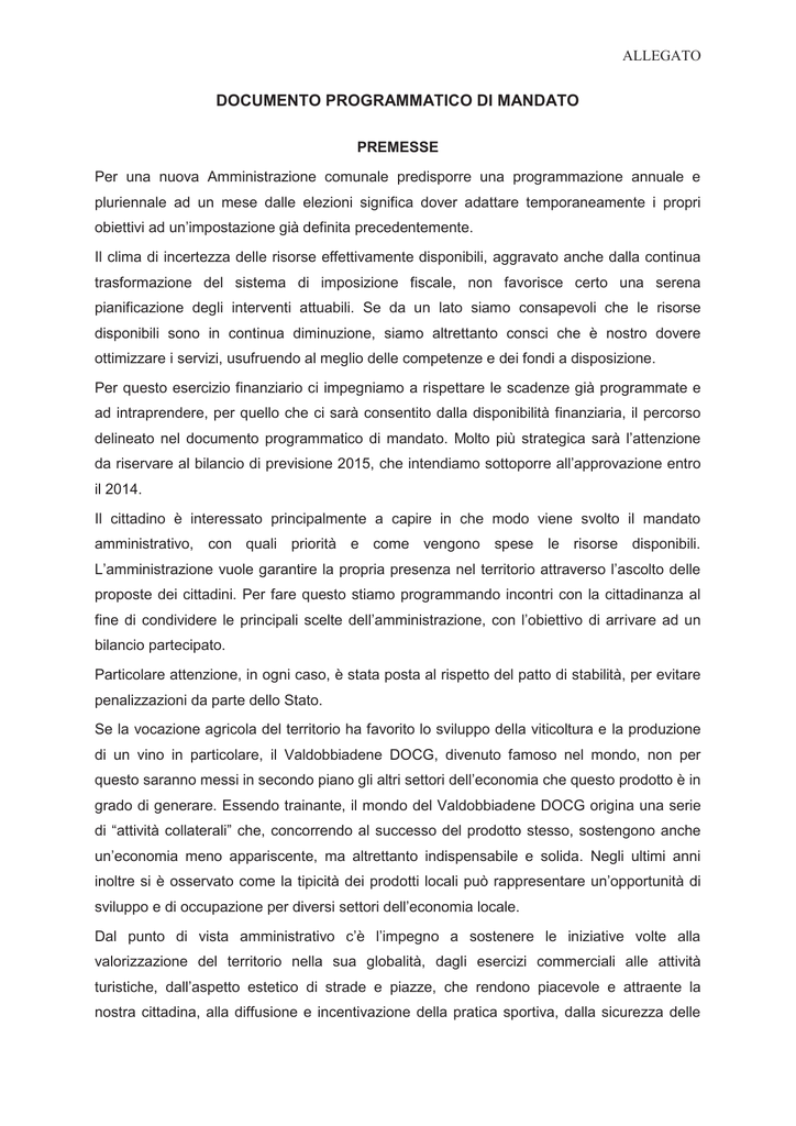 ALLEGATO DOCUMENTO PROGRAMMATICO DI MANDATO PREMESSE Per una nuova Amministrazione comunale predisporre una programmazione annuale e pluriennale ad un mese dalle elezioni significa dover adattare temporaneamente i propri obiettivi ad un’impostazione già definita precedentemente. Il clima di incertezza delle risorse effettivamente disponibili, aggravato anche dalla continua trasformazione del sistema di imposizione fiscale, non favorisce certo una serena pianificazione degli interventi attuabili. Se da un lato siamo consapevoli che le risorse disponibili sono in continua diminuzione, siamo altrettanto consci che è nostro dovere ottimizzare i servizi, usufruendo al meglio delle competenze e dei fondi a disposizione. Per questo esercizio finanziario ci impegniamo a rispettare le scadenze già programmate e ad intraprendere, per quello che ci sarà consentito dalla disponibilità finanziaria, il percorso delineato nel documento programmatico di mandato. Molto più strategica sarà l’attenzione da riservare al bilancio di previsione 2015, che intendiamo sottoporre all’approvazione entro il 2014. Il cittadino è interessato principalmente a capire in che modo viene svolto il mandato amministrativo, con quali priorità e come vengono spese le risorse disponibili. L’amministrazione vuole garantire la propria presenza nel territorio attraverso l’ascolto delle proposte dei cittadini. Per fare questo stiamo programmando incontri con la cittadinanza al fine di condividere le principali scelte dell’amministrazione, con l’obiettivo di arrivare ad un bilancio partecipato. Particolare attenzione, in ogni caso, è stata posta al rispetto del patto di stabilità, per evitare penalizzazioni da parte dello Stato. Se la vocazione agricola del territorio ha favorito lo sviluppo della viticoltura e la produzione di un vino in particolare, il Valdobbiadene DOCG, divenuto famoso nel mondo, non per questo saranno messi in secondo piano gli altri settori dell’economia che questo prodotto è in grado di generare. Essendo trainante, il mondo del Valdobbiadene DOCG origina una serie di “attività collaterali” che, concorrendo al successo del prodotto stesso, sostengono anche un’economia meno appariscente, ma altrettanto indispensabile e solida. Negli ultimi anni inoltre si è osservato come la tipicità dei prodotti locali può rappresentare un’opportunità di sviluppo e di occupazione per diversi settori dell’economia locale. Dal punto di vista amministrativo c’è l’impegno a sostenere le iniziative volte alla valorizzazione del territorio nella sua globalità, dagli esercizi commerciali alle attività turistiche, dall’aspetto estetico di strade e piazze, che rendono piacevole e attraente la nostra cittadina, alla diffusione e incentivazione della pratica sportiva, dalla sicurezza delle strade alla salubrità dell’aria. Questa terra, nella storia della sua comunità annovera una tradizione di cura del paesaggio e di accoglienza antica, che deve rinnovarsi per rendersi attuale e potersi proiettare verso il futuro. Questa amministrazione intende portare Valdobbiadene al massimo livello per la qualità di vita nel suo complesso, facendosi promotrice di comportamenti virtuosi e investendo nella cultura, nell’istruzione e nel potenziamento dei servizi ai cittadini. La razionalizzazione della spesa suggerisce di puntare sulla gestione associata dei servizi, coinvolgendo altri comuni, enti e anche partner privati per ottimizzare opere e prestazioni al minimo dei costi e per poter usufruire di finanziamenti specifici. È da tenere in considerazione anche il programma di riordino territoriale avviato da Stato e Regione, che avrà sicuramente delle ricadute sui Comuni e, più in generale, sulla gestione della cosa pubblica. I principi di efficienza, economicità e riduzione della spesa saranno perseguiti anche attraverso la modifica ed il potenziamento del sito del Comune, con il fine di consentire ai cittadini di compiere una vasta gamma di operazioni da casa, senza dover accedere personalmente agli uffici. Il Ministero per l’innovazione tecnologica concede periodicamente dei finanziamenti, che avremo cura di non perdere, agli enti che applicano nuove tecnologie. La razionalizzazione della spesa suggerisce un’attenta riorganizzazione di tutta la struttura operativa comunale, sempre puntando sull’efficacia, funzionalità e semplificazione per l’utente. Confermando e potenziando il supporto agli istituti scolastici, intendiamo favorire la diffusione dell’istruzione e della cultura, aspirando particolarmente all’espansione della conoscenza del territorio, della sua conformazione e della sua storia. Particolare attenzione sarà rivolta alla promozione di eventi culturali, sportivi e di scambio culturale in collaborazione con le scuole, nella convinzione che ogni momento aggregativo ricco di contenuti costituisca un’importante occasione nella formazione poiché fornisce conoscenze specifiche, favorisce una contaminazione di mentalità, sviluppa nuove capacità di soluzione dei problemi e affina metodi innovativi di analisi di situazioni complesse. BILANCIO TRIBUTI PATRIMONIO L’Amministrazione deve attuare un processo di analisi e valutazione degli obiettivi in relazione alle risorse disponibili e reperibili, sviluppando le linee programmatiche nell'ottica pluriennale, in funzione dell’approvazione dei relativi bilanci e dei documenti di programmazione. 2 · Entro il 31 luglio 2014 saranno approvati, in proroga, il Bilancio di Previsione 2014, il Bilancio Pluriennale 2014-2016 e i loro allegati, che tengono conto della spesa consolidata (spese correnti e di investimento), relativa agli stanziamenti già autorizzati nei prececenti documenti di programmazione. Con la proroga del termine per l’approvazione, il Bilancio di Previsione 2014 ha perso la sua validità di strumento di programmazione finanziaria del comune. · Molto più strategica sarà infatti l’attenzione da ris