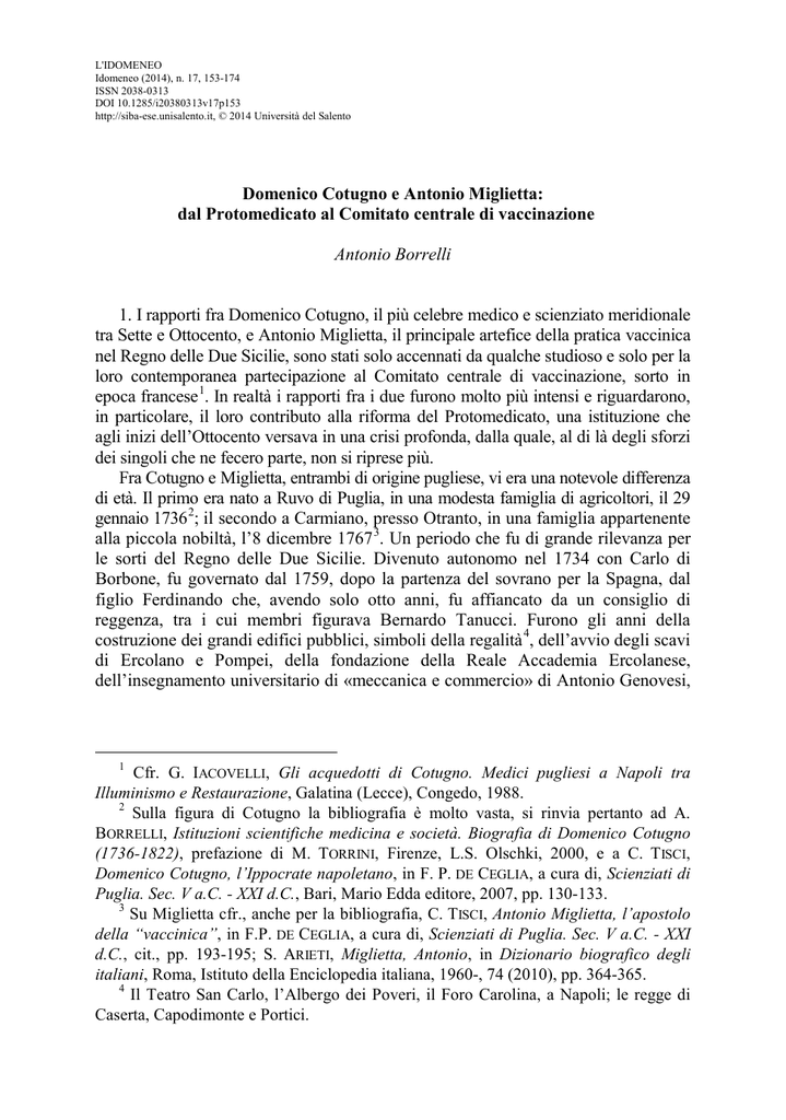 L'IDOMENEO Idomeneo (2014), n. 17, 153-174 ISSN 2038-0313 DOI 10.1285/i20380313v17p153 http://siba-ese.unisalento.it, © 2014 Università del Salento Domenico Cotugno e Antonio Miglietta: dal Protomedicato al Comitato centrale di vaccinazione Antonio Borrelli 1. I rapporti fra Domenico Cotugno, il più celebre medico e scienziato meridionale tra Sette e Ottocento, e Antonio Miglietta, il principale artefice della pratica vaccinica nel Regno delle Due Sicilie, sono stati solo accennati da qualche studioso e solo per la loro contemporanea partecipazione al Comitato centrale di vaccinazione, sorto in epoca francese 1. In realtà i rapporti fra i due furono molto più intensi e riguardarono, in particolare, il loro contributo alla riforma del Protomedicato, una istituzione che agli inizi dell’Ottocento versava in una crisi profonda, dalla quale, al di là degli sforzi dei singoli che ne fecero parte, non si riprese più. Fra Cotugno e Miglietta, entrambi di origine pugliese, vi era una notevole differenza di età. Il primo era nato a Ruvo di Puglia, in una modesta famiglia di agricoltori, il 29 gennaio 1736 2; il secondo a Carmiano, presso Otranto, in una famiglia appartenente alla piccola nobiltà, l’8 dicembre 1767 3. Un periodo che fu di grande rilevanza per le sorti del Regno delle Due Sicilie. Divenuto autonomo nel 1734 con Carlo di Borbone, fu governato dal 1759, dopo la partenza del sovrano per la Spagna, dal figlio Ferdinando che, avendo solo otto anni, fu affiancato da un consiglio di reggenza, tra i cui membri figurava Bernardo Tanucci. Furono gli anni della costruzione dei grandi edifici pubblici, simboli della regalità 4, dell’avvio degli scavi di Ercolano e Pompei, della fondazione della Reale Accademia Ercolanese, dell’insegnamento universitario di «meccanica e commercio» di Antonio Genovesi, 1 Cfr. G. IACOVELLI, Gli acquedotti di Cotugno. Medici pugliesi a Napoli tra Illuminismo e Restaurazione, Galatina (Lecce), Congedo, 1988. 2 Sulla figura di Cotugno la bibliografia è molto vasta, si rinvia pertanto ad A. BORRELLI, Istituzioni scientifiche medicina e società. Biografia di Domenico Cotugno (1736-1822), prefazione di M. TORRINI, Firenze, L.S. Olschki, 2000, e a C. TISCI, Domenico Cotugno, l’Ippocrate napoletano, in F. P. DE CEGLIA, a cura di, Scienziati di Puglia. Sec. V a.C. - XXI d.C., Bari, Mario Edda editore, 2007, pp. 130-133. 3 Su Miglietta cfr., anche per la bibliografia, C. TISCI, Antonio Miglietta, l’apostolo della “vaccinica”, in F.P. DE CEGLIA, a cura di, Scienziati di Puglia. Sec. V a.C. - XXI d.C., cit., pp. 193-195; S. ARIETI, Miglietta, Antonio, in Dizionario biografico degli italiani, Roma, Istituto della Enciclopedia italiana, 1960-, 74 (2010), pp. 364-365. 4 Il Teatro San Carlo, l’Albergo dei Poveri, il Foro Carolina, a Napoli; le regge di Caserta, Capodimonte e Portici. Antonio Borrelli della diffusione delle teorie newtoniane, delle prime discussioni sullo statuto della medicina e sul ruolo dei medici nella società 5. Dopo i primi studi presso il Seminario di Molfetta, Cotugno arrivò alla fine del 1753 a Napoli, dove visse questo clima di rinnovamento, ascoltò le lezioni di Genovesi, iniziò, dopo il conseguimento della laurea, i suoi primi esperimenti in un’angusta cameretta dell’Ospedale degl’Incurabili e dove, infine, intraprese la sua carriera scientifica e accademica. L’anno prima della nascita di Miglietta, Cotugno aveva già compiuto le sue più importanti scoperte, a cominciare da quella sugli acquedotti dell’orecchio, pubblicato le sue principali opere e ottenuto, non senza difficoltà, quantunque già famoso in Italia e all’estero, la cattedra di Anatomia. Dopo una buona preparazione a Lecce, città denominata all’epoca, per il numero e la qualità dei dotti che vi risiedevano, «l’Atene del Regno» 6, Miglietta arrivò nella capitale, probabilmente tra la fine degli anni Settanta e gli inizi degli anni Ottanta, per frequentare la Facoltà di Medicina. Uno dei suoi maestri fu proprio Cotugno, che in quegli anni, insieme a Giovanni Vivenzio, Michele Troja e Giuseppe Saverio Poli, aveva trasferito l’insegnamento medico dalle aule universitarie del Palazzo degli studi alle corsie dell’Ospedale degl’Incurabili, dove erano stati allestiti anche un Teatro anatomico e un Laboratorio di fisica sperimentale 7. Quel trasferimento era stato il naturale coronamento di quanto Cotugno aveva scritto in quel piccolo capolavoro che è il Dello spirito della medicina, l’orazione tenuta ai docenti e agli studenti degl’Incurabili nel 1772 e che costituì ben presto il manifesto della nuova medicina napoletana e, per tanti aspetti, italiana del secondo Settecento. Un testo che dovette leggere anche il giovane Miglietta, apprezzandone i risvolti pratici, l’invito ad abbandonare ogni sistema, il proclamare, senza tentennamenti, che la medicina aveva bisogno solo di «fatti», vagliati naturalmente dai lumi della ragione. Per Cotugno il medico non poteva conoscere le cause ultime dei fenomeni del corpo umano, considerato che questo tipo di domande rientravano più nelle indagini della 5 Una panoramica storico-critica delle scienze a Napoli nel periodo considerato cfr. M. TORRINI, Dagli Investiganti all’Illuminismo: scienza e società a Napoli nell’età moderna, in Storia del Mezzogiorno, IX, Aspetti e problemi del Medioevo e dell’età moderna, 2, Roma, Edizioni del Sole, 1992, pp. 603-630; in particolare per la medicina cfr. A. BORRELLI, Medicina e società a Napoli nel secondo Settecento, in «Archivio storico per le province napoletane», CXII, 1994, pp. 123-177; R. MAZZOLA, Saggi sulla cultura medica napoletana della seconda metà del Settecento, Napoli, La Città del Sole, 2009. 6 «Premurosi i genitori di fornirgli l’animo di ogni genere di ammaestramenti inviarono a profittare della istruzione di presentissimi uomini, questi si furono il Palmieri, il Briganti, il Tafuri, il de Leo, il Presta, il Moschet