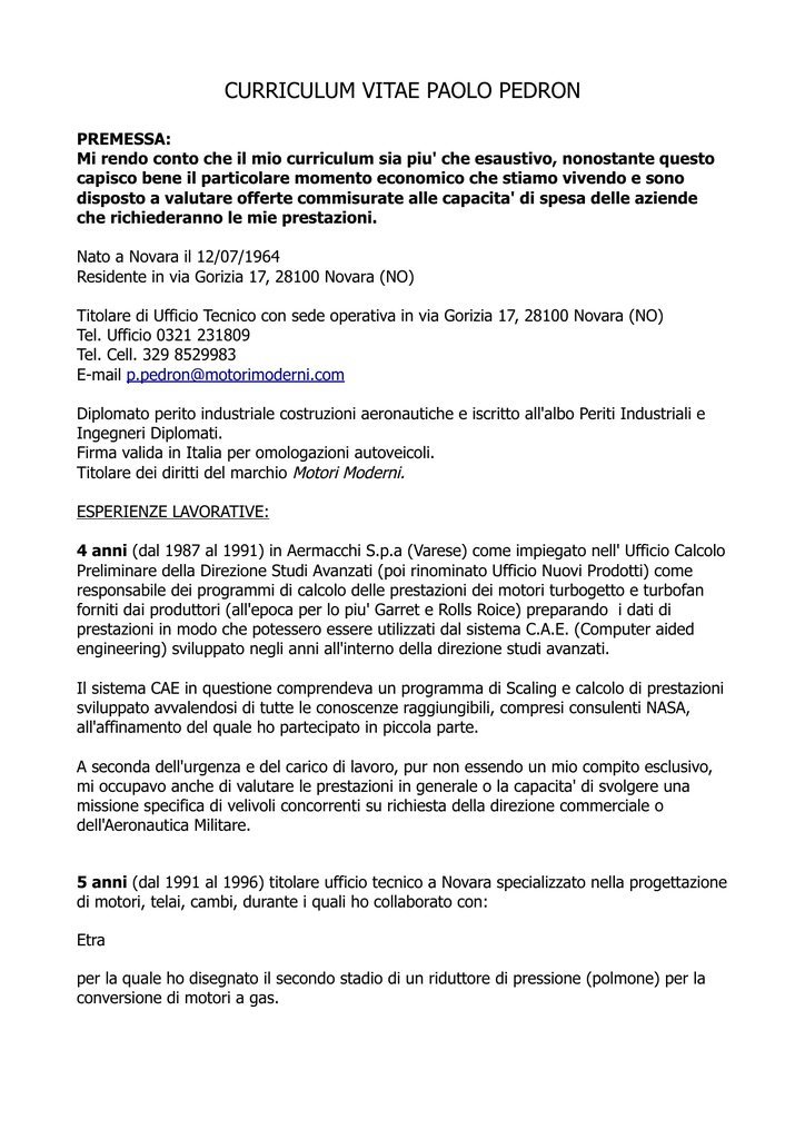 CURRICULUM VITAE PAOLO PEDRON PREMESSA: Mi rendo conto che il mio curriculum sia piu' che esaustivo, nonostante questo capisco bene il particolare momento economico che stiamo vivendo e sono disposto a valutare offerte commisurate alle capacita' di spesa delle aziende che richiederanno le mie prestazioni. Nato a Novara il 12/07/1964 Residente in via Gorizia 17, 28100 Novara (NO) Titolare di Ufficio Tecnico con sede operativa in via Gorizia 17, 28100 Novara (NO) Tel. Ufficio 0321 231809 Tel. Cell. 329 8529983 E-mail [email protected] Diplomato perito industriale costruzioni aeronautiche e iscritto all'albo Periti Industriali e Ingegneri Diplomati. Firma valida in Italia per omologazioni autoveicoli. Titolare dei diritti del marchio Motori Moderni. ESPERIENZE LAVORATIVE: 4 anni (dal 1987 al 1991) in Aermacchi S.p.a (Varese) come impiegato nell' Ufficio Calcolo Preliminare della Direzione Studi Avanzati (poi rinominato Ufficio Nuovi Prodotti) come responsabile dei programmi di calcolo delle prestazioni dei motori turbogetto e turbofan forniti dai produttori (all'epoca per lo piu' Garret e Rolls Roice) preparando i dati di prestazioni in modo che potessero essere utilizzati dal sistema C.A.E. (Computer aided engineering) sviluppato negli anni all'interno della direzione studi avanzati. Il sistema CAE in questione comprendeva un programma di Scaling e calcolo di prestazioni sviluppato avvalendosi di tutte le conoscenze raggiungibili, compresi consulenti NASA, all'affinamento del quale ho partecipato in piccola parte. A seconda dell'urgenza e del carico di lavoro, pur non essendo un mio compito esclusivo, mi occupavo anche di valutare le prestazioni in generale o la capacita' di svolgere una missione specifica di velivoli concorrenti su richiesta della direzione commerciale o dell'Aeronautica Militare. 5 anni (dal 1991 al 1996) titolare ufficio tecnico a Novara specializzato nella progettazione di motori, telai, cambi, durante i quali ho collaborato con: Etra per la quale ho disegnato il secondo stadio di un riduttore di pressione (polmone) per la conversione di motori a gas. Montecarlo Automobile per la quale presso i loro uffici di Montecarlo ho messo in tavola 'cosi' come costruito' la scocca in carbonio, il telaio centrale, i telaietti anteriore e posteriore e alcuni particolari meccanici della MCA Centenaire. (la MCA centenaire era una vettura stradale 2 posti a motore posteriore longitudinale che nella versione piu' potente montava il 12 cilindri di formula 1 prodotto dalla Motori Moderni sovralimentato con un turbocompressore per bancata.) Motori Moderni (ing. Chiti) per la quale ho svolto: attivita' di disegnazione di componenti di motori di loro produzione, attivita' di ridisegnazione di componenti meccanici di vetture storiche per le quali non erano piu' disponibili ne' ricambi ne' i disegni con i quali ricostruire i ricambi, attivita' di rilievo e disegnazione di motori concorrenti (reverse engineering) per conto di Alfa Corse eseguendo studi sul Ford Cosworth di formula 1 e su alcuni motori BMW da corsa. Cagiva Motorcycles per la quale ho disegnato: due motori modulari 4 valvole per cilindro, monocilindrico 125 cc l'uno, bicilindrico a 'L' 250 cc l'altro con i relativi cambi di velocita', Una testata 4 valvole reffreddata a aria per il loro motore 650 cc monocilindrico e alcuni particolari minori della ciclistica. Nando Groppo Aviazione Ultraleggera per cui ho disegnato il velivolo ultraleggero Groppino (un 3 assi tubi e tela), una parte consistente dei velivoli Slip (un trike ripiegabile) e Dui (un velivolo ultraleggero a ala alta ripiegabile. Vittorio Ghidella ed Associati per cui ho svolto alle dirette dipendenze dell' ing. Ghidella attivita' di progettazione ancora coperte dal segreto industriale. Fingef (Giorgio Falck) per la quale ho preparato la stesura della documentazione tecnica per il brevetto di un sistema di distribuzione a fodero rotante per motori a 4 tempi, suggerendo alcune soluzioni tecniche. Inoltre poiche' in quel momento stavo valutando la possibilita' di avviare una produzione di particolari meccanici in Albania ho fatto realizzare presso l'husina Henver di Tirana, con mia supervisione sul posto, i modelli di fonderia per il motore sperimentale. Degan Engineering. Per la quale ho disegnato una macchina per la produzione di cerotti. Inoltre ho brevettato un riduttore di pressione monostadio per alimentazione a gas di motori. Quando nel 1991 l'ho proposto agli uffici tecnici dei produttori nazionali non e' stato giudicato interessante. Qualche anno dopo la BRC ha messo in produzione un sistema rivoluzionario basato su un riduttore di pressione monostadio simile al mio. 1 anno (1997) disegnatore progettista per una ditta specializzata nella produzione di lavatrici industriali e impianti di finitura su commessa. 4 anni (dal 1998 al 2001) da unico disegnatore progettista presso Cofimco S.p.a. di Pombia (Novara) terzo produttore mondiale di ventilatori industriali assiali di grande diametro (fino a 12 metri). In questo periodo ho standardizzato la produzione riducendo i costi e collaborato alla progettazione di 2 nuove famiglie di ventilatori a pale elastiche poco sensibili alla risonanza. Ho anche ottenuto ottimi risultati nella disegnazione di pale finalizzate alla riduzione del rumore. Nel 2001 ho disegnato una vettura da competizione 'barchetta' con scocca e carrozzeria in carbonio destinata a un campionato monomarca per conto di Pierluigi Corbari che all'epoca aveva in gestione il campionato Euro3000. Anche se la vettura per il campionato monomarca doveva essere equipaggiata con gruppo motore/cambio della Renault clio Rs tutta la progettazione era stata fatta in vista di una rimotorizzazione da definire per correre la 24 ore di le mans e rispettava il regolamento dell'epoca. Presentai di persona i disegni all'ing. Cadringher (FIA) a Montecarlo. I disegni furono accettati e sulla base dei miei disegni venne avvallato il campionato monomarca. Quando il progetto '