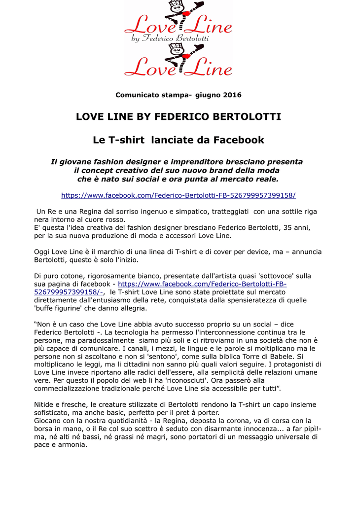 Comunicato stampa- giugno 2016 LOVE LINE BY FEDERICO BERTOLOTTI Le T-shirt lanciate da Facebook Il giovane fashion designer e imprenditore bresciano presenta il concept creativo del suo nuovo brand della moda che è nato sui social e ora punta al mercato reale. https://www.facebook.com/Federico-Bertolotti-FB-526799957399158/ Un Re e una Regina dal sorriso ingenuo e simpatico, tratteggiati con una sottile riga nera intorno al cuore rosso. E' questa l'idea creativa del fashion designer bresciano Federico Bertolotti, 35 anni, per la sua nuova produzione di moda e accessori Love Line. Oggi Love Line è il marchio di una linea di T-shirt e di cover per device, ma – annuncia Bertolotti, questo è solo l'inizio. Di puro cotone, rigorosamente bianco, presentate dall'artista quasi 'sottovoce' sulla sua pagina di facebook - https://www.facebook.com/Federico-Bertolotti-FB526799957399158/-, le T-shirt Love Line sono state proiettate sul mercato direttamente dall'entusiasmo della rete, conquistata dalla spensieratezza di quelle 'buffe figurine' che danno allegria. “Non è un caso che Love Line abbia avuto successo proprio su un social – dice Federico Bertolotti -. La tecnologia ha permesso l'interconnessione continua tra le persone, ma paradossalmente siamo più soli e ci ritroviamo in una società che non è più capace di comunicare. I canali, i mezzi, le lingue e le parole si moltiplicano ma le persone non si ascoltano e non si 'sentono', come sulla biblica Torre di Babele. Si moltiplicano le leggi, ma li cittadini non sanno più quali valori seguire. I protagonisti di Love Line invece riportano alle radici dell'essere, alla semplicità delle relazioni umane vere. Per questo il popolo del web li ha 'riconosciuti'. Ora passerò alla commecializzazione tradizionale perché Love Line sia accessibile per tutti”. Nitide e fresche, le creature stilizzate di Bertolotti rendono la T-shirt un capo insieme sofisticato, ma anche basic, perfetto per il pret à porter. Giocano con la nostra quotidianità - la Regina, deposta la corona, va di corsa con la borsa in mano, o il Re col suo scettro è seduto con disarmante innocenza... a far pipì!ma, né alti né bassi, né grassi né magri, sono portatori di un messaggio universale di pace e armonia. Consentonro di giocare anche con lo stile, suggerendo abbinamenti classici, 'maglietta e jeans', ma anche inventivi e un po' fantastici, per esempio sotto lo smoking o in versione abito da sposa. “La linea nera di Love Line non pone vincoli – spiega Federico, - perché non ha un senso, è solo una direzione da seguire senza meta, con gioia”. Bertolotti, anche pittore, illustratore, regista e direttore artistico di teatro, la vocazione alla rappresentazione l'ha nel DNA, provenendo dalla stirpe del commediografo Nino Martoglio, mitico direttore della Medusa Film. “Love Line nasce poi dalla mia personale ricerca della felicità o di un antidoto alle sofferenze che l'esistenza comporta - conclude -. Ho seguito un percorso, da Jodorovsky alle nuove tecniche di meditazione del Theta Healing e tutt'ora mi sento in movimento. Panta rei, come predicava il greco Eraclito, ma in un equilibrio divino dove qualunque cosa ha un suo opposto, nessuna cosa può essere completamente yin o completamente yang e per questo lo yin e lo yang sono interdipendenti, l'uno non può esistere senza l'altro, come King Line e Qeen Line”. Per acquistare Love Line: www.coquelicotdesign.com T-shirt disponibili nelle taglie S -M- L- XL- XXL. Child line da 1/2 anni fino ai 14 anni. Costi a partire da € 45 Cover: € 20 Ufficio stampa Gruppo Areté email [email protected] tel. 0233004397 mob. 3494330142
