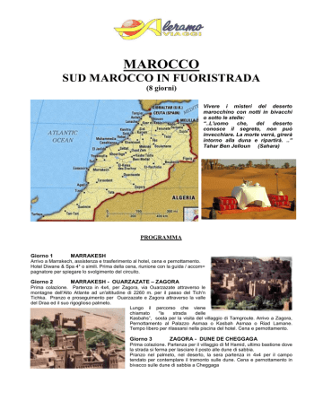 MAROCCO SUD MAROCCO IN FUORISTRADA (8 giorni) Vivere i misteri del deserto marocchino con notti in bivacchi o sotto le stelle: “..L'uomo che, del deserto conosce il segreto, non può invecchiare. La morte verrà, girerà intorno alla duna e ripartirà. ..” Tahar Ben Jelloun (Sahara) PROGRAMMA Giorno 1 MARRAKESH Arrivo a Marrakech, assistenza e trasferimento al hotel, cena e pernottamento. Hotel Diwane & Spa 4* o simili. Prima della cena, riunione con la guida / accom= pagnatore per spiegare lo svolgimento del circuito. Giorno 2 MARRAKESH - OUARZAZATE – ZAGORA Prima colazione. Partenza in 4x4, per Zagora, via Ouarzazate attraverso le montagne dell'Alto Atlante ad un'altitudine di 2260 m. per il passo del Tich'n Tichka. Pranzo e proseguimento per Ouarzazate e Zagora attraverso la valle del Draa ed il suo rigoglioso palmeto. Lungo il percorso che viene chiamato “la strada delle Kasbahs”, sosta per la visita del villaggio di Tamgroute. Arrivo a Zagora, Pernottamento al Palazzo Asmaa o Kasbah Asmaa o Riad Lamane. Tempo libero per rilassarsi nella piscina del hotel. Cena e pernottamento. Giorno 3 ZAGORA - DUNE DE CHEGGAGA Prima colazione. Partenza per il villaggio di M Hamid, ultimo bastione dove la strada si ferma per lasciare il posto alle dune di sabbia. Pranzo nel palmeto, nel deserto, la sera partenza in 4x4 per il campo tendato per contemplare il tramonto sulle dune. Cena e pernottamento in bivacco sulle dune di sabbia a Cheggaga Giorno 4 CHEGGAGA – DUNE DE MERZOUGA Prima colazione. Partenza in 4x4 per Rissani, e per Merzouga percorrendo il tracciato della Paris/Dakar. Pranzo a pic nic. Escursione di 2 ore nei dintorni delle dune a schiena di Méhari per contemplare il tramonto, cena folcloristica e pernottamento in bivacco a Merzouga Giorno 5 MERZOUGA - GOLE DEL TODRA Prima colazione. Partenza verso Tinghir, via Alnif, visita delle Kasbahs lungo la strada, le imponenti rovine del palazzo Abbar, visita del Museo del Sahara ed arrivo alle gole del Todra, Pranzo e visita delle gole, la sera ritorno a Tanghi per la cena e pernottamento al Riad Agrew o similare. Giorno 6 TINGHIR- KELAA - OUARZAZATE Prima colazione. Partenza per Ouarzazate, percorrendo la Valle delle Rose e la strada delle Mille Kasbah. Visita del palmeto di Skoura prima di arrivare a Ouarzazate, famosa in Marocco per i suoi studi cinematografici dove sono stati girati molti grandi film. Pranzo. Tempo a disposizione, cena e pernottamento Hotel Perle du Sud 3*A.. In questa località ha origine la nuova Hollywood marocchina. Il primo a scoprirne il fascino esotico fu il regista Joseph von Sternberg, che vi ambientò Morocco, pellicola cult in bianco e nero con una conturbante Marlène Dietrich, consacrando così questa regione di casbah millenarie e oasi rigogliose alle porte del deserto, location ideale per kolossal a sfondo storico. E nei dintorni non si contano le oasi e i villaggi diventati dépendance temporanee degli studios. In fondo, perché mai costruire palazzi e città di cartone quando si hanno a disposizione decine di locations più vere del vero? Vedi per esempio la casbah di Ait-Ben-Haddou, la più famosa delle antiche cittadelle fortificate d'argilla costruite secoli fa dalle popolazioni berbere del grande sud marocchino per difendersi dalle scorrerie dei predoni del deserto. Difficile immaginare scenografia più suggestiva di questo labirinto di terra rossa cotta al sole addossato a una collina da cui svettano palme e torrette merlate. Orson Wells la trovò infatti perfetta come sfondo per il suo film Sodoma e Gomorra. Arrivarono in seguito anche le troupe di Lawrence d'Arabia, dell'Ultima Tentazione di Cristo e de Il The nel Deserto. Insomma, è il caso di dirlo, una location da Oscar, anche se ormai praticamente abbandonata, ma che intanto si è aggiudicata l'inserimento nel Patrimonio dell'Umanità dell'Unesco. Giorno 7 QUARZAZATE - KASBAH AIT BEN HADDOU – MARRAKESH Prima colazione. Dopo una breve visita della Kasbah Ait Benhaddou, classificata patrimonio culturale dell'umanità per l'Unesco, e sede di parecchi set cinematografici, partenza per Marrakech. Pranzo libero in corso di viaggio. Arrivo e sistemazione in hotel. Tempo libero. In serata cena tradizionale sotto tende beduine con canti e danze folcloristiche. Giorno 8 MARRAKESH - PARTENZA Dopo la prima colazione, trasferimento all'aeroporto per il volo del ritorno e fine dei nostri servizi. PARTENZE GARANTITE . minimo 6 partecipanti 1.mo e 3.zo sabato del mese QUOTA DI PARTECIPAZIONE Per persona in camera doppia Supplemento (base 4 persone) Supplemento (base 2 persone) Supplemento camera singola Notte supplementare a Marrakesh Supplemento singola notte extra a Marrakesh (hotel Ryad Dar Ambre Luxe) 620,00 35,00 95,00 195,00 85,00 75,00 LA QUOTA COMPRENDE Trasferimenti da/per l’ aeroporto Il circuito in 4X4 con autista guida parlante italiano Sistemazione in hotel, Ryad in camera doppia 2 notti in bivacchi (tende beduine biposto con servizi I pasti (escluso il pranzo del 7° giorno) Assistenza nostro corrispondente in Marocco LA QUOTA NON COMPRENDE Trasporto aereo internazionale e tasse aeroportuali Pranzo del 7.mo giorno Mance, bevande, extra in genere Assicurazione annullamento e medico-bagaglio (OBBLIGATORIA) .