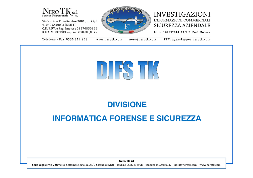 DIVISIONE INFORMATICA FORENSE E SICUREZZA Nero TK srl Sede Legale: Via Vittime 11 Settembre 2001 n. 25/L, Sassuolo (MO) – Tel/Fax: 0536.812958 – Mobile: 340.4950337 – [email protected] – www.nerotk.com Divisione Informatica Forense e Sicurezza DIFS La Divisione Informatica Forense e Sicurezza (DIFS) dell'Agenzia Nero TK srl, avvalendosi di un team di esperti, offre servizi che coprono aree d'intervento nel settore dell'Information Technology, tra cui sicurezza informatica aziendale, indagini informatiche, analisi informatica forense e compliance aziendale. I servizi offerti sono altamente strutturati e specializzati, rivolti principalmente ad Aziende e Studi Legali. L'approccio pratico si basa su tre concetti principali. PIANIFICAZIONE ORGANIZZAZIONE AZIONE Questa metodologia consolidata permette di rispondere alle esigenze del Cliente in modo tempestivo ed esaustivo. Nero TK srl Sede Legale: Via Vittime 11 Settembre 2001 n. 25/L, Sassuolo (MO) – Tel/Fax: 0536.812958 – Mobile: 340.4950337 – [email protected] – www.nerotk.com SICUREZZA AZIENDALE I servizi offerti in questo ambito riguardano l'infrastruttura, gli strumenti e i processi aziendali. L'analisi dei sistemi informativi si basa su un approccio che consente di tenere in considerazione le necessità delle tre aree IT: tecnica (installazione, configurazione), organizzativa (mantenimento, gestione, utilizzo) e manageriale (project management: value for money, cost effective). IT MANAGEMENT IT OPERATIONAL IT TECHNICAL L'analisi top-down permette di identificare gli asset da proteggere in modo da creare un piano di sicurezza aziendale e definire le procedure necessarie alla sua attuazione. L'analisi bottom-up fa emergere eventuali problemi o criticità nei sistemi e nelle procedure aziendali, portando all'adozione di contromisure immediate. Nelle pagine che seguono si riportano i Servizi specifici che il Cliente potrà scegliere. E’ comunque possibile, in base al perimetro di intervento, creare un pacchetto personalizzato. Nero TK srl Sede Legale: Via Vittime 11 Settembre 2001 n. 25/L, Sassuolo (MO) – Tel/Fax: 0536.812958 – Mobile: 340.4950337 – [email protected] – www.nerotk.com Scansione di Sicurezza Il servizio prevede l’individuazione e la descrizione dei sistemi informativi utilizzati dal Cliente. Tale attività è necessaria per fornire un quadro esauriente sul livello di sicurezza delle infrastrutture e per studiare un piano di intervento mirato a risolvere le eventuali criticità. Al Cliente sarà fornito un report con la classificazione per indice di rischio delle vulnerabilità riscontrate. Network scan and discovery Application and system fingerprint Report and presentation Nero TK srl Sede Legale: Via Vittime 11 Settembre 2001 n. 25/L, Sassuolo (MO) – Tel/Fax: 0536.812958 – Mobile: 340.4950337 – [email protected] – www.nerotk.com Sicurezza attiva dei sistemi Il servizio prevede varie tipologie di analisi attive: il Cliente potrà scegliere quelle più adatte alla situazione del suo sistema informativo. L’obiettivo è entrare nel dettaglio delle criticità riscontrate, tramite la messa in atto di scenari di attacco complessi: ciò consentirà di valutare l’effettivo indice di rischio. Le azioni di attacco interesseranno la rete interna dell’Azienda e il perimetro esterno, seguendo un indice crescente di ampiezza e profondità dei test case. In base al report di fine attività, l’Azienda sarà affiancata nell’individuazione di azioni correttive. Infrastructure fingerprint Vulnerability assessment Network penetration test Wireless penetration test Web application penetration test Social engineering Remediation Detailed report and presentation Nero TK srl Sede Legale: Via Vittime 11 Settembre 2001 n. 25/L, Sassuolo (MO) – Tel/Fax: 0536.812958 – Mobile: 340.4950337 – [email protected] – www.nerotk.com Sicurezza passiva dei sistemi Il servizio prevede la cattura del traffico di rete, relativo al segmento aziendale sul quale si intende operare. I dati, raccolti in Azienda tramite l’utilizzo di tecnologie poco invasive e nell’assoluto rispetto della privacy, verranno analizzati ed evidenziati nel report finale. Il Cliente sarà quindi informato sul traffico effettuato, su host compromessi, su comportamenti non ammessi dalle policy aziendali. Traffic capture Traffic classification Deep packet inspection Data extraction IP reputation Detailed report and presentation Nero TK srl Sede Legale: Via Vittime 11 Settembre 2001 n. 25/L, Sassuolo (MO) – Tel/Fax: 0536.812958 – Mobile: 340.4950337 – [email protected] – www.nerotk.com Valutazione e mitigazione del rischio Individuate le vulnerabilità che mettono in pericolo il sistema informativo, bisogna intraprendere azioni correttive per mitigare i rischi. Il primo passo è l’individuazione delle risorse mission-critical da proteggere, per poi definire la priorità degli interventi. Al Cliente saranno proposte le soluzioni più efficaci per il potenziamento della sicurezza dei processi aziendali e dei sistemi informativi coinvolti. Analysis Infrastructure review Process review IT internal audit review Remediation Mitigation Detailed report and presentation Nero TK srl Sede Legale: Via Vittime 11 Settembre 2001 n. 25/L, Sassuolo (MO) – Tel/Fax: 0536.812958 – Mobile: 340.4950337 – [email protected] – www.nerotk.com Alert Il servizio intende fornire all’azienda indicazioni utili a contrastare attacchi e minacce, che nei sistemi informatici sono in continua evoluzione. Anche siti internet, IP e indirizzi email corrono il rischio di subire manomissioni o compromissioni da parte di malintenzionati a scapito dell’immagine aziendale. Alert è un’attività preventiva di Cyber Intelligence basata sul monitoraggio delle risorse informatiche e sul reperimento, da più sorgenti, di informazioni in merito alle vulnerabilità emergenti e alle nuove tecniche di attacco. Le informazioni vengono aggregate e classificate, in base