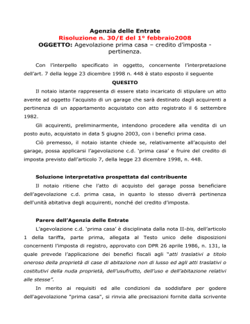Agenzia delle Entrate Risoluzione n. 30/E del 1° febbraio2008 OGGETTO: Agevolazione prima casa – credito d’imposta pertinenza. Con l’interpello specificato in oggetto, concernente l’interpretazione dell’art. 7 della legge 23 dicembre 1998 n. 448 è stato esposto il seguente QUESITO Il notaio istante rappresenta di essere stato incaricato di stipulare un atto avente ad oggetto l’acquisto di un garage che sarà destinato dagli acquirenti a pertinenza di un appartamento acquistato con atto registrato il 6 settembre 1982. Gli acquirenti, preliminarmente, intendono procedere alla vendita di un posto auto, acquistato in data 5 giugno 2003, con i benefici prima casa. Ciò premesso, il notaio istante chiede se, relativamente all’acquisto del garage, possa applicarsi l’agevolazione c.d. ‘prima casa’ e fruire del credito di imposta previsto dall’articolo 7, della legge 23 dicembre 1998, n. 448. Soluzione interpretativa prospettata dal contribuente Il notaio ritiene che l’atto di acquisto del garage possa beneficiare dell’agevolazione c.d. prima casa, in quanto lo stesso diverrà pertinenza dell'unità abitativa degli acquirenti, nonché del credito d’imposta. Parere dell’Agenzia delle Entrate L’agevolazione c.d. ‘prima casa’ è disciplinata dalla nota II-bis, dell’articolo 1 della tariffa, parte prima, allegata al Testo unico delle disposizioni concernenti l’imposta di registro, approvato con DPR 26 aprile 1986, n. 131, la quale prevede l’applicazione dei benefici fiscali agli “atti traslativi a titolo oneroso della proprietà di case di abitazione non di lusso ed agli atti traslativi o costitutivi della nuda proprietà, dell’usufrutto, dell’uso e dell’abitazione relativi alle stesse”. In merito ai requisiti ed alle condizioni da soddisfare per godere dell'agevolazione "prima casa", si rinvia alle precisazioni fornite dalla scrivente nei documenti di prassi amministrativa (consultabili nel sito www.agenziaentrate.it), con particolare riferimento alle circolari 1 marzo 2001, n. 19 e 12 agosto 2005, n. 38. Atteso ciò, si osserva che il comma 3 della nota II-bis stabilisce, altresì, che: “ Le agevolazioni di cui al comma 1, sussistendo le condizioni di cui alle lettere a), b) e c) del medesimo comma 1, spettano per l'acquisto, anche se con atto separato, delle pertinenze dell'immobile di cui alla lettera a). Sono ricomprese tra le pertinenze, limitatamente ad una per ciascuna categoria, le unità immobiliari classificate o classificabili nelle categorie catastali C/2, C/6 e C/7, che siano destinate a servizio della casa di abitazione oggetto dell'acquisto agevolato (...)." 3 Il successivo comma 4 prevede che: “In caso di dichiarazione mendace, o di trasferimento per atto a titolo oneroso o gratuito degli immobili acquistati con i benefici di cui al presente articolo prima del decorso del termine di cinque anni dalla data del loro acquisto, sono dovute le imposte di registro, ipotecaria e catastale nella misura ordinaria, nonché una sovrattassa pari al 30 per cento delle stesse imposte. Se si tratta di cessioni soggette all’imposta sul valore aggiunto, l’ufficio dell’Agenzia delle entrate presso cui sono stati registrati i relativi atti deve recuperare nei confronti degli acquirenti la differenza fra l'imposta calcolata in base all'aliquota applicabile in assenza di agevolazioni e quella risultante dall'applicazione dell'aliquota agevolata, nonché irrogare la sanzione amministrativa, pari al 30 per cento della differenza medesima. Sono dovuti gli interessi di mora di cui al comma 4 dell'articolo 55 del presente testo unico. Le predette disposizioni non si applicano nel caso in cui il contribuente, entro un anno dall'alienazione dell'immobile acquistato con i benefici di cui al presente articolo, proceda all'acquisto di altro immobile da adibire a propria abitazione principale.” Infine, l’articolo 7, comma 1, della legge 23 dicembre 1998, n. 448, dispone che: "Ai contribuenti che provvedono ad acquisire, a qualsiasi titolo, entro un anno dall'alienazione dell'immobile per il quale si è fruito dell'aliquota agevolata prevista ai fini dell'imposta di registro e dell'imposta sul valore aggiunto per la prima casa, un'altra casa di abitazione non di lusso, in presenza delle condizioni di cui alla nota II-bis all'articolo 1 della tariffa, parte I, allegata al testo unico delle disposizioni concernenti l'imposta di registro, approvato con decreto del Presidente della Repubblica 26 aprile 1986, n. 131, è attribuito un credito d'imposta fino a concorrenza dell'imposta di registro o dell'imposta sul valore aggiunto corrisposta in relazione al precedente acquisto agevolato. L'ammontare del credito non può essere superiore, in ogni caso, all'imposta di registro o all'imposta sul valore aggiunto dovuta per l'acquisto agevolato della nuova casa di abitazione non di lusso(...).” 4 Dalla ricostruzione normativa operata emerge che il regime agevolativo cd. "prima casa" può essere applicato, ricorrendone le condizioni, all'atto di acquisto di case di abitazioni non di lusso ed alle relative pertinenze, anche se acquistate con atto separato. Il trasferimento dell'immobile acquistato con le predette agevolazioni, prima del decorso di cinque anni dalla data dell'atto, comporta la decadenza dal regime di favore fruito. La decadenza dal beneficio non opera qualora, entro un anno dall'alienazione effettuata nel quinquennio, si proceda all'acquisto di un altro immobile da adibire a propria abitazione principale (comma 4 della citata nota II-bis). Inoltre, in forza della disposizione recata dall'art. 7 della legge n. 448 del 1998, viene riconosciuto un credito d'imposta qualora, entro un anno dall'alienazione dell'immobile acquistato fruendo dell'agevolazione "prima casa", venga acquistata un'altra casa di abitazione non di lusso, beneficiando dello stesso regime di favore. Si evidenzia, in proposito, che, sia in ordine alla conferma dell'agevolazione 