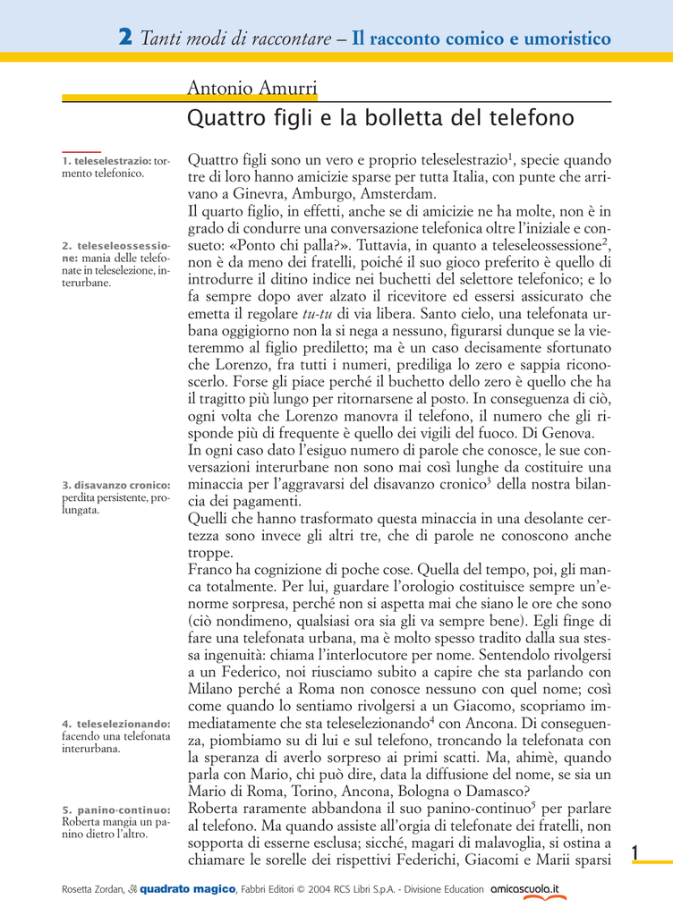 2 Tanti modi di raccontare – Il racconto comico e umoristico Antonio Amurri Quattro figli e la bolletta del telefono 1. teleselestrazio: tor- mento telefonico. 2. teleseleossessione: mania delle telefo- nate in teleselezione, interurbane. 3. disavanzo cronico: perdita persistente, prolungata. 4. teleselezionando: facendo una telefonata interurbana. 5. panino-continuo: Roberta mangia un panino dietro l’altro. Quattro figli sono un vero e proprio teleselestrazio1, specie quando tre di loro hanno amicizie sparse per tutta Italia, con punte che arrivano a Ginevra, Amburgo, Amsterdam. Il quarto figlio, in effetti, anche se di amicizie ne ha molte, non è in grado di condurre una conversazione telefonica oltre l’iniziale e consueto: «Ponto chi palla?». Tuttavia, in quanto a teleseleossessione 2, non è da meno dei fratelli, poiché il suo gioco preferito è quello di introdurre il ditino indice nei buchetti del selettore telefonico; e lo fa sempre dopo aver alzato il ricevitore ed essersi assicurato che emetta il regolare tu-tu di via libera. Santo cielo, una telefonata urbana oggigiorno non la si nega a nessuno, figurarsi dunque se la vieteremmo al figlio prediletto; ma è un caso decisamente sfortunato che Lorenzo, fra tutti i numeri, prediliga lo zero e sappia riconoscerlo. Forse gli piace perché il buchetto dello zero è quello che ha il tragitto più lungo per ritornarsene al posto. In conseguenza di ciò, ogni volta che Lorenzo manovra il telefono, il numero che gli risponde più di frequente è quello dei vigili del fuoco. Di Genova. In ogni caso dato l’esiguo numero di parole che conosce, le sue conversazioni interurbane non sono mai così lunghe da costituire una minaccia per l’aggravarsi del disavanzo cronico3 della nostra bilancia dei pagamenti. Quelli che hanno trasformato questa minaccia in una desolante certezza sono invece gli altri tre, che di parole ne conoscono anche troppe. Franco ha cognizione di poche cose. Quella del tempo, poi, gli manca totalmente. Per lui, guardare l’orologio costituisce sempre un’enorme sorpresa, perché non si aspetta mai che siano le ore che sono (ciò nondimeno, qualsiasi ora sia gli va sempre bene). Egli finge di fare una telefonata urbana, ma è molto spesso tradito dalla sua stessa ingenuità: chiama l’interlocutore per nome. Sentendolo rivolgersi a un Federico, noi riusciamo subito a capire che sta parlando con Milano perché a Roma non conosce nessuno con quel nome; così come quando lo sentiamo rivolgersi a un Giacomo, scopriamo immediatamente che sta teleselezionando4 con Ancona. Di conseguenza, piombiamo su di lui e sul telefono, troncando la telefonata con la speranza di averlo sorpreso ai primi scatti. Ma, ahimè, quando parla con Mario, chi può dire, data la diffusione del nome, se sia un Mario di Roma, Torino, Ancona, Bologna o Damasco? Roberta raramente abbandona il suo panino-continuo5 per parlare al telefono. Ma quando assiste all’orgia di telefonate dei fratelli, non sopporta di esserne esclusa; sicché, magari di malavoglia, si ostina a chiamare le sorelle dei rispettivi Federichi, Giacomi e Marii sparsi Rosetta Zordan, Il quadrato magico, Fabbri Editori © 2004 RCS Libri S.p.A. - Divisione Education 1 2 Tanti modi di raccontare – Il racconto comico e umoristico 6. ventilata: prospet- tata. 7. Sip: vecchia deno- minazione della Telecom. 8. di soppiatto: di nascosto. per l’Italia, con le quali a fatica riesce a far procedere una conversazione, che non interrompe finché il suo desiderio d’uguaglianza con i fratelli non sia stato placato da almeno venti scatti. Devo però ammettere che la mia ventilata6 nomina a Presidente e Comproprietario della Sip7, se varrà, la dovrò quasi completamente a Valentina, per la quale l’uso della teleselezione è ormai una regola talmente acquisita che la ragazza s’è ridotta a far di soppiatto8 solamente le rare telefonate urbane. La ragione di ciò va ricercata nel fatto che la fanciulla ha un flirt nel capoluogo delle Marche. Valentina, perciò, più attenta ai battiti del suo cuore che agli scatti della teleselezione, vive praticamente col telefono in mano, in linea diretta col suo ragazzo. Ho tentato più volte di stabilire che, essendo l’amore un sentimento reciproco, non sarebbe offensivo per noi se, un giorno sì e uno no, fosse il ragazzo a chiamare. Ma pare che suo padre sia di carattere tutt’altro che permissivo, e sappia a quali cifre possano arrivare, se stuzzicati, i contatori telefonici. Che cosa abbiano da raccontarsi i due colombi di così chilometrico non m’è ancora riuscito di capire. Molto spesso non si dicono niente. Evidentemente li appaga la sensazione di sentirsi uniti da un filo. Tacciono. Il che sarebbe molto romantico se il loro silenzio non fosse rotto dall’inarrestabile martellare degli scatti. E io penso al tempo in cui la teleseletentazione non c’era, quando la voce della telefonista che chiedeva: «Raddoppia?», ci dava un certo senso di colpa. Ora il benevolo avvertimento non c’è più; non puoi rubare un minuto per i saluti, non puoi inventarti che non si sente niente per ottenere gratis un supplemento di altri tre minuti di conversazione. Un freddo e distante congegno, obbedendo a impulsi elettronici, spara scatti come colpi di mitraglia al tuo petto. E tu, per difenderti, erigi contro i figli e la Sip il baluardo del lucchetto. Ebbene, è appunto quel che ho fatto anch’io, tre mesi fa. Ma l’importo della bolletta, arrivata ieri, non è calato nelle decine e tanto meno nelle centinaia di migliaia. Esso è tale che non sembra riferirsi al noleggio, ma all’acquisto di un’intera rete telefonica, immobili compresi. E so anche il perché. Ho scoperto che i miei figli si fanno prestare il telefono da un amico. Dopotutto, staccare e infilare una spina non è poi così faticoso. (da Famiglia a carico, Mondadori, Milano, rid.) 2 Rosetta Zordan, Il quadrato magico, Fabbri Editori © 2004 RCS Libri S.p.A. - Divisione Educati