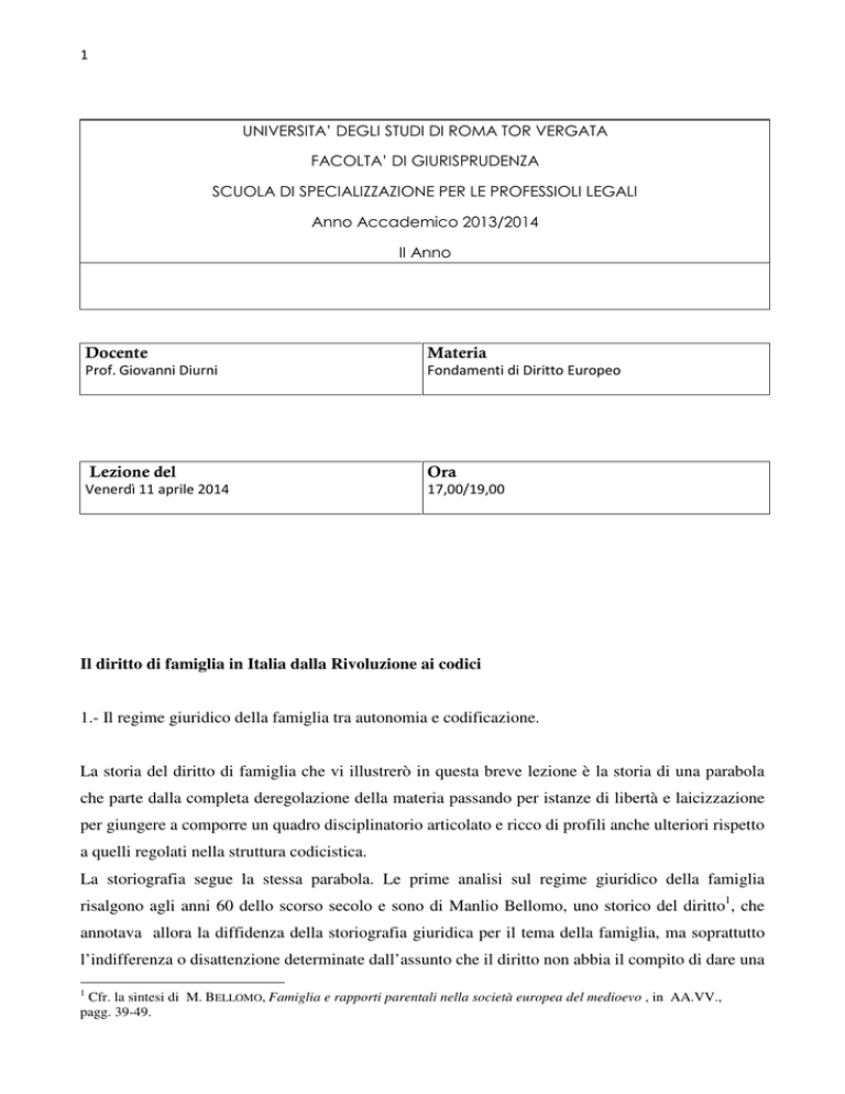 Docente Materia Lezione del Ora Il diritto di famiglia in Italia dalla