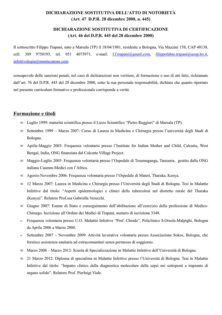 DICHIARAZIONE SOSTITUTIVA DELL’ATTO DI NOTORIETÀ (Art. 47 D.P.R. 28 dicembre 2000, n. 445) DICHIARAZIONE SOSTITUTIVA DI CERTIFICAZIONE (Art. 46 del D.P.R. 445 del 28 dicembre 2000) Il sottoscritto Filippo Trapani, nato a Marsala (TP) il 18/04/1981, residente a Bologna, Via Mazzini 158, CAP 40138, cell. 389 9750195, tel. 051 4075971, e-mail: [email protected], [email protected], [email protected] consapevole delle sanzioni penali, nel caso di dichiarazioni non veritiere, di formazione o uso di atti falsi, richiamate dall’art. 76 del D.P.R. 445 del 28 dicembre 2000, sotto la sua personale responsabilità, dichiara che quanto riportato nel presente curriculum formativo e professionale corrisponde a verità. Formazione e titoli • Luglio 1999: maturità scientifica presso il Liceo Scientifico “Pietro Ruggieri” di Marsala (TP). • Settembre 1999 – Marzo 2007: Corso di Laurea in Medicina e Chirurgia presso l’università degli Studi di Bologna. • Aprile-Maggio 2003: Frequenza volontaria presso l’Institute for Indian Mother and Child, Calcutta, West Bengal, India, ONG finanziata dal Calcutta Village Project. • Maggio-Luglio 2005: Frequenza volontaria presso l’Ospedale di Tosamaganga, Tanzania, gestito dalla ONG italiana Cuamm-Medici con l’Africa. • Agosto-Novembre 2006: Frequenza volontaria presso l’Ospedale di Materi, Tharaka, Kenya. • 12 Marzo 2007: Laurea in Medicina e Chirurgia presso l’Università degli Studi di Bologna. Tesi in Malattie Infettive dal titolo: “Aspetti epidemiologici e clinici della tubercolosi nel distretto rurale del Tharaka (Kenya)”. Relatore Prof.ssa Gabriella Verucchi. • Giugno 2007: Esame di Stato e conseguimento dell’abilitazione all’esercizio della professione di MedicoChirurgo. Iscrizione all’Ordine dei Medici di Trapani, numero di iscrizione 3348. • Frequenza volontaria presso U.O. Malattie Infettive “Prof. Chiodo”, Policlinico S.Orsola-Malpighi, Bologna da Aprile 2006 a Marzo 2008. • Settembre 2007 – Novembre 2009: Attività lavorativa volontaria presso Associazione Sokos, Bologna, che fornisce assistenza sanitaria ad extracomunitari senza permesso di soggiorno. • Marzo 2008 – Marzo 2012: Scuola di Specializzazione in Malattie Infettive dell’Università di Bologna. • 21 Marzo 2012: Diploma di specialista in Malattie Infettive presso l’Università di Bologna. Tesi in Malattie Infettive dal titolo: “Impatto clinico della diagnostica molecolare della sepsi nei sottoposti a trapianto di organo solido”. Relatore Prof. Pierluigi Viale. Esperienze professionali • Maggio 2012 – in corso: Contratto libero professionale per prestazione lavorativa a tempo pieno come medico specialista in Malattie Infettive, al Policlinico Sant’Orsola-Malpighi ed al Montecatone Rehabilitation Institute nell’ambito del progetto “Management epidemiologico e clinico del rischio infettivo nei pazienti con lesioni midollari e cerebrolesioni acquisite”. • Gennaio 2013 – in corso: Coordinatore del C.I.O. del Montecatone Rehabilitation Institute. • Gennaio 2013 – in corso: Membro della Rete Controllo Infezioni– Emilia Romagna (ER- ReCI). • Aprile 2013 – in corso: Consulenze Infettivologiche per perizie medico-legali. Il sottoscritto dichiara che le copie degli attestati relativi ai corsi sottoriportati sono la riproduzione totale di corrispondenti originali in mio possesso. Partecipazione a Corsi di formazione teorico-pratici 1. Corso “Il paziente HIV+: nuove strategie con ARV a lungo termine”. Modena, 27 Settembre 2007. 2. Corso “La terapia delle infezioni da HIV e HCV”. Riccione, 9-10 Novembre 2007. 3. Convegno “Antinfective therapy: go beyond”. Milano, 6-7 Giugno 2008. 4. Corso “Preceptorship on hepatology”. Brescia, 24-28 Novembre 2008. 5. Corso “Tubercolosi: Ruolo dei nuovi test. Certezze e problemi aperti”. Bologna, 18 Dicembre 2008. 6. Symposium “Redefining efficacy for Antiretroviral Patients in Europe”. Londra, 20-21 Marzo 2009. 7. Workshop Meeting on HIV and Hepatitis Coinfection. Reggio Emilia, 17 Settembre 2009. 8. Workshop “Il paziente HIV positivo con elevato rischio cardiovascolare”. Bologna, 10 Ottobre 2009. 9. Corso “Aspetti nefrologici nel paziente con infezione da HIV”. Bologna, 3 Dicembre 2009. 10. Convegno “L’Emilia Romagna verso l’ICAR 2010. Tra argomenti di discussione e spunti di ricerca”. Bologna, 18 Maggio 2010. 11. Convegno “Comorbidità psichiatriche nella persona con infezione da HIV”. San Patrignano (RN), 19 Maggio 2010. 12. Investigators’ Meeting sul protocollo Abbott IT-09-11 dal titolo “Indagine epidemiologica sulla percezione della depressione in pazienti adulti con infezione da HIV – DIVA (Depressione HIV Associata). Fiumicino (RM), 26 Maggio 2010. 13. Corso “HDEMIA, HIV, Heart and Human Life”. Bologna, 30 Giugno 2010. 14. Corso “Infezione da HIV: quando iniziare a trattare. Le nuove evidenze tra linee guida e pratica clinica”. Bologna, 21 Settembre 2010. 15. Corso “Infezioni ed apparato cardiovascolare: approccio multidisciplinare”. Cotignola (RA), 24 Settembre 2010. 16. Corso “HELIX HIV Experimental Learning Interactive eXperience”. Padova, 15 Ottobre 2010. 17. Corso Giovani SIMIT “Ottimizzazione della terapia dell’infezione da HIV”. Napoli, 19-20 Ottobre 2010. 18. Workshop Progetto GISIG "Raccomandazioni per la gestione delle infezioni gravi da Gram positivi resistenti e multiresistenti”. Bologna, 28 ottobre 2010. 19. Corso “Implicazioni cardiometaboliche dell’infezione da HIV”. Bologna, 16 Novembre 2010. 20. Investigators’ Meeting sul protocollo P05488 dal titolo “Prospective, observational, Multicentre Study evaluating HCV patients characteristics of elegibility and disease management in real clinical practice”. Fiumicino (RM), 18 Novembre 2010. 21. Corso "Il management della terapia antimicrobica in ambito internistico". Bologna, 18-19 Febbraio 2011. 22. Corso “LIFE, Logiche di co