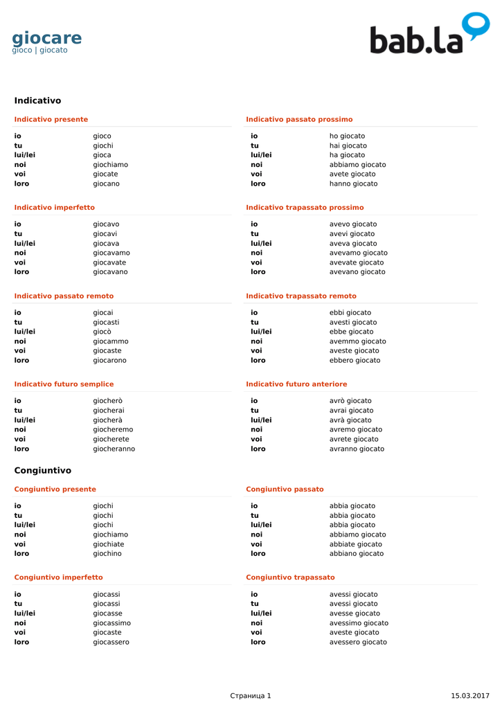 giocare gioco | giocato Indicativo Indicativo presente io tu lui/lei noi voi loro Indicativo passato prossimo gioco giochi gioca giochiamo giocate giocano Indicativo imperfetto io tu lui/lei noi voi loro giocavo giocavi giocava giocavamo giocavate giocavano Indicativo passato remoto io tu lui/lei noi voi loro giocai giocasti giocò giocammo giocaste giocarono Indicativo futuro semplice io tu lui/lei noi voi loro giocherò giocherai giocherà giocheremo giocherete giocheranno io tu lui/lei noi voi loro ho giocato hai giocato ha giocato abbiamo giocato avete giocato hanno giocato Indicativo trapassato prossimo io tu lui/lei noi voi loro avevo giocato avevi giocato aveva giocato avevamo giocato avevate giocato avevano giocato Indicativo trapassato remoto io tu lui/lei noi voi loro ebbi giocato avesti giocato ebbe giocato avemmo giocato aveste giocato ebbero giocato Indicativo futuro anteriore io tu lui/lei noi voi loro avrò giocato avrai giocato avrà giocato avremo giocato avrete giocato avranno giocato Congiuntivo Congiuntivo presente io tu lui/lei noi voi loro giochi giochi giochi giochiamo giochiate giochino Congiuntivo imperfetto io tu lui/lei noi voi loro giocassi giocassi giocasse giocassimo giocaste giocassero Congiuntivo passato io tu lui/lei noi voi loro abbia giocato abbia giocato abbia giocato abbiamo giocato abbiate giocato abbiano giocato Congiuntivo trapassato io tu lui/lei noi voi loro Страница 1 avessi giocato avessi giocato avesse giocato avessimo giocato aveste giocato avessero giocato 15.03.2017 giocare gioco | giocato Condizionale Condizionale presente io tu lui/lei noi voi loro giocherei giocheresti giocherebbe giocheremmo giochereste giocherebbero Condizionale passato io tu lui/lei noi voi loro avrei giocato avresti giocato avrebbe giocato avremmo giocato avreste giocato avrebbero giocato Imperativo Imperativo tu lui/lei noi voi loro gioca giochi giochiamo giocate giochino Infinito Infinito Infinito passato giocare avere giocato Participio Participio presente giocante Participio passato giocato Gerundio Gerundio giocando Gerundio passato avendo giocato Страница 2 Powered by TCPDF (www.tcpdf.org) 15.03.2017