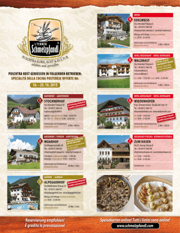 HOTEL 4 Edelweiss Via Unterdorf Strasse 6 Tel. +39 0472 546128 [email protected] · naturhotel-edelweiss.it Mittags auf Anfrage / pranzo su richiesta ore 18.00 – 21.00 Uhr Gehminuten vom Dorfzentrum: 5 Min / 400 m distanza dal centro: HOTEL-RESTAURANT · Hotel-Ristorante 5 Waldrast Puschtra Kost genieSSen in folgenden Betrieben: specialità della cucina pusterese offerte da: BAUERNHOF · AGRITURISMO Via Unterdorf Strasse 30 Tel. +39 0472 546134 [email protected] 2 SA & SO SPECIALp: fandl-Frühstück Schmelz M SAB & DO SPECIAL: Schmelzpfandl e on zi la co ore 12.00 – 13.30 Uhr / ore 18.30 – 21.00 Uhr Gehminuten vom Dorfzentrum: 4 Min / 350 m distanza dal centro: 16. – 25. 10. 2015 1 Stocknerhof Via Unterdorf Strasse 4 Tel. +39 0472 546130 [email protected] www.waldrast.it erlich! ng erford Reservierula prenotazione! È gradita HOTEL-RESTAURANT · Hotel-Ristorante 6 Wiedenhofer Pust. Sonnenstrasse · Strada del Sole 19 Tel. +39 0472 546116 [email protected] · www.wiedenhofer.com scht! ng erwün Reservierula prenotazione! a È gradit täglich / ogni giorno ore 18.00 – 20.00 Uhr SA · SO / SA · DOM ore 12.00 – 20.00 Uhr ore 12.00 – 14.00 Uhr ore 18.00 – 21.00 Uhr Gehminuten vom Dorfzentrum: 6 Min / 450 m distanza dal centro: Gehminuten vom Dorfzentrum: 2 Min / 200 m distanza dal centro: BAUERNHOF / Pension · AGRITURISMO nde und Mare FrühstümckBauernhof Moarhof presso auf de e merenda Via Margenerstraße 26 Colazionoeagricolo un mas Tel. +39 0472 546145 RESTAURANT-PIZZERIA·RISTORANTE-PIZZERIA 7 Zum Hasen [email protected] · moarhof-margen.it Via St.-Georg-Strasse 8 Tel. +39 0472 546149 [email protected] · www.hotelzumhasen.com Frühstück / colazione ore 8.00 – 11.00 Uhr Marende / merenda ore 14.00 – 16.00 Uhr ore 12.00 – 14.00 Uhr ore 18.00 – 21.00 Uhr Gehminuten vom Dorfzentrum: 40 Min / 3 km distanza dal centro: Dorfzentrum · centro GASTHOF · ALBERGO erlich! ng erford Reservierula prenotazione! Via Walderlaner Strasse 32 È gradita 3 Alpeggerhof Tel. +39 0472 546147 [email protected] · www.alpeggerhof.com Mittags auf Anfrage / pranzo su richiesta ore 18.00 – 21.00 Uhr Gehminuten vom Dorfzentrum: 25 Min / 2 km distanza dal centro: Reservierung empfohlen! È gradita la prenotazione! Speisekarten online! Tutti i listini sono online! www.schmelzpfandl.com