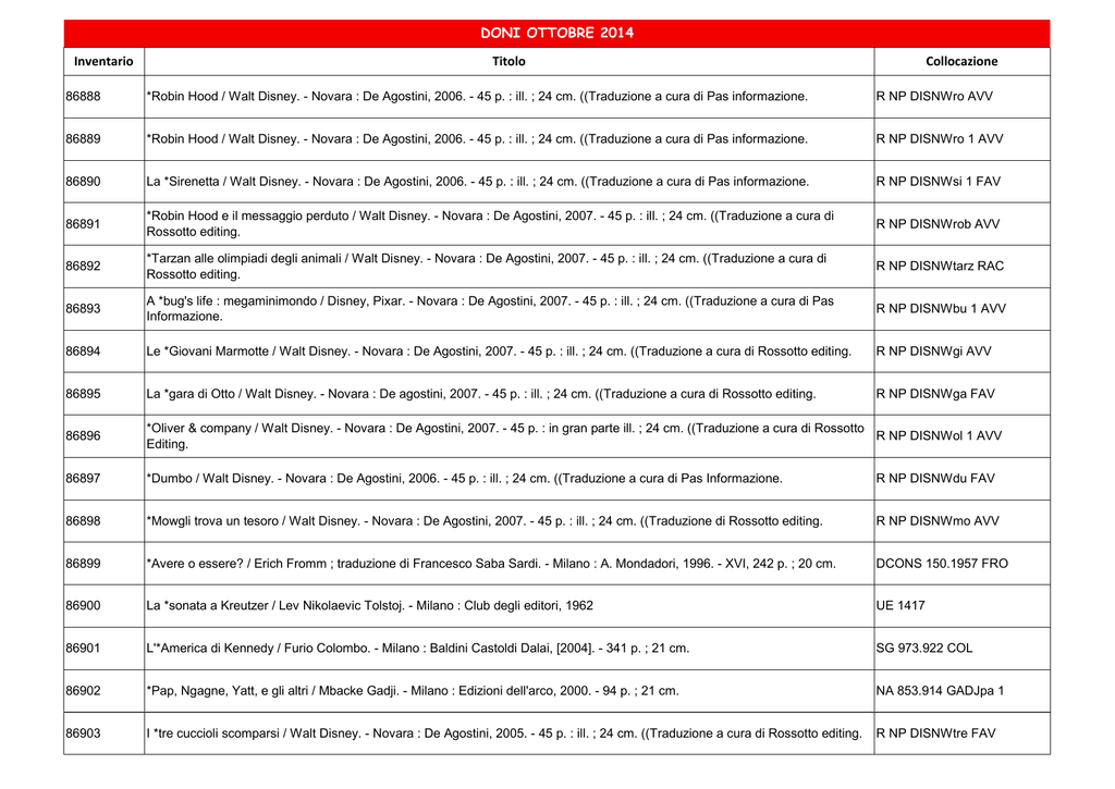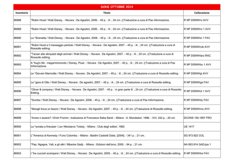 DONI OTTOBRE 2014 Inventario Titolo Collocazione 86888 *Robin Hood / Walt Disney. - Novara : De Agostini, 2006. - 45 p. : ill. ; 24 cm. ((Traduzione a cura di Pas informazione. R NP DISNWro AVV 86889 *Robin Hood / Walt Disney. - Novara : De Agostini, 2006. - 45 p. : ill. ; 24 cm. ((Traduzione a cura di Pas informazione. R NP DISNWro 1 AVV 86890 La *Sirenetta / Walt Disney. - Novara : De Agostini, 2006. - 45 p. : ill. ; 24 cm. ((Traduzione a cura di Pas informazione. R NP DISNWsi 1 FAV 86891 *Robin Hood e il messaggio perduto / Walt Disney. - Novara : De Agostini, 2007. - 45 p. : ill. ; 24 cm. ((Traduzione a cura di Rossotto editing. R NP DISNWrob AVV 86892 *Tarzan alle olimpiadi degli animali / Walt Disney. - Novara : De Agostini, 2007. - 45 p. : ill. ; 24 cm. ((Traduzione a cura di Rossotto editing. R NP DISNWtarz RAC 86893 A *bug's life : megaminimondo / Disney, Pixar. - Novara : De Agostini, 2007. - 45 p. : ill. ; 24 cm. ((Traduzione a cura di Pas Informazione. R NP DISNWbu 1 AVV 86894 Le *Giovani Marmotte / Walt Disney. - Novara : De Agostini, 2007. - 45 p. : ill. ; 24 cm. ((Traduzione a cura di Rossotto editing. R NP DISNWgi AVV 86895 La *gara di Otto / Walt Disney. - Novara : De agostini, 2007. - 45 p. : ill. ; 24 cm. ((Traduzione a cura di Rossotto editing. R NP DISNWga FAV 86896 *Oliver & company / Walt Disney. - Novara : De Agostini, 2007. - 45 p. : in gran parte ill. ; 24 cm. ((Traduzione a cura di Rossotto R NP DISNWol 1 AVV Editing. 86897 *Dumbo / Walt Disney. - Novara : De Agostini, 2006. - 45 p. : ill. ; 24 cm. ((Traduzione a cura di Pas Informazione. R NP DISNWdu FAV 86898 *Mowgli trova un tesoro / Walt Disney. - Novara : De Agostini, 2007. - 45 p. : ill. ; 24 cm. ((Traduzione di Rossotto editing. R NP DISNWmo AVV 86899 *Avere o essere? / Erich Fromm ; traduzione di Francesco Saba Sardi. - Milano : A. Mondadori, 1996. - XVI, 242 p. ; 20 cm. DCONS 150.1957 FRO 86900 La *sonata a Kreutzer / Lev Nikolaevic Tolstoj. - Milano : Club degli editori, 1962 UE 1417 86901 L'*America di Kennedy / Furio Colombo. - Milano : Baldini Castoldi Dalai, [2004]. - 341 p. ; 21 cm. SG 973.922 COL 86902 *Pap, Ngagne, Yatt, e gli altri / Mbacke Gadji. - Milano : Edizioni dell'arco, 2000. - 94 p. ; 21 cm. NA 853.914 GADJpa 1 86903 I *tre cuccioli scomparsi / Walt Disney. - Novara : De Agostini, 2005. - 45 p. : ill. ; 24 cm. ((Traduzione a cura di Rossotto editing. R NP DISNWtre FAV Inventario Titolo Collocazione 86904 Il *Natale di Biancaneve / Walt Disney. - Novara : De Agostini, 2007. - 45 p. : ill. ; 24 cm. ((Traduzione a cura di Rossotto editing. R NP DISNWna FAV 86905 Le *follie dell'imperatore / Walt Disney. - Novara : De Agostini, 2007. - 44 p. : ill. ; 24 cm. ((Traduzione a cura di Rossotto editing. R NP DISNWfo RAC 86906 La *carica dei 102 / Walt Disney. - Novara : De Agostini, 2007. - 45 p. : ill. ; 24 cm. ((Traduzione a cura di Rossotto editing. R NP DISNWcari RAC 86907 *Topo di campagna e topo di città / Walt Disney. - Novara : De Agostini, 2007. - 45 p. : ill. ; 24 cm. ((Traduzione a cura di Rossotto editing. R NP DISNWtop FAV 86908 *Lilli e il vagabondo : le *avventure di Zampa / Walt Disney. - Novara : De Agostini, 2007. - 45 p. : ill. ; 24 cm. ((Traduzione a cura R NP DISNWlili FAV di Rossotto editing. 86909 *Cenerentola : un *regalo di compleanno per Lucifero / Walt Disney. - Novara : De Agostini, 2007. - 45 p. : ill. ; 24 cm. ((Traduzione a cura di Rossotto editing. R NP DISNWcen FAV 86910 *Hotel Vendôme / Danielle Steel. - Milano : Mondolibri, 2013. - 396 p. ; 23 cm. NA 813.54 STEho 1 86911 *Tentativi di botanica degli affetti / Beatrice Masini. - Milano : Mondolibri, 2013. - 324 p. ; 22 cm NA 853.914 MASIte 86912 L' *apprendista stregone / Walt Disney. - Novara : De Agostini, 2007. - 45 p. : ill. ; 24 cm. ((Traduzione a cura di Rossotto editing. R NP DISNWap 1 FAN 86913 *Hercules / Walt Disney. - Novara : De Agostini, 2006. - 45 p. : ill. ; 24 cm. ((Traduzione a cura di Rossotto editing. R NP DISNWhe MIT 86914 *Alla ricerca di Nemo / Disney-Pixar. - Milano : Hachette Fascicoli, 2009. - [44] p. : in gran parte ill. ; 24 cm. R NP DISNWalr AVV 86915 *Lilo & Stitch / Disney ; [testo in italiano di Augusto Macchetto]. - Milano : Walt Disney company Italia, c2005. - 95 p. : ill. ; 23 cm. R NP DISNWli 1 FAN 86920 1: L'*alchimista / Michael Scott ; traduzione di Loredana Baldinucci. - Milano : Mondadori, 2008. - 392 p. : ill. ; 23 cm. R NG SCOTMse FAN 1 86921 *Pocahontas e l'aquilotto. - Novara : De Agostini, [2003!. - 44 p. : tutte ill. ; 24 cm. ((In testa al front.: Walt Disney. R NP DISNWpoc 1 RAC 86922 *Harry Potter e i doni della morte : romanzo / J.K. Rowling ; traduzione di Beatrice Masini ; [edizi. - Milano : Salani, [2008] R NB ROWLJKha 7 FAN 86923 *Harry Potter e il calice di fuoco : romanzo / J. K. Rowling ; illustrazioni di Serena Riglietti ; t. - Milano : Salani, 2001 R NB ROWLJKha 4 FAN Inventario Titolo Collocazione 86924 I *magici mondi di Harry Potter : il *libro dei segreti / David Colbert ; traduzione dall'inglese di Paola Cartoceti. - Roma : Fanucci, [2003]. - 16 p. ; 17 cm + 1 poster. R NB COLBDma FAN 86925 *Senza dirsi addio / Linwood Barclay. - Casale Monferrato : Piemme, 2009. - 375 p. ; 22 cm. ((Traduzione di Barbara Murgia. NA 813.54 BARCse 86926 *Monsters & co. / [testo italiano di Alessandra Orcese]. - Milano : The Walt Disney company Italia libri, [2002]. - 93 p. : ill. ; 24 cm. R NP DISNWmo 1 HOR ((In testa al front.: Disney-Pixar. 86927 *Harry Potter e il principe mezzosangue : romanzo / J. K. Rowling ; traduzione di Beatrice Masini. - Milano : Salani, c2006, stampa 2005. - 591 p. ; 22 cm. ((Sul dorso: HP 6. 86928 I *vendicatori / Richard Bachman [i.e. Stephen King] ; traduzione di Tullio Dobner. - Milano : Sperling & Kupfer, 1997. - 413 p. : ill. NA 813.54 KINven ; 22 cm. 86929 *Cronache di un mondo a parte / Valentina Tagliabue. - Milano : Zephyro Edizioni, 2009. - 326 p. ; 20 cm. . ((T.&C. NA 853.92 TAGcr 86930 *Piccole donne / [liberamente adattato d