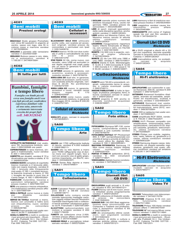 25 APRILE 2014 BRACCIALE Dodo gruppo Pomellato con circa 60 sassolini in argento al centro, sasso con logo, due fili in cotone rosso e marrone vendesi ✆ 347/5258824• OROLOGIO a pendolo stile veneziano vendesi ✆ 333/4551558• OROLOGIO Bulova cassa in oro, datario e automatico, vendesi € 1.150,00 ✆ 347/4641064• Bambini, famiglie e tempo libero Famiglia con bimbi piccoli cerca una famiglia anch’essa con figli piccoli per condividere esperienze familiari volte ad una sana, amorevole e seriamente interessata crescita dei propri figli. cell. 348.9128343 BLACKBERRY BOLD 9900 utilizzato poche volte, con scatola ed accessori originali, vendesi prezzo da concordare o permutasi con Ipad ✆ 335/1440874• IPHONE 4 bianco 16 Gb con due custodie in pelle e caricabatterie da auto 220 € poco trattabili. ✆ 346/3301376• IPOD TOUCH 32 Gb, come nuovo, con laccetto, cavo USB ed auricolari in ear Apple originali mai usati usato per un anno in garanzia € 220,00 ✆ 339/8493140• LG OPTIMUS ancora in garanzia, con scontrino, scatola e accessori, custodia vendesi ✆ 340/7876679• NOKIA ASHA 305 dual sim, in garanzia, completo di accessori, come nuovo, con custodia antiurto originale, vendesi € 30,00. No perditempo ✆ 335/5272104• NOKIA LUMIA 625 nuovo, in garanzia, accessori e cover, vendesi causa doppio regalo € 170 ✆ 328/8242009• SAMSUNG N7000 come nuovo, usato come secondo telefono, in garanzia fino maggio 2014, vendesi € 240,00 ✆ 339/5757197• Richieste I SICILIANI mensile primo numero del direttore Giuseppe Fava, uscito nel gennaio 1983, vendesi prezzo da concordare ✆ 393/2546388• LIBRI di sport: manuali specialistici delle varie discipline sportive, anche antichi vendesi ✆ 348/9128343• LIBRO antico sul Messina Calcio: Acr Messina mezzo secolo di attività ottime condizioni vendesi ✆ 348/9128343• LOCANDINA inaugurazione riapertura teatro Vittorio Emanuele di Messina, con cornice e vetro, cm 74x100 vendesi ✆ 340/1001649• MONETE (14) 500 Lire in argento, vendesi al miglior offerente ✆ 347/8235949• MONETE (2) da Lire 500 una 1966 e una 1960, vendesi ✆ 366/1010851• MONETE Dante € 9,00, Michelangelo € 12,00; £ 1.000 Concordia € 12,00 + 300 monete £ 5 + 400 pezzi £ 10 € 50,00 vendesi ✆ 338/2616697• Richieste FUMETTI anni '50-60 e precedenti, originali, collezionista cerca in acquisto o valuta eventuali cambi ✆ 095/374811• INSEGNE PUBBLICITARIE di tutte le tipologie, di plastica, plexiglass, ferro, in buone condizioni cercasi in acquisto ✆ 348/9128343• MONETE argento £ 500 anche in discrete condizioni acquistasi ✆ 338/2616697• NOKIA N73 grigio, cercasi in acquisto ✆ 327/6530031• COPRILETTO MATRIMONIALE mai usato, anni '50, lavorazione tombolo, vendesi ✆ 095/330948 ore pasti• COPRIMATERASSI in lana merinos, singolo e matrimoniale, nuovi vendesi € 300 ✆ 095/338513• CORPETTO per disabili, vendesi € 15 e divaricatore per sedia a rotelle, € 15 ✆ 349/6933539• CORREDO NUOVO completo di copriletto bianco ricamato e 2 lenzuola abbinate con sopra ricamato, vendesi € 180 + lenzuolo stile Cinquecento mai usato, € 180 + completo lenzuola bianche ricamato a mano, € 150 + tovaglie da tavola in puro lino di Cantù beige, € 180 ✆ 095/493262• PANNOLONI mutandina, traverse e pannoloni rettangolari, vendesi prezzo modico ✆ 320/7065104• RETE una piazza e mezza ortopedica, (no materasso) vendesi prezzo affare ✆ 320/7065104• SEDIA A ROTELLE come nuova e moto per disabile vendesi ✆ 347/9523380• SERVIZI DA TAVOLA ricamati a mano, bianco con uncinetto e l'altro ecrù con chiacchierino, nuovi, vendesi prezzo da concordare ✆ 095/628796• TROUSSE Pupa grande mai usata vendesi € 20,00 ✆ 328/9389777• SCEGLI IL NERETTO e metti in evidenza i tuoi annunci più importanti....Rivolgiti alla Publiedit S.r.l. Via Umberto,201 Catania Tel.095 537735 Fax 095 7461251• 27 inserzioni gratuite 095/330555 ARAZZO del 1700 raffigurante battuta di caccia, vendesi € 4.000 trattabili ✆ 338/6188211• QUADRO olio su tela dipinto a mano anni '70/80 raffigurante viso di donna mora con capelli lunghi, lisci e neri con accanto viso di gatto grigio, cornice importante, cm 50x70, vendesi ✆ 333/4464357• STATUA Santa Rita dipinta a mano vendesi ✆ 340/5794661• ALBUM Calciatori Panini completi, da anni 80-81 a 88-89 vendesi ✆ 328/6813671• COLLEZIONE tutto compra vende monete banconote medaglie cartoline oggetti militari fascisti Mussolini Garibaldi Sant'Agata lotti e collezioni lasciti ereditari valutazione gratuita via R. Franchetti ✆ 328/7047285• ELICOTTERO radiocomandato con motore a scoppio vendesi € 400 ✆ 095/7179229• FUMETTI da collezione circa 2.000, vendesi prezzo affare causa trasferimento ✆ 347/4143066• GABBIANO REALE e porciglione imbalsamato vendesi ✆ 095/270264• FOTOCAMERA Olympus MP-130, come nuova, comprendente scatola e accessori e una custodia vendesi ✆ 340/7876679• FOTOCAMERA DIGITALE HP Photosmart 850, 4.1 MP, semiprofessionale con priorità di tempi e priorità di diaframma, zoom ottico 8x, digitale 56x, vendesi € 100 ✆ 380/2995361• MACCHINA FOTOGRAFICA Samsung 13 Mpx come nuova, doppio display causa inutilizzo vendesi ✆ 339/6320153• PENTAX 17-70MM F4 settembre 2012, vendesi € 400 intrattabili ✆ 328/7171857• VIDEOCAMERA digitale buone condizioni, vendesi ✆ 347/9540121• ! " ENCICLOPEDIA sugli animali n. 8 volumi vendesi € 55✆ 347/9540121• FILMINI Disney vari 8 mm nuovi, ancora imballati anche singolarmente vendesi ✆ 348/9128343• FUMETTI collezione di Diabolik vendesi prezzo da concordare ✆ 334/1946424• KARAOKE DVD 140.000 Basi aggiornatissime testo sincronizzato per Computer o Tastiere uso professionale o domestico vendesi € 60 ✆ 340/7365074• LIBRI (6) enciclopedia ottime condizioni, vari argomenti vendesi ✆ 331/3382323• LIBRI antichi, di diritto e cultura e stampe antiche ottime condizioni, vendesi ✆ 349/6705121• LIBRI Ha