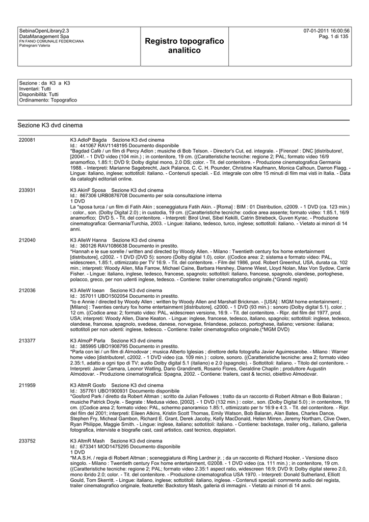 SebinaOpenLibrary2.3 DataManagement Spa FN FANO COMUNALE FEDERICIANA Patregnani Valeria Registro topografico analitico 07-01-2011 16:00:56 Pag. 1 di 135 Sezione : da K3 a K3 Inventari: Tutti Disponibilità: Tutti Ordinamento: Topografico Sezione K3 dvd cinema 220081 K3 AdloP Bagda Sezione K3 dvd cinema Id.: 441067 RAV1148195 Documento disponibile *Bagdad Cafè / un film di Percy Adlon ; musiche di Bob Telson. - Director's Cut, ed. integrale. - [Firenze! : DNC [distributore!, [2004!. - 1 DVD video (104 min.) ; in contenitore, 19 cm. ((Caratteristiche tecniche: regione 2; PAL; formato video 16/9 anamorfico, 1.85:1; DVD 9; Dolby digital mono, 2.0 DS; color. - Tit. del contenitore. - Produzione cinematografica Germania 1988. - Interpreti: Marianne Sagebrecht, Jack Palance, C. C. H. Pounder, Christine Kaufmann, Monica Calhoun, Darron Flagg. Lingue: italiano, inglese; sottotitoli: italiano. - Contenuti speciali. - Ed. integrale con oltre 15 minuti di film mai visti in Italia. - Data da cataloghi editoriali online. 233931 K3 AkinF Sposa Sezione K3 dvd cinema Id.: 867306 URB0876708 Documento per sola consultazione interna 1 DVD La *sposa turca / un film di Fatih Akin ; sceneggiatura Fatih Akin. - [Roma] : BIM : 01 Distribution, c2009. - 1 DVD (ca. 123 min.) : color., son. (Dolby Digital 2.0) ; in custodia, 19 cm. ((Caratteristiche tecniche: codice area assente; formato video: 1:85.1, 16/9 anamorfico; DVD 5. - Tit. del contenitore. - Interpreti: Birol Unel, Sibel Kekilli, Catrin Striebeck, Guven Kyrac. - Produzione cinematografica: Germania/Turchia, 2003. - Lingue: italiano, tedesco, turco, inglese; sottotitoli: italiano. - Vietato ai minori di 14 anni. 212040 K3 AlleW Hanna Sezione K3 dvd cinema Id.: 360126 RAV1086638 Documento in prestito. *Hannah e le sue sorelle / written and directed by Woody Allen. - Milano : Twentieth century fox home entertainment [distributore], c2002. - 1 DVD (DVD 5): sonoro (Dolby digital 1.0), color. ((Codice area: 2; sistema e formato video: PAL, widescreen, 1.85:1, ottimizzato per TV 16:9. - Tit. del contenitore. - Film del 1986, prod. Robert Greenhut, USA, durata ca. 102 min.; interpreti: Woody Allen, Mia Farrow, Michael Caine, Barbara Hershey, Dianne Wiest, Lloyd Nolan, Max Von Sydow, Carrie Fisher. - Lingue: italiano, inglese, tedesco, francese, spagnolo; sottotitoli: italiano, francese, spagnolo, olandese, portoghese, polacco, greco, per non udenti inglese, tedesco. - Contiene: trailer cinematografico originale.(*Grandi registi) 212036 K3 AlleW Ioean Sezione K3 dvd cinema Id.: 357011 UBO1502054 Documento in prestito. *Io e Annie / directed by Woody Allen ; written by Woody Allen and Marshall Brickman. - [USA] : MGM home entertainment ; [Milano] : Twenties century fox home entertainment [distributore], c2000. - 1 DVD (93 min.) : sonoro (Dolby digital 5.1), color. ; 12 cm. ((Codice area: 2; formato video: PAL, widescreen versione, 16:9. - Tit. del contenitore. - Ripr. del film del 1977, prod. USA; interpreti: Woody Allen, Diane Keaton. - Lingue: inglese, francese, tedesco, italiano, spagnolo; sottotitoli: inglese, tedesco, olandese, francese, spagnolo, svedese, danese, norvegese, finlandese, polacco, portoghese, italiano; versione: italiana; sottotitoli per non udenti: inglese, tedesco. - Contiene: trailer cinematografico originale.(*MGM DVD) 213377 K3 AlmoP Parla Sezione K3 dvd cinema Id.: 385995 UBO1908795 Documento in prestito. *Parla con lei / un film di Almodovar ; musica Alberto Iglesias ; direttore della fotografia Javier Aguirresarobe. - Milano : Warner home video [distributore!, c2002. - 1 DVD video (ca. 109 min.) : colore, sonoro. ((Caratteristiche tecniche: area 2; formato video 2.35:1, adatto a ogni tipo di TV; audio Dolby digital 5.1 (italiano) e 2.0 (spagnolo). - Sottotitoli: italiano. - Titolo del contenitore. Interpreti: Javier Camara, Leonor Watling, Dario Grandinetti, Rosario Flores, Geraldine Chaplin ; produttore Augustin Almodovar. - Produzione cinematografica: Spagna, 2002. - Contiene: trailers, cast & tecnici, obiettivo Almodovar. 211959 K3 AltmR Gosfo Sezione K3 dvd cinema Id.: 357761 UBO1900931 Documento disponibile *Gosford Park / diretto da Robert Altman ; scritto da Julian Fellowes ; tratto da un racconto di Robert Altman e Bob Balaran ; musiche Patrick Doyle. - Segrate : Medusa video, [2002]. - 1 DVD (132 min.) : color., son. (Dolby Digital 5.0) ; in contenitore, 19 cm. ((Codice area 2; formato video: PAL, schermo panoramico 1.85:1, ottimizzato per tv 16:9 e 4:3. - Tit. del contenitore. - Ripr. del film del 2001; interpreti: Eileen Atkins, Kristin Scott Thomas, Emily Watson, Bob Balaran, Alan Bates, Charles Dance, Stephen Fry, Micheal Gambon, Richard E. Grant, Derek Jacoby, Kelly MacDonald, Helen Mirren, Jeremy Northam, Clive Owen, Ryan Philippe, Maggie Smith. - Lingue: inglese, italiano; sottotitoli: italiano. - Contiene: backstage, trailer orig., italiano, galleria fotografica, interviste e biografie cast, cast artistico, cast tecnico, doppiatori. 233752 K3 AltmR Mash Sezione K3 dvd cinema Id.: 673341 MOD1475295 Documento disponibile 1 DVD *M.A.S.H. / regia di Robert Altman ; sceneggiatura di Ring Lardner jr. ; da un racconto di Richard Hooker. - Versione disco singolo. - Milano : Twentieth century Fox home entertainment, ©2008. - 1 DVD video (ca. 111 min.) ; in contenitore, 19 cm. ((Caratteristiche tecniche: regione 2; PAL; formato video 2.35:1 aspect ratio, widescreen 16:9; DVD 9; Dolby digital stereo 2.0, mono ibrido 2.0; color. - Tit. del contenitore. - Produzione cinematografica USA 1970. - Interpreti: Donald Sutherland, Elliott Gould, Tom Skerritt. - Lingue: italiano, inglese; sottotitoli: italiano, inglese. - Contenuti speciali: commento audio del regista, trailer cinematografico originale, featurette: Backstory Mash, galleria di immagini. - Vietato ai minori di 14 anni. SebinaOpenLibrary2.3 DataManagement Spa FN FANO COMUNALE FEDERICIANA Patregnani Valeria Registro topografico analitico 07-01-2011 16:00:56 Pag. 2 di 135 23375