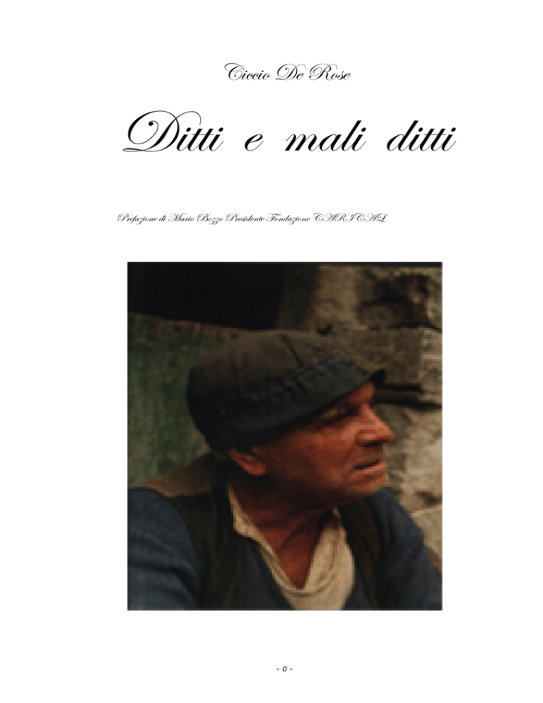 V|vv|É Wx eÉáx W|àà| x ÅtÄ| w|àà| cÜxyté|ÉÇx w| `tÜ|É UÉééÉ cÜxá|wxÇàx YÉÇwté|ÉÇx VTe\VT_ -0- La mia diletta città potrebbe benissimo fare a meno di me , ma sono io che non posso fare a meno di essa . Essa che mi scorre nelle vene e che amo . Bernardino Telesio -1- -2- Ringraziamenti (dissobrigu) Ad ognedunu ‘u sua e, di ciertu, ‘u miu unn’è ‘su ciuòtu-sbrignu, ‘su marchingegnu ca chiamanu computer. Ad illu cci àju dittu: “ tu, ppe ‘mmia, s’i sulu ‘na machina ppe scriva e a tuttu chillu ca tu m’addummanni, ju nun te rispunnu. Vù sapìri troppe cose, s’i ‘mpaccieru e me le circhi ccu ‘na lingua, l’angrise, ca ju nun canusciu. Ju ca rapu ‘u frigoriferu e nun m’arricuòrdu chillu c’avja de pigliari e ca rapu ‘u diziunàriu e mi riscuòrdu chillu c’avja de cercàri, tu, computer, nun s’i fattu ppe mia. T’àju ‘i truvari ‘na persuna ca te po’ ammaccari ‘i coste e ca te fa filare.“ Ed ju s’atra persuna l’àju truvata : se chiama donna Giuseppina Ciniglia de Marvitu , ‘na Primaria d’u computer ca l’à fattu fare chillu c’à volutu; ”mìntati ‘n riga , rispetta l’arfabetu , scriva ‘ranni , pua corsivu , va avanti , mò arrieti , cuntami ‘i pagine , ignora, taglia, cusa: l’à fattu venìri ‘u riminizzu e ju me signu scialatu picchì ‘u computer ca ccu ‘mmia facìa ‘u liusu ,’u sbafantu , à truvatu ‘a furma d’a scarpa sua ! Giuseppina, amica sincera e sperta, l’à cummannatu, l’à ‘ncantatu, l’à ‘ncacanatu, l’à stregatu e ‘u computer l’à dovutu dire: “cumu vo’ vussurìa“.Perciò, ‘si “Ditti e mali ditti” vìdanu ‘u suli, trasanu ‘ntre librerìe e vi lu putiti lèjiari, ‘u meritu è di donna Giuseppina ca cu affettu, pacienza e mestiere, ppi ogni mumentu, ha truvatu ‘u superamientu: ed ju ad jlla le mannu ‘u cchiù ‘ranni ringraziamientu. Putìa caminari ccu ‘nu buonu vestimientu e senza quazàta Ditti e mali ditti? Noni! E allura, pronte le scarpe: alla cornice ch’era vacante, ‘nu Mastru à pittatu li quatri. L’à pittati Giulianu Di Cola, ccu li pinnielli ca tena ‘ntra capu e ca ppi misteru pua supa ‘a carta venanu stampati: guardatili, llà cci truvati ‘u veru tiempu anticu! Giulià, grazie ppi lu rigalu ca m’à fattu: ccà ti lu dicu e ccu tantu affettu! -3- -4- Calavrisi , stippa ‘a ricchia surda , basta ccu la licurda : azamuni , nun stavimu cchiù ‘ncacanati alla terra nostra dunamu libertati ! -5- Presentazione E’ con enorme soddisfazione , oltre che con sincero sentimento di amicizia , testimoniare a Ciccio De Rose i miei complimenti per aver avuto la grande intuizione di scrivere , raccogliere , valorizzare i proverbi , i ditti e i “mali ditti” , a riprova che l’originalità di questa iniziativa deve far capire a tutti noi l’importanza del significato dei proverbi antichi mai come oggi da poter trasferire alle nuove generazioni in chiave attuale . Si tratta infatti di detti che sono a mio parere non solo di attualità , ma universali e toccano , anzi collimano con le varie sfaccettature della nostra vita quotidiana , del nostro agire quotidiano , del dare e del ricevere , dell’essere e dell’avere , del comportarsi , delle rappresentazione dei sentimenti di gioia , di tristezza , dell’amicizia , della famiglia , del lavoro , delle bugie , delle verità , proverbi sulla salute che spesso noi tutti siamo pronti a sostituire anche rispetto a ricette mediche di luminari . Si tratta quindi non solo di una piacevole raccolta ma anche di un messaggio da veicolare ad una società che mai come oggi in piena globalizzazione ha bisogno di avere dei tradizionali punti di riferimento culturali , ricchi di sani principi da tramandare ai giovani . In qualità di Assessore alle Politiche Culturali ed alla Pubblica Istruzione della Provincia di Cosenza , ringrazio l’amico Ciccio De Rose per aver avuto questa brillante intuizione , continuando ad apprezzare il suo operato che riconosco da anni non solo per la lunga amicizia familiare ma anche perché già colleghi Consiglieri Comunali nella città di Cosenza , lo ringrazio ulteriormente in qualità di Assessore alle Politiche Culturali ed alla Pubblica Istruzione della Provincia di Cosenza , la cui Amministrazione ed i cui obiettivi sono sempre quelli di valorizzare e di premiare la qualità , la cultura , le nostre tradizioni , le nostre radici ed identità indelebili nel tempo . Avv. Stefania Covello -6- Prefazione I proverbi rappresentano la sintesi più efficace della cultura di un popolo: una sintesi nella quale confluiscono, spesso nello spazio stringatissimo di una veloce battuta, attese fiduciose e speranze deluse, patimenti rassegnati e inquietudini impotenti, rabbie represse o appena sussurrate, superstizioni diffuse ed esperienze illuminanti, errori da evitare e verità da condividere. Sono, per questo, una preziosa testimonianza di un comune modo di essere che si tramanda da padre in figlio e da una generazione all’altra, come un vademecum di saggezza che orienta e guida. Il loro tramite espressivo più congeniale è, ovviamente, il dialetto, per la sua connaturata capacità di dare voce, con immediatezza e senza filtri deformanti, al sentimento, alle convinzioni e alle credenze del popolo che adotta come suoi tutti i proverbi che ne rispecchiano l’anima, anche quando non hanno una genesi popolare. Si spiega, così, l’attenzione con cui gli studiosi di tradizioni popolari, di sociologia, di antropologia, di psicologia di massa, continuano a guardare, in ogni parte del mondo, ai detti popolari, spesso disseminati nelle opere dei poeti e degli scrittori riconducibili ai filoni della letteratura realista, presenti, con diversa intensità, in tutte le epoche. Merita, perciò, un sincero e motivato apprezzamento l’iniziativa di Ciccio De Rose che, a conclusione di una lunga ricerca, ha deciso di dare alle stampe i “ditti” del nostro popo