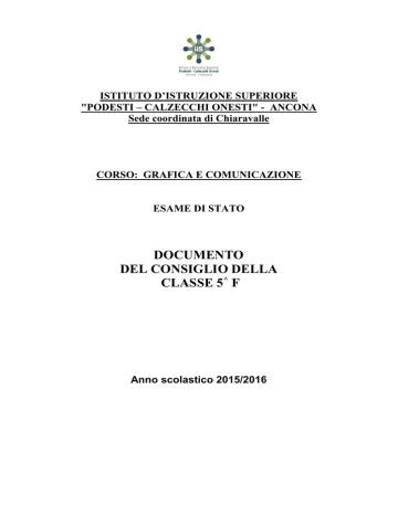 ISTITUTO D’ISTRUZIONE SUPERIORE "PODESTI – CALZECCHI ONESTI" - ANCONA Sede coordinata di Chiaravalle CORSO: GRAFICA E COMUNICAZIONE ESAME DI STATO DOCUMENTO DEL CONSIGLIO DELLA CLASSE 5^ F Anno scolastico 2015/2016 Sommario 1. PRESENTAZIONE DELL’ISTITUTO 2. ELENCO DEI CANDIDATI 3. COMPOSIZIONE DEL CONSIGLIO DI CLASSE 4. IL PERCORSO FORMATIVO - Finalità e specificità dell’indirizzo - Presentazione della classe - Obiettivi trasversali - Attività scolastiche ed extra-scolastiche - Criteri generali dell’Istituto per la valutazione del profitto e del comportamento 4.6 - Attribuzione dei crediti scolastici e formativi 4.1 4.2 4.3 4.4 4.5 5. PROVE D’ESAME 5.1 - Griglie di valutazione 5.1.1 - Prova di italiano (I prova) 5.1.2 - Prova di Progettazione Multimediale (II prova) 5.1.3 - Prova multidisciplinare (III prova) 5.1.4 - Colloquio multidisciplinare 5.2 - Date delle prove di simulazione 5.2.1 - Testi delle simulazioni della Terza Prova 5.3 - Attività di approfondimento dei candidati 6. ATTIVITA’ DI ALTERNANZA SCUOLA-LAVORO 7. PROGRAMMI SVOLTI E RELAZIONI FINALI 1. PRESENTAZIONE DELL’ISTITUTO L’Istituto di Istruzione Superiore “Podesti – Calzecchi Onesti” è di recente costituzione; nasce dall’accorpamento dell’I.P.S.S.C.T.P.S. “F. Podesti” di AnconaChiaravalle con l’I.P.S.I.A di Ancona, avvenuta nell’anno scolastico 2009-10. Attualmente consta di due sedi, quella centrale di Ancona che comprende il Podesti e l’ex IPSIA, e la sede coordinata di Chiaravalle. La sede centrale, edificio appena inaugurato, raccoglie un bacino di utenza che abbraccia, oltre alla città di Ancona, alcuni comuni limitrofi, quali Agugliano, Polverigi, Osimo, Offagna, Castelfidardo, Sirolo, Numana, Loreto; la sede coordinata di Chiaravalle comprende un territorio molto vasto, che da Falconara Marittima si estende fino all’alta Vallesina e Arcevia. L’Istituto offre vari indirizzi: Servizi commerciali: Ancona – Chiaravalle Servizi socio-sanitari: Ancona – Chiaravalle Manutenzione e assistenza tecnica: Ancona Odontotecnico: Ancona Tecnico della Grafica e comunicazione: Ancona – Chiaravalle Dall’anno scolastico 2007/08, nella sede di Ancona, è stato avviato, di concerto con la Provincia, un Corso per Operatore del benessere (acconciatura ed estetica), nell’ambito dei Percorsi Sperimentali Triennali Integrati di Istruzione e Formazione Professionale di cui alla Legge 27 dicembre 2006, n. 296, articolo 1, comma 624; il corso, inserito all’interno dei Servizi socio-sanitari, è organizzato nell’ambito della quota 20% di flessibilità del curricolo locale di cui al D.P.R. n. 275/99. Il corso è stato totalmente finanziato dalla Provincia, sia per quanto riguarda le risorse umane (docenti) che per quelle strumentali. Il corso, di durata triennale consente di assolvere all’obbligo scolastico e di conseguire la qualifica professionale di Operatore del benessere; inoltre, nell’ambito del triennio, è possibile passare al corrispondente anno di corso servizi socio-sanitari senza sostenere esami di idoneità. La composizione generale dell’utenza è molto varia; dal punto di vista socioeconomico gli studenti provengono da famiglie di ceto medio o basso, spesso di limitate risorse culturali e finanziarie. Molti di questi ragazzi hanno alle spalle percorsi scolastici irregolari caratterizzati da ripetenze; l’Istituto offre una valida opportunità per consentire il recupero di molte situazioni di disagio e svantaggio, attraverso azioni di ri-orientamento e motivazione allo studio, finalizzate non solo al conseguimento di un diploma, ma soprattutto alla formazione dei futuri cittadini di una comunità nazionale, europea nella nuova dimensione della mondialità, attraverso un valido inserimento nel mondo del lavoro. La strategia formativa dell'Istituto è quella di collocare lo studente al centro del processo educativo, coordinando risorse interne ed esterne che permettono di potenziare le capacità umane, civili, morali e intellettuali di ciascuno. La scuola, competitiva e dinamica, si propone di rendere l'apprendimento interessante e significativo incoraggiando i giovani a considerare il proseguimento degli studi come valida alternativa al lavoro. Con il conseguimento del diploma è possibile proseguire gli studi accedendo ai vari corsi universitari del territorio quali Economia e Commercio, Economia del Turismo, Scienze della Comunicazione, Psicologia, Scienze infermieristiche, Assistente Sociale ecc. che consentono di completare la propria istruzione e di raggiungere standard di elevata professionalità. Per chi non intende intraprendere un percorso universitario, l'Istituto assicura, oltre ad una solida preparazione di base, una formazione professionale qualificata, aggiornata ed immediatamente spendibile nel mondo del lavoro. Tutto ciò grazie a percorsi di studio dinamici e articolati, laboratori tecnologici dotati delle più aggiornate strumentazioni e rapporti diretti con la realtà lavorativa del territorio sviluppati in varie forme. L'Istituto intende inoltre rafforzare la cooperazione internazionale, mediante la partecipazione a progetti europei in rete con altre Istituzioni scolastiche dell’Unione. Da noi è possibile: conseguire la Patente Europea dell'Informatica (ECDL) partecipare a mobilità mediante il programma Erasmus Plus frequentare uno dei corsi post-diploma finanziati dal Fondo Sociale Europeo partecipare a competizioni sportive individuali e di squadra esprimersi musicalmente, graficamente, artisticamente L'Istituto ha ottenuto la Certificazione di Qualità UNI EN ISO 9001:2000 nell'anno scolastico 2003/2004. L'adozione di un Sistema di Gestione per la Qualità (SGQ), secondo la suddetta norma e le direttive regionali, è stata per la scuola una scelta coerente con la sua strategia organizzativa perseguita per anni, ed ancora oggi le attività svolte sono decisamente orientate al mantenimento della certificazione e del sistema di controllo dell