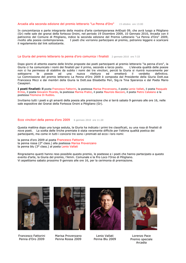 Arcadia alla seconda edizione del premio letterario "La Penna d'Oro" 15 ottobre ore 13:00 In concomitanza e parte integrante della mostra d'arte contemporanea ArtExpò 09, che avrà luogo a Pitigliano (Gr) nelle sale dei granai della fortezza Orsini, nel periodo 19 Dicembre 2009, 10 Gennaio 2010, Arcadia con il patrocinio del Comune di Pitigliano, indice la seconda edizione del Premio Letterario "La Penna d'Oro" 2009, rivolto alla poesia contemporanea. I poeti che vorranno partecipare al premio, potranno leggere e scaricare il regolamento dal link sottostante. La Giuria del premio letterario la penna d'oro comunica i finalisti 2 gennaio 2010 ore 7:33 Dopo giorni di attento esame delle liriche proposte dai poeti partecipanti al premio letterario "la penna d'oro", la Giuria ci ha comunicato i nomi dei finalisti per il primo, secondo e terzo posto. L'elevata qualità delle poesie non ci ha permesso di stabilire da subito i nomi dei tre vincitori, perciò la Giuria si riunirà nuovamente per sottoporre le poesie ad una nuova rilettura ed emetterà il verdetto definitivo. La Commissione del premio letterario La Penna d'Oro 2009 è composta dal Presidente della Giuria Dott.ssa Francesca Micci e dai membri della Giuria la Dott.ssa Elisabetta Peri, Sig.ra Tina Speranza e dal Poeta Mario Casapieri. I poeti finalisti: il poeta Francesco Fattorini, la poetessa Marisa Provenzano, il poeta Lenio Vallati, il poeta Pasquale Ermio, il poeta Giovanni Picardo, la poetessa Marina Pratici, il poeta Maurizio Bacconi, il poeta Pietro Catalano e la poetessa Filomena Di Rubbio. Invitiamo tutti i poeti e gli amanti della poesia alla premiazione che si terrà sabato 9 gennaio alle ore 16, nelle sale espositive dei Granai della Fortezza Orsini a Pitigliano (Gr). Ecco vincitori della penna d'oro 2009 6 gennaio 2010 ore 11:20 Questa mattina dopo una lunga seduta, la Giuria ha indicato i primi tre classificati, su una rosa di finalisti di nove poeti. La scelta delle liriche premiate è stata veramente difficile per l'ottima qualità poetica dei partecipanti, ma come in tutti i concorsi tre sono i premiati ed ecco i loro nomi: la penna d'oro 2009 al poeta Francesco Fattorini la penna rossa (2° class.) alla poetessa Marisa Provenzano la penna blu (3° class.) al poeta Lenio Vallati Ringraziamo quanti hanno reso possibile questo premio, le poetesse e i poeti che hanno partecipato a questo evento d'arte, la Giuria del premio, l'Amm. Comunale e la Pro Loco l'Orso di Pitigliano. Vi aspettiamo sabato prossimo 9 gennaio alle ore 16, per la cerimonia di premiazione. Francesco Fattorini Penna d’Oro 2009 Marisa Provenzano Penna Rossa 2009 Lenio Vallati Penna Blu 2009 Lorenzo Pace Premio speciale Arcadia Le poesie vincitrici Francesco Fattorini Giugno Il primo sole riscalda il vento fresco e fuggiasco e l’aria profumata di ruscello ma il mio respiro rimane un pianoforte con le corde rotte. Il muschio grasso e verde fa dolci gli spigoli del masso sul quale poggia, stanco, il mio corpo di legno secco. La valle, allagata di nebbia leggera, tira il fiato pronta al giorno nuovo. Solo io, senza te, rimango preda di ieri. Marisa Provenzano Mani vuote Ho stretto tra le mani gli attimi di un sogno e lento è scivolato tra le dita come sabbia fine si è disperso al primo vento d’autunno Ho stretto tra le mani un fiore di prato e piano è appassito come questa mia primavera Sola sulla sabbia ancora cerco le mie orme ancora tremo al vento della sera ancora ascolto la voce del mare e con l’alba scompare anche la luna Ho stretto tra le mani gli ultimi ricordi e sono sfuggiti come nebbia al vento Ora rimango con le mani vuote il cuore ancora gonfio d’infinito e gli occhi persi oltre l’orizzonte con lo sguardo umido di pianto a ricercare l’ultima traccia di un amore o forse l’ultimo respiro del tempo. Lenio Vallati Uomo Hai spezzato i miei reni, hai distrutto le mie vele, eppure contro i flutti ancora continuo a gettare l’anima. Oltre ogni ostacolo vado in cerca dell’isola che forse esiste soltanto nella mia mente, così chiara è la sua immagine che mi pare di toccarla con il dito del pensiero. E quando la raggiungerò Alzerò lo sguardo al cielo in cerca del tuo sorriso, poi chiuderò per sempre questi miei occhi di uomo e mi lascerò trasportare lentamente dal tuo respiro.