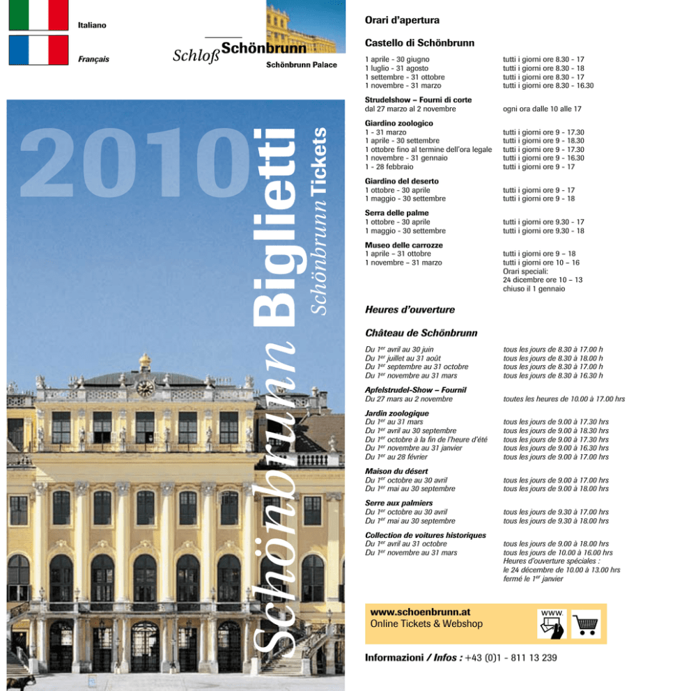 Orari d’apertura Italiano Castello di Schönbrunn Français Schönbrunn Tickets Schönbrunn Biglietti 2010 1 aprile - 30 giugno 1 luglio - 31 agosto 1 settembre - 31 ottobre 1 novembre - 31 marzo tutti i giorni ore 8.30 - 17 tutti i giorni ore 8.30 - 18 tutti i giorni ore 8.30 - 17 tutti i giorni ore 8.30 - 16.30 Strudelshow – Fourni di corte dal 27 marzo al 2 novembre ogni ora dalle 10 alle 17 Giardino zoologico 1 - 31 marzo 1 aprile - 30 settembre 1 ottobre fino al termine dell’ora legale 1 novembre - 31 gennaio 1 - 28 febbraio tutti i giorni ore 9 - 17.30 tutti i giorni ore 9 - 18.30 tutti i giorni ore 9 - 17.30 tutti i giorni ore 9 - 16.30 tutti i giorni ore 9 - 17 Giardino del deserto 1 ottobre - 30 aprile 1 maggio - 30 settembre tutti i giorni ore 9 - 17 tutti i giorni ore 9 - 18 Serra delle palme 1 ottobre - 30 aprile 1 maggio - 30 settembre tutti i giorni ore 9.30 - 17 tutti i giorni ore 9.30 - 18 Museo delle carrozze 1 aprile – 31 ottobre 1 novembre – 31 marzo tutti i giorni ore 9 – 18 tutti i giorni ore 10 – 16 Orari speciali: 24 dicembre ore 10 – 13 chiuso il 1 gennaio Heures d’ouverture Château de Schönbrunn Du 1er avril au 30 juin Du 1er juillet au 31 août Du 1er septembre au 31 octobre Du 1er novembre au 31 mars tous les jours de 8.30 à 17.00 h tous les jours de 8.30 à 18.00 h tous les jours de 8.30 à 17.00 h tous les jours de 8.30 à 16.30 h Apfelstrudel-Show – Fournil Du 27 mars au 2 novembre toutes les heures de 10.00 à 17.00 hrs Jardin zoologique Du 1er au 31 mars Du 1er avril au 30 septembre Du 1er octobre à la fin de l’heure d’été Du 1er novembre au 31 janvier Du 1er au 28 février tous les jours de 9.00 à 17.30 hrs tous les jours de 9.00 à 18.30 hrs tous les jours de 9.00 à 17.30 hrs tous les jours de 9.00 à 16.30 hrs tous les jours de 9.00 à 17.00 hrs Maison du désert Du 1er octobre au 30 avril Du 1er mai au 30 septembre tous les jours de 9.00 à 17.00 hrs tous les jours de 9.00 à 18.00 hrs Serre aux palmiers Du 1er octobre au 30 avril Du 1er mai au 30 septembre tous les jours de 9.30 à 17.00 hrs tous les jours de 9.30 à 18.00 hrs Collection de voitures historiques Du 1er avril au 31 octobre Du 1er novembre au 31 mars tous les jours de 9.00 à 18.00 hrs tous les jours de 10.00 à 16.00 hrs Heures d’ouverture spéciales : le 24 décembre de 10.00 à 13.00 hrs fermé le 1er janvier www.schoenbrunn.at Online Tickets & Webshop Informazioni / Infos : +43 (0)1 - 811 13 239 Gloriette Giardino Zoologico Jardin zoologique Labirinto Labyrinthe Serra delle palme Serre aux palmiers Giardino del deserto Maison du désert Giardino del principe ereditario Jardin du prince héritier Castello Château Museo per i bambini Musée pour enfants Strudelshow Museo delle carrozze Collection de voitures historiques Ingresso al parco, gratuito Accès au parc, entrée libre Cassa principale, ingresso al castello Caisse principale, entrée du château Schönbrunn Cassa per i gruppi e biglietti prenotati Caisse pour groupes et billets réservés Hofmobiliendepot Museo del mobile Musée du meuble Hofburg Museo di Sisi Musée Sisi Vienna/Vienne Visite del castello Visites du château Imperial Tour Online Tickets: www.schoenbrunn.at Il percorso della visita offre una panoramica degli stili dell‘era imperiale e dei destini degli abitanti del palazzo. Visiterete anche le sontuose sale di rappresentanza e gli appartamenti privati di Francesco Giuseppe ed Elisabetta. Oltre alle sale di rappresentanza e agli appartamenti privati di Francesco Giuseppe ed Elisabetta, vedrete anche le sontuose sale settecentesche dell’epoca di Maria Teresa. Grand Tour • • • Aperto tutti i giorni Visite guidate in tedesco e inglese Audioguida o scheda informativa gratuita • • Aperto tutti i giorni Audioguida o scheda informativa gratuita ca. 30 – 40 min. env. 30 – 40 min 22 sale 22 salles 9,50 6–18 Tariffa scontata Studenti (–25 anni) Réduction Étudiants (-25 ans) 6,50 8,50 ca. 50 – 60 min. env. 50 – 60 min Cette visite à travers les salles d’apparat et les appartements privés du couple impérial vous donnera un aperçu de la vie de François-Joseph et Élisabeth ainsi que des différents styles de l’époque impériale. • • 40 sale 40 salles • • 12,90 Ouvert tous les jours Guide audio ou description du tour gratuits Outre les salles d’apparat et les appartements privés du couple impérial François-Joseph et Élisabeth, vous visitez également les salles les plus somptueuses de l’époque de Marie-Thérèse. 6–18 Tariffa scontata Studenti (-25 anni) Vienna-Card Réduction Étudiants (-25 ans) Carte Vienne 14,40 8,90 9,90 11,40 12,90 Ouvert tous les jours Visites guidées en allemand et en anglais • Guide audio ou description du tour gratuits Biglietti combi Billets combinés Classic Pass Online Tickets: www.schoenbrunn.at Classic Pass light 1Visita del castello Grand Tour 1Visite du château Grand Tour 2Giardino del principe ereditario Con il romantico pergolato 2Jardin du prince héritier Avec une romantique charmille 3Gloriette Terrazza panoramica 4Labirinto Con piattaforma panoramica, giochi per grandi e piccini 5Strudelshow (strudel di mele) Ogni ora dimostrazioni pratiche di pasticceria, dalle 10 alle 17, con degustazione gratuita ca. 3 – 4 ore env. 3 – 4 hrs ca. 3 – 4 ore env. 3 – 4 hrs • • • • In vendita dal 27 marzo al 2 novembre, è valido solo il giorno del rilascio Durata ca. 3 – 4 ore 6–18 Famiglia Famille Tariffa scontata Studenti (–25 anni) Vienna-Card Réduction Étudiants (-25 ans) Carte Vienne 10,90 38,90 16,00 6–18 Famiglia Famille Tariffa scontata Studenti (–25 anni) Vienna-Card Réduction Étudiants (-25 ans) Carte Vienne 9,50 5Apfelstrudel-Show Démonstrations toutes les heures de 10 à 17 heures, dégustation gratuite • 14,90 4Labyrinthe Avec plate-forme panoramique, jeux pour petits et grands • Per gli adulti circa il 30 % di risparmio rispetto al biglietto singolo 17,90 3Glori
