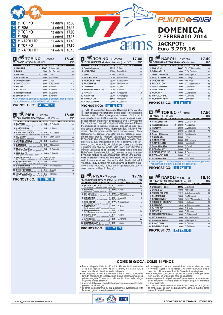1 2 3 4 5 6 7 5° TORINO 6° PISA 6° TORINO 7° PISA 7° NAPOLI TR 8° TORINO 8° NAPOLI TR 1 TORINO - 5 corsa DOMENICA 16.30 16.45 17.00 17.15 17.40 17.50 18.10 (10 partenti) (13 partenti) (12 partenti) (10 partenti) (11 partenti) (13 partenti) (14 partenti) 2 FEBBRAIO 2014 JACKPOT: Euro 3.793,16 3 16.30 PR. GLADIO - V7 (Cat. G) - M. 1600 TRIS TORINO - 6 corsa CAVALLO IN GARA, METRI, DRIVER E MIGLIOR TEMPO NEI 3 MESI 2 I I TRIS CAVALLO, STECCATO, PESO, FANTINO, PROPRIETARIO, GIUBBA E TERRENO GRADITO 1 BASTIANI 9 55 C.Colombi NV NV Razza Dormello Olgiata - g. bianca croce e b. rosso 2 CAPTAIN MAY 2 55 N.Pinna 11 55 A.D.Migheli T 8 55 Cr.Di Stasio NV 5 JOHNNY CASTLE 12 53 D.Migliore NV 6 KHARITIES 10 52 T.Scardino T 7 Malthus Red Kerr 13 55 M.Colombi NV Sig.ra C. Marzi - g.,b.ne.,cr. fuc.,m.str.ne.ar 3 CRACKING CHOICE Sig.ra G. Mini - g. e b. bianco, croce di Lorena verde 4 IVO DZIMA Stala Antilop - g. gia.V rossa Scud. Concarena - g. e .b gia. palle ne. Aston House Stud - g. blu, man. cer. blu-ve., b. verde Sig. A. De Palma - giubba blue, berretto blue 8 MARSHADE 5 56 1/2 C.Fiocchi NV 9 ORO D'IRLANDA 6 52 /2 A.Fele NV 10 PRIDE AND JOY A 1 58 D.Perovic 11 SHAMAR LOVE 7 55 W.Gambarota NV 12 Silent Footsteps 3 55 S.Sulas NV A 4 55 F.Bossa T Intra - giubba nera, fasce e b. bianco 1 Sig. R. Staderini - g. bordeaux, st. verdi, man. bord., b. verde Sig. C. Lanfranchi - g. gia. tria. e b. blu, m. gi- blu Scud. Briantea - g. bianca stella verde b. verde Sig.ra N. Baglini - giubba e berr. rombi ve-gia, maniche gialle 13 TROPICAL SONG Sig. C. Lanfranchi - g. gia. tria. e b. blu, m. gi- blu PRONOSTICO: I I 1 10 8 1 2 3 4 5 6 7 8 9 10 11 12 Ornette Coleman NEGROTTO NU BLEU INDY KRONOS NICHOLAS CAGE PALOMAR LB I AM GRIF NOBLE NORD FRO (AP) ISAAK BI NADIR JET MARLON OM NAPOLEON BAR 2620 2620 2620 2620 2620 2620 2620 2620 2620 2620 2640 2640 G.Riccio Santo Mollo Fr.Facci Fed.Esposito R.Vecchione T.Di Lorenzo M.Cheli A.Farolfi A.Raspante R.Andreghetti P.Gubellini A.Guzzinati NAPOLI - 7 corsa — — — — — — — 16.2 17.1 — 17.1 — 1 2 3 4 5 6 7 8 9 10 11 MIGLIO (AP) ORIANA BLUE Lorenz Del Ronco PICCOLAROBYTOR OTTONE JET PICK AND GO LANGDON GRIF LA VIDA LOCA NOVARICA PRISCILLA ZAK MURUROA AS (AP) PRONOSTICO: PRONOSTICO: 12 5 11 16.45 PR. CAM.DI COMM.PISA-V7 (Cond.) - M. 1500 p.m. 5 T ’attività agonistica torna allo Stupinigi di Torino che per l’occasione propone quale clou, l’interessante memorial Barbetta, ex premio Inverno. Si tratta di una maratona sui 2620 metri che vede impegnati dodici tra i migliori indigeni in circolazione che si avvieranno tra i nastri, con due estremi penalizzati a rendere 20 metri. Scorrendo la perizia, il nostro pronostico non può che essere orientato verso Napoleon Bar. Il figlio di Varenne, che alla prima uscita con il nuovo trainer Claus Hollmann, ha destato una notevole impressione, quando, nel gran premio “Nazioni” disputato a Napoli è giunto secondo alle spalle di Mack Grace Sm. Adesso, considerata la sua predisposizione nello schema e gli avversari, ci sono tutte le condizioni per tornare a calcare il gradino più alto del podio. Allo start, può sfruttare i metri di vantaggio lo specialista Nicholas Cage, che con Roby Vecchione in sediolo può provare la fuga in avanti ma può ambire al successo anche Marlon Om, annunciato in grande ordine dal suo team. Tra gli altri meritevoli di una menzione citiamo il rodato Nadir Jet ed il “vecchio” Indy Kronos ma consigliamo di tenere d’occhio anche Negrotto, reduce da una prestazione da circoletto rosso a Napoli. (Mgov) L 4 PISA - 7 corsa 17.15 PR. RISTORANTE RINO-V7 (Disc.) - M. 1500 p.m. 17.40 PR. P.GARIBALDI-PVBOA V7 (Cat. A/B) - M. 1600 TRIS CAVALLO IN GARA, METRI, DRIVER E MIGLIOR TEMPO NEI 3 MESI I I 4 10 1 PISA - 6 corsa TRIS CAVALLO IN GARA, METRI, DRIVER E MIGLIOR TEMPO NEI 3 MESI 1 LINUS BIP A 1600 E.Vessichelli 15.6 2 PARISI 1600 Fed.Esposito — 3 MAGHAT A 1600 G.Riccio — 4 PEACH PLANT 1600 P.Gubellini — 5 Odaiquiria Varlo 1600 D.Nuti 17.3 6 ORAZIO GK (P) 1600 A.Guzzinati 16.3 7 PALAIA 1600 P.Bojino 17.4 8 NADINO (A) 1600 S.F.Mollo 15.5 9 Principessa Rum 1600 M.Lovera — 10 LEGIER MB (P) 1600 E.Parenti — • Non vengono considerati rapporti di scuderia che, pertanto, non rilevano in ordine agli esiti del concorso; PRONOSTICO: 17.00 PR. E.E M.BARBETTA V7 (Hand. Inv. nastri) - M. 2620 TRIS CAVALLO, STECCATO, PESO, FANTINO, PROPRIETARIO, GIUBBA E TERRENO GRADITO 6 1600 1600 1600 1600 1600 1600 1600 1600 1600 1600 1600 3 Gior.D'Alessandro C.De Cristofaro M.Minopoli Jr V.Luongo Ant.Velotti V.D'Alessandro Jr G.Di Nardo R.Palomba D.Di Stefano A.Di Nardo Gp.Maisto 12.8 14.0 15.9 13.8 13.3 13.8 12.8 12.1 14.2 12.8 14.2 I9I8 TORINO - 8 corsa 17.50 PR. HOMER - V7 - M. 2060 TRIS CAVALLO IN GARA, METRI, DRIVER E MIGLIOR TEMPO NEI 3 MESI 1 Rolling Stonedif 2060 S.Di Fede Jr — 2 Rapport Joyeuse A 2060 A.Guzzinati — 3 REALINO 2060 E.Vessichelli 17.3 4 RIZAL 2060 C.Recupero 17.6 5 Report Di Azzurra 2060 Fed.Esposito — 6 RAISSA VOL 2060 L.Ferro 17.8 7 ROMEO D'ESI 2060 T.Di Lorenzo — 8 ROXY DEL RIO 2060 Santo Mollo — 9 Record Nord Fro 2060 A.Farolfi 18.3 10 RODARO JET 2060 G.Riccio — 11 RETOUR JOYEUSE A 2060 A.Demuru 18.3 12 REGINA DEL BAR 2060 D.Nuti — 13 ROTARY CLUB 2060 P.Gubellini — • Non vengono considerati rapporti di scuderia che, pertanto, non rilevano in ordine agli esiti del concorso; PRONOSTICO: 7 I I 2 13 5 NAPOLI - 8 corsa 18.10 PR. P. DANTE TRIS STR V7 (Cat. F) - M. 1600 TRIS CAVALLO IN GARA, METRI, DRIVER E MIGLIOR TEMPO NEI 3 MESI 1 TALE HITCHCOCK 4 61 2 SEDRIANO 8 60 /2 A.Fiori B 3 SIR SPENCER 1 60 1/2 L.Maniezzi T 4 DIMONTINA 6 59 T 5 RED SPIRIT 10 6 CIANCHINO 3 57 S.Sulas NV 7 Martyenne Desert 7 54 N.Pinna NV 8 REGINA BEA 2 53 A.Deias M 9 GAMBLING 9 52 D.Perovic 5 50 P.Salis F.Bossa Sig. A. Ciampa - g gia dis bia,manbia, ber bia gia 1 Razza Latina - g. e man. verdi cr. e b. bianco Scud. La Clementina - g. bia. doppi br. turch-blu croce S.Andrea turch.blu b. blu G