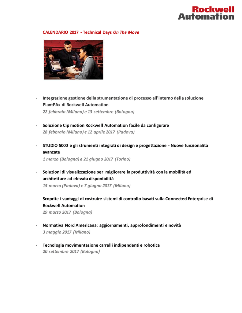 CALENDARIO 2017 - Technical Days On The Move - Integrazione gestione della strumentazione di processo all'interno della soluzione PlantPAx di Rockwell Automation 22 febbraio (Milano) e 13 settembre (Bologna) - Soluzione Cip motion Rockwell Automation facile da configurare 28 febbraio (Milano) e 12 aprile 2017 (Padova) - STUDIO 5000 e gli strumenti integrati di design e progettazione - Nuove funzionalità avanzate 1 marzo (Bologna) e 21 giugno 2017 (Torino) - Soluzioni di visualizzazione per migliorare la produttività con la mobilità ed architetture ad elevata disponibilità 15 marzo (Padova) e 7 giugno 2017 (Milano) - Scoprite i vantaggi di costruire sistemi di controllo basati sulla Connected Enterprise di Rockwell Automation 29 marzo 2017 (Bologna) - Normativa Nord Americana: aggiornamenti, approfondimenti e novità 3 maggio 2017 (Milano) - Tecnologia movimentazione carrelli indipendenti e robotica 20 settembre 2017 (Bologna)