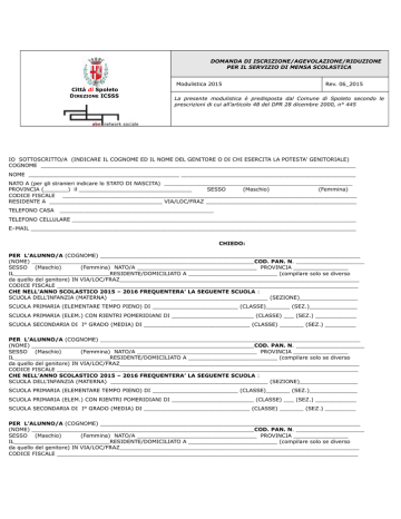 DOMANDA DI ISCRIZIONE/AGEVOLAZIONE/RIDUZIONE PER IL SERVIZIO DI MENSA SCOLASTICA Città di Spoleto DIREZIONE ICSSS Modulistica 2015 Rev. 06_2015 La presente modulistica è predisposta dal Comune di Spoleto secondo le prescrizioni di cui all’articolo 48 del DPR 28 dicembre 2000, n° 445 IO SOTTOSCRITTO/A (INDICARE IL COGNOME ED IL NOME DEL GENITORE O DI CHI ESERCITA LA POTESTA’ GENITORIALE) COGNOME ____________________________________________________________________________________________ NOME ____________________________________________ ___________________________________________________ NATO A (per gli stranieri indicare lo STATO DI NASCITA) _______________________________________________________ PROVINCIA (_______) il _________________________________ SESSO (Maschio) (Femmina) CODICE FISCALE ______________________________________________________________________________________ RESIDENTE A _________________________________ VIA/LOC/FRAZ ____________________________________________ TELEFONO CASA _____________________________________________ TELEFONO CELLULARE ___________________________________________________________________________________ E–MAIL _______________________________________________________________________________________________ CHIEDO: PER L’ALUNNO/A (COGNOME) ____________________________________________________________________________ (NOME) _________________________________________________________________COD. PAN. N. ____________________ SESSO (Maschio) (Femmina) NATO/A ___________________________________ PROVINCIA ________________ IL____________________________RESIDENTE/DOMICILIATO A __________________________ (compilare solo se diverso da quello del genitore) IN VIA/LOC/FRAZ______________________________________________________________________ CODICE FISCALE ________________________________________________________________________________________ CHE NELL’ANNO SCOLASTICO 2015 – 2016 FREQUENTERA’ LA SEGUENTE SCUOLA : SCUOLA DELL’INFANZIA (MATERNA) ______________________________________________ (SEZIONE)_________________ SCUOLA PRIMARIA (ELEMENTARE TEMPO PIENO) DI _________________________ (CLASSE)_______ (SEZ.)______________ SCUOLA PRIMARIA (ELEM.) CON RIENTRI POMERIDIANI DI ________________________ (CLASSE) ___ (SEZ.) ____________ SCUOLA SECONDARIA DI I° GRADO (MEDIA) DI _______________________________ (CLASSE) _______ (SEZ.) _________ PER L’ALUNNO/A (COGNOME) ____________________________________________________________________________ (NOME) _________________________________________________________________COD. PAN. N. ____________________ SESSO (Maschio) (Femmina) NATO/A ___________________________________ PROVINCIA ________________ IL____________________________RESIDENTE/DOMICILIATO A __________________________ (compilare solo se diverso da quello del genitore) IN VIA/LOC/FRAZ______________________________________________________________________ CODICE FISCALE ________________________________________________________________________________________ CHE NELL’ANNO SCOLASTICO 2015 – 2016 FREQUENTERA’ LA SEGUENTE SCUOLA : SCUOLA DELL’INFANZIA (MATERNA) ______________________________________________ (SEZIONE)_________________ SCUOLA PRIMARIA (ELEMENTARE TEMPO PIENO) DI _________________________ (CLASSE)_______ (SEZ.)______________ SCUOLA PRIMARIA (ELEM.) CON RIENTRI POMERIDIANI DI ________________________ (CLASSE) ___ (SEZ.) ____________ SCUOLA SECONDARIA DI I° GRADO (MEDIA) DI _______________________________ (CLASSE) _______ (SEZ.) _________ PER L’ALUNNO/A (COGNOME) ____________________________________________________________________________ (NOME) _________________________________________________________________COD. PAN. N. ____________________ SESSO (Maschio) (Femmina) NATO/A ___________________________________ PROVINCIA ________________ IL____________________________RESIDENTE/DOMICILIATO A __________________________ (compilare solo se diverso da quello del genitore) IN VIA/LOC/FRAZ______________________________________________________________________ CODICE FISCALE ________________________________________________________________________________________ CHE NELL’ANNO SCOLASTICO 2015 - 2016 FREQUENTERA’ LA SEGUENTE SCUOLA : SCUOLA DELL’INFANZIA (MATERNA) ______________________________________________ (SEZIONE)_________________ SCUOLA PRIMARIA (ELEMENTARE TEMPO PIENO) DI _________________________ (CLASSE)_______ (SEZ.)______________ SCUOLA PRIMARIA (ELEM.) CON RIENTRI POMERIDIANI DI ________________________ (CLASSE) ___ (SEZ.) ____________ SCUOLA SECONDARIA DI I° GRADO (MEDIA) DI _______________________________ (CLASSE) _______ (SEZ.) _________ SEZIONE A UNA NUOVA ISCRIZIONE AL SERVIZIO DI MENSA SCOLASTICA O ISCRIZIONE AD UN DIVERSO CICLO SCOLASTICO LA CONFERMA DELL’ISCRIZIONE AL SERVIZIO INOLTRE MI IMPEGNO A comunicare eventuali variazioni di: numero di telefono cellulare, scuola, dieta speciale, indirizzo o eventuale rinuncia al ser vizio. SEZIONE B DI VOLER USUFRUIRE DELLE AGEVOLAZIONI CONCESSE DAL COMUNE DI SPOLETO PER IL SERVIZIO DI MENSA SCOLASTICA A.S. 2015 - 2016. N.B. – QUESTA PARTE DEVE ESSERE COMPILATA, OGNI ANNO, DALLE PERSONE CHE INTENDONO CHIEDERE LE AGEVOLAZIONI CONCESSE DAL COMUNE SULLA BASE DELL’ I.S.E.E. DEL NUCLEO FAMILIARE, ALTRIMENTI SI INTENDE APPLICATA LA TARIFFA MASSIMA DI € 4,84 A tal fine, consapevole che le dichiarazioni false, la falsità negli atti e l’uso di atti falsi comportano l’applicazione delle sanzioni penali previste dall’art.76 del DPR 28 dicembre 2000 n.445, e la decadenza dai benefici conseguenti DICHIARO 1. 2. CHE IL MIO NUCLEO FAMILIARE HA UN INDICATORE DELLA SITUAZIONE ECONOMICA EQUIVALENTE (I.S.E.E.) PARI AD €._____________________________________________,00 COME RISULTA DALL’ATTESTAZIONE ISE/ISEE RILASCIATA DAL CAAF ________________________________________________________, IN DATA ______________________________ CHE DI CONSEGUENZA SONO RICOMPRESO NELLA SEGUENTE FASCIA DI AGE