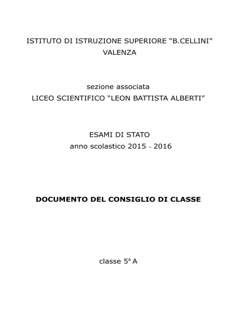 ISTITUTO DI ISTRUZIONE SUPERIORE “B.CELLINI” VALENZA sezione associata LICEO SCIENTIFICO “LEON BATTISTA ALBERTI” ESAMI DI STATO anno scolastico 2015 – 2016 DOCUMENTO DEL CONSIGLIO DI CLASSE classe 5a A FINALITÀ EDUCATIVE DELL’ISTITUTO L’azione educativa dell’Istituto – volta alla maturazione umana, civile e sociale della persona nel pieno rispetto delle diversit;< culturali, etniche e religiose – si pone come obiettivo generale la formazione umana e culturale degli alunni guidandoli, nella delicata fase di crescita e maturazione della loro personalit;<, a relazioni interpersonali consapevoli all’interno e all’esterno della realt;< scolastica. Tali processi di crescita umana e culturale sono attuati mediante una costante interazione tra conoscenza teorica e pratica e hanno lo scopo di rendere il discente consapevole del valore del sapere acquisito nel corso degli studi e del ruolo che esso puM< svolgere nei progetti individuali di vita. PROFILO DELL’INDIRIZZO Il liceo scientifico è finalizzato allo studio del nesso tra cultura scientifica e tradizione umanistica. Favorisce l’acquisizione delle conoscenze e dei metodi propri della matematica, della fisica e delle scienze naturali. Guida lo studente ad approfondire e a sviluppare le conoscenze e le abilit; e a maturare le competenze necessarie per seguire lo sviluppo della ricerca scientifica e tecnologica e per individuare le interazioni tra le diverse forme del sapere, assicurando la padronanza dei linguaggi, delle tecniche e delle metodologie relative, anche attraverso la pratica laboratoriale. PIANO QUINQUENNALE DI STUDIO Disciplina I II III IV V Lingua e letteratura italiana 4 4 4 4 4 Lingua e cultura latina 3 3 3 3 3 Lingua e cultura straniera 3 3 3 3 3 Storia e Geografia 3 3 Storia 2 2 2 Filosofia 3 3 3 Matematica 5 5 4 4 4 Fisica 2 2 3 3 3 Scienze naturali 2 2 3 3 3 Disegno e storia dell’arte 2 2 2 2 2 Scienze motorie e sportive 2 2 2 2 2 Religione cattolica o attivit;< alternative 1 1 1 1 1 2 PRESENTAZIONE DELLA CLASSE La classe 5°A è costituita da 24 alunni (12 maschi e 12 femmine). La cronistoria della classe negli ultimi tre anni è sinteticamente descritta nella seguente tabella: Anno Scolastico Iscritti Ripetenti o trasf. Totale Promossi Non promossi Ritirati o trasf 2013/2014 25 / 25 23 1 1 2014/2015 23 3 26 25 1 / 2015/2016 25 / 24 1 La classe, nel corso del triennio, si è avvalsa di una positiva continuit;< didattica e ha accolto nel suo percorso liceale con apertura e generosa disponibilità qualche alunno proveniente da altra realtà scolastica. Gli studenti, all'inizio tendenzialmente vivaci sul piano disciplinare e comunicativo-culturale, hanno progressivamente acquisito un comportamento scolastico consapevole. Formalmente adeguati sul piano dell'ascolto, gli alunni si sono dimostrati nella generalità anche intellettualmente pronti e hanno costruito nel corso degli anni un'efficace adesione all'offerta formativa, sostenuta nell'insieme della classe da apprezzabile volontà di apprendimento, nonostante la tendenza di alcuni ad un approccio prevalentemente pragmatico ai contenuti disciplinari. La maggioranza degli studenti, più volitiva e determinata, ha investito con successo le personali risorse intellettuali e applicative, mentre in qualche caso si è cercato di ottenere un profitto senza un eccessivo dispendio di forze. Talora ha influito in modo determinante sulla padronanza conoscitiva il metodo dispersivo. I docenti del Consiglio di classe hanno lavorato in condizioni globalmente agevoli e comunicativamente positive. Il prodotto culturale di tale attivit;< tuttavia, nella generalit;<, non ha sempre avuto carattere di solidit;< e sistematicit;< contenutistico-concettuale. La classe, misurata nel corso degli anni con criteri di valutazione sempre corrispondenti agli obiettivi programmatici, ha retto con esiti complessivamente soddisfacenti il ritmo di un'attività didattica regolare. Il profilo della classe, dunque, si delinea per fasce di livello come segue: un primo livello, rappresentato da alcuni alunni dotati di buone capacit; intellettive, profondamente interessati e costantemente impegnati, è di fascia buona e anche ottima; un secondo livello, rappresentato da alunni con attitudini non propriamente omogenee o omogeneamente applicate, ma pienamente inseriti nell'attivit; didattica, è di fascia più che sufficiente e discreta; un terzo livello, rappresentato da alunni il cui percorso scolastico è stato poco incisivo sul piano dell'assimilazione e del rendimento, è di fascia variabile e con tratti di disomogeneit;. La classe, nel corso dell’anno, ha aderito in modo diversificato alle seguenti iniziative: Stage a Portsmouth; visita d'istruzione a Berlino; visita d'istruzione all'Expo 2015; visita d'istruzione a Cologno M. presso gli studi Mediaset ,durante il programma televisivo Caduta libera; convegno sulla letteratura a San Salvatore Monferrato; conferenza Diventiamo cittadini europei; osservatorio dei giovani editori; incontro con il vescovo S. E. Guido Gallese sull'Enciclica “Laudato si” di Papa Francesco; visione Film ( Into darkness/ Trene de vie/ Un posto sicuro); spettacolo teatrale "Pride and Prejudice". 3 Un consistente numero di alunni ha aderito al corso di geopolitica, organizzato dal Dirigente della Scuola Media “Pascoli”, in collaborazione con “CE.ST.IN.GEO” (Centro Studi Internazionali di Geopolitica, dell’Universit;< Cattolica di Milano), focalizzato sulle tematiche: “IL TERRORISMO TRA INCUBO E REALTA'. La paura nella paura. Alcuni alunni della classe hanno inoltre partecipato ai seguenti progetti: “SCOMMETTIAMO CHE NON VINCI?” Per promuovere un uso corretto e responsabile del denaro; “SPETTACOLO NATALIZIO” ALBERTI'S GOT TALENT. Gli alunni hanno seguito le seguenti conferenze di carattere umanistico e scientifico: UNISTEM 2016 a Novara ,le nuove frontiere della ricerca sulle cellule staminali, organizzata dalla Universit;< degli S