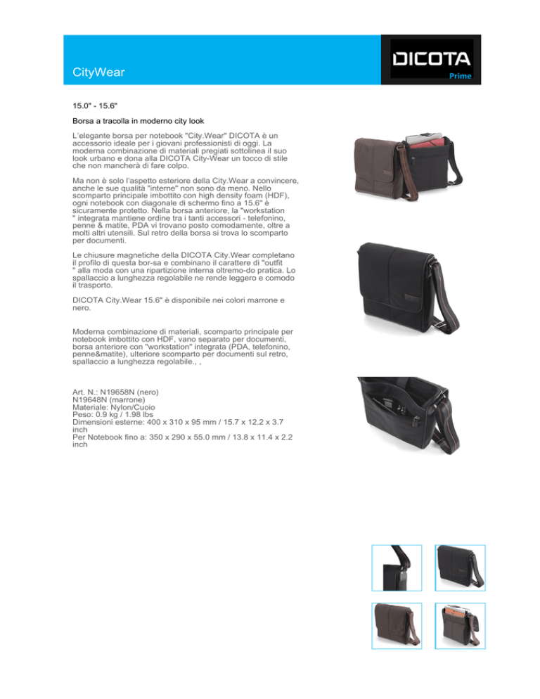 CityWear 15.0" - 15.6" Borsa a tracolla in moderno city look L’elegante borsa per notebook "City.Wear" DICOTA è un accessorio ideale per i giovani professionisti di oggi. La moderna combinazione di materiali pregiati sottolinea il suo look urbano e dona alla DICOTA City-Wear un tocco di stile che non mancherà di fare colpo. Ma non è solo l’aspetto esteriore della City.Wear a convincere, anche le sue qualità "interne" non sono da meno. Nello scomparto principale imbottito con high density foam (HDF), ogni notebook con diagonale di schermo fino a 15.6" è sicuramente protetto. Nella borsa anteriore, la "workstation " integrata mantiene ordine tra i tanti accessori - telefonino, penne & matite, PDA vi trovano posto comodamente, oltre a molti altri utensili. Sul retro della borsa si trova lo scomparto per documenti. Le chiusure magnetiche della DICOTA City.Wear completano il profilo di questa bor-sa e combinano il carattere di "outfit " alla moda con una ripartizione interna oltremo-do pratica. Lo spallaccio a lunghezza regolabile ne rende leggero e comodo il trasporto. DICOTA City.Wear 15.6" è disponibile nei colori marrone e nero. Moderna combinazione di materiali, scomparto principale per notebook imbottito con HDF, vano separato per documenti, borsa anteriore con "workstation" integrata (PDA, telefonino, penne&matite), ulteriore scomparto per documenti sul retro, spallaccio a lunghezza regolabile., , Art. N.: N19658N (nero) N19648N (marrone) Materiale: Nylon/Cuoio Peso: 0.9 kg / 1.98 lbs Dimensioni esterne: 400 x 310 x 95 mm / 15.7 x 12.2 x 3.7 inch Per Notebook fino a: 350 x 290 x 55.0 mm / 13.8 x 11.4 x 2.2 inch