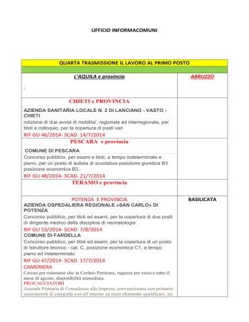 UFFICIO INFORMACOMUNI QUARTA TRASMISSIONE IL LAVORO AL PRIMO POSTO L’AQUILA e provincia ABRUZZO / CHIETI e PROVINCIA AZIENDA SANITARIA LOCALE N. 2 DI LANCIANO - VASTO CHIETI ndizione di due avvisi di mobilita', regionale ed interregionale, per titoli e colloquio, per la copertura di posti vari RIF GU 46/2014- SCAD. 14/7/2014 PESCARA e provincia COMUNE DI PESCARA Concorso pubblico, per esami e titoli, a tempo indeterminato e pieno, per un posto di autista di scuolabus posizione giuridica B3 posizione economica B3. RIF GU 48/2014- SCAD. 21/7/2014 TERAMO e provincia POTENZA E PROVINCIA AZIENDA OSPEDALIERA REGIONALE «SAN CARLO» DI POTENZA Concorso pubblico, per titoli ed esami, per la copertura di due posti di dirigente medico della disciplina di neonatologia RIF GU 53/2014- SCAD. 7/8/2014 COMUNE DI FARDELLA Concorso pubblico, per titoli ed esami, per la copertura di un posto di Istruttore tecnico - cat. C, posizione economica C1, a tempo pieno ed indeterminato RIF GU 47/2014- SCAD. 17/7/2014 CAMERIERA Cercasi per ristorante sito in Corleto Perticara, ragazza per extra e tutto il mese di agosto, disponibilità immediata. PROCACCIATORI Azienda Primaria di Consulenza alle Imprese, convenzionata con primarie associazioni di categoria con all’interno un team altamente qualificato, sta BASILICATA ricercando professionisti (commercialisti ed avvocati), neo-laureati in materie giuridiche e contabile, nonché agenti territoriali per espandere il proprio pacchetto clienti ed affidarne uno autonomo da gestire in tema di anatocismo bancario, usura bancaria (mutui, leasing, cessioni del quinto dello stipendio, carte revolving, ecc.).Il candidato è un soggetto dinamico, autonomo e con alta propensione al lavoro per risultato. SI RICERCANO CAPI AREA con esperienza nella gestione del personale.Ottimi margini di guadagno, con formazione ed aggiornamenti gratuiti. INFO www.tiscali.it PROGRAMMATORE Gamma Services è una società operante nel settore dell'Information & Communication Technology - ICT - che, avvalendosi dell'apporto di professionisti fortemente motivati ad utilizzare le loro esperienze pluriennali al fine di rinnovare e agevolare tecnologicamente i tradizionali metodi di lavoro, mira a soddisfare le esigenze di un mercato sempre più flessibile e veloce. Per apertura nuova sede , stiamo ricercando la seguente figura professionale: Programmatore Java Junior Sono richieste le seguenti competenze: Il candidato ideale è un neolaureato che abbia voglia di crescere professionalmente ed altamente specializzato. Si richiede una precedente esperienza di 6 mesi su almeno uno di questi framework Jboss, Struts, ed applicazioni web basate. Richiesta la conoscenza di JSP, HTML, CSS - Hibernate - JQuery - EJB 3.X - XML, XSD, XSLT , Web Service. Conoscenze su SQL , Mysql 5.X e Oracle11g - Ambiente di sviluppo eclipse - NetBeans.Sede di lavoro: Viggiano (Potenza)I candidati interessati possono inviare un dettagliato CV dettagliato in formato europeo (file word), citando il riferimento (Dev Java-Junior_PZ), ed il consenso al trattamento dei dati personali a [email protected] ESTETISTA AZIENDA CERCA ESTETISTA CON ESPERIENZA IN CENTRI ESTETICI. INVIARE CURRICULUM CON FOTO A [email protected] OPERATORI CALL CENTER Call Center con sede a Potenza, ricerca, per ampliamento organico, ambosessi di età compresa tra i 22 e 60 anni per campagna outbound diretta a clienti residenziali e business principali brand di energia e gas e telefonia. Richiesta disponibilità immediata, serietà, spigliatezza, voglia di lavorare . Si offre formazione, buoni incentivi e possibilità di crescita professionale, con inserimento immediato in azienda. Turni part-time 9,30 - 13,45 - 16,30 21,00. Inviare curriculum o chiamare al 346 8037896 per fissare un colloquio informativo. CONSULENTI ASSICURATIVI Nexfin, Agenzia Finanziaria e Assicurativa, specializzata nella promozione e vendita di prodotti assicurativi e finanziari, ricerca per le province di : Potenza e Cosenza N. 5 CONSULENTI per il potenziamento della rete commerciale, che forniranno ai clienti un servizio di consulenza professionale, finalizzato all'individuazione di prodotti previdenziali e finanziari che possano soddisfare le loro specifiche esigenze. Si offre: • opportunità di operare in una realtà aziendale in pieno sviluppo, • formazione specialistica, • affiancamento sul campo, vantaggiose prospettive di carriera, • retribuzione di sicuro interesse (esclusivamente provvigionale). Si richiede possesso di diploma e/o laurea, costituirà titolo preferenziale la residenza nelle sedi di : Lauria, Lagonegro, Scalea, Diamante, Belvedere M.mo. La ricerca è rivolta a persone di entrambi i sessi (legge 903/77). I candidati possono inviare il cv, corredato di autorizzazione al trattamento dei dati personali, oppure chiamare il centro formazione al num. 3355601446 SEGRETARIA Agenzia per pratiche auto ricerca personale con la mansione di segretaria/o per la gestione di appuntamenti, telefonate ed accoglienza clienti. Si richiede buona conoscenza dell'uso dei maggiori software di computer, puntualità, serietà e cordialità. Gradita una minima esperienza nel settore. Sede lavorativa: Potenza. Si offre contratto a progetto. Per candidarsi inviare cv a:[email protected] TUBISTI per importante azienda metalmeccanica ricerchiamo Tubisti con comprovata esperienza nella preparazione, montaggio e saldatura a tig, elettrodo ed ossiacetilene di tubazioni/raccordi idraulici e pneumatici di diversi diametri ed in materiali metallici. E' titolo preferenziale la conoscenza del disegno tecnico, il possesso dei patentini per le saldature sopraindicate e l'aver lavorato su cantieri industriali. Si richiede disponibilità a lavoro full-time con orario giornaliero, offresi contratto a tempo determinato di lunga durata e retribuzione commisurata alle effettive capacità professionali. Sede di lavoro: provincia di Potenza INFO www.tiscali.it ADDETTA VENDITE Diètnatural centro di nutrizio