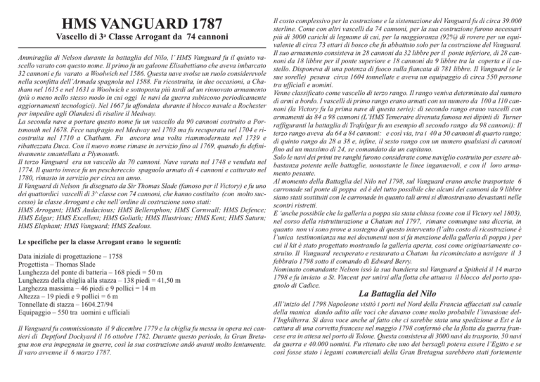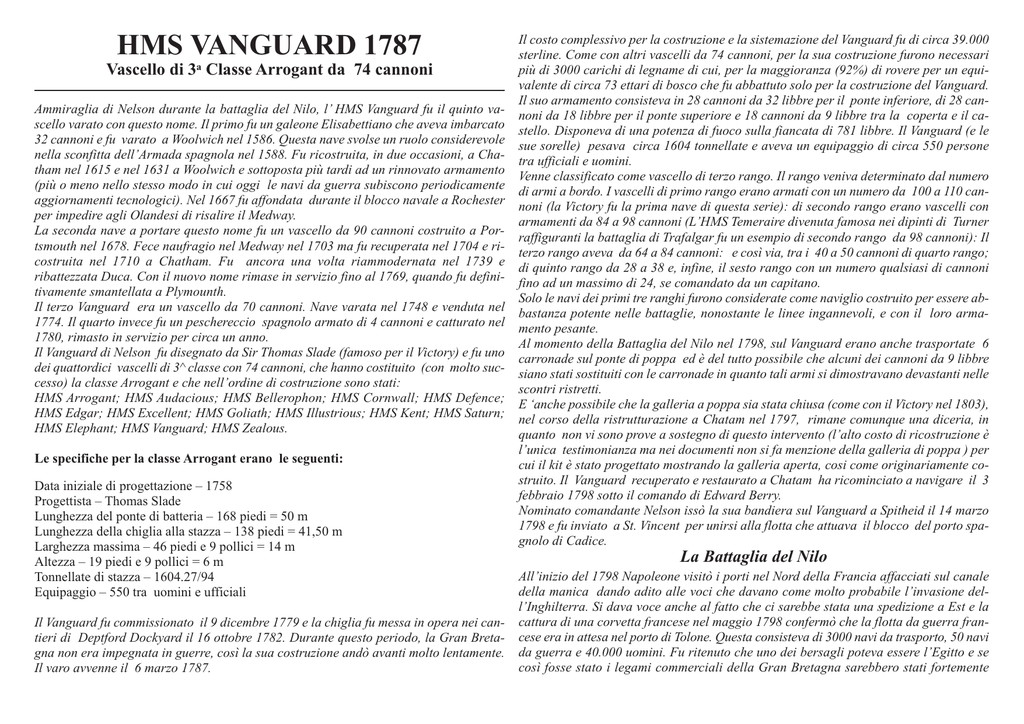 HMS VANGUARD 1787 Vascello di 3a Classe Arrogant da 74 cannoni Ammiraglia di Nelson durante la battaglia del Nilo, l’ HMS Vanguard fu il quinto vascello varato con questo nome. Il primo fu un galeone Elisabettiano che aveva imbarcato 32 cannoni e fu varato a Woolwich nel 1586. Questa nave svolse un ruolo considerevole nella sconfitta dell’Armada spagnola nel 1588. Fu ricostruita, in due occasioni, a Chatham nel 1615 e nel 1631 a Woolwich e sottoposta più tardi ad un rinnovato armamento (più o meno nello stesso modo in cui oggi le navi da guerra subiscono periodicamente aggiornamenti tecnologici). Nel 1667 fu affondata durante il blocco navale a Rochester per impedire agli Olandesi di risalire il Medway. La seconda nave a portare questo nome fu un vascello da 90 cannoni costruito a Portsmouth nel 1678. Fece naufragio nel Medway nel 1703 ma fu recuperata nel 1704 e ricostruita nel 1710 a Chatham. Fu ancora una volta riammodernata nel 1739 e ribattezzata Duca. Con il nuovo nome rimase in servizio fino al 1769, quando fu definitivamente smantellata a Plymounth. Il terzo Vanguard era un vascello da 70 cannoni. Nave varata nel 1748 e venduta nel 1774. Il quarto invece fu un peschereccio spagnolo armato di 4 cannoni e catturato nel 1780, rimasto in servizio per circa un anno. Il Vanguard di Nelson fu disegnato da Sir Thomas Slade (famoso per il Victory) e fu uno dei quattordici vascelli di 3^ classe con 74 cannoni, che hanno costituito (con molto successo) la classe Arrogant e che nell’ordine di costruzione sono stati: HMS Arrogant; HMS Audacious; HMS Bellerophon; HMS Cornwall; HMS Defence; HMS Edgar; HMS Excellent; HMS Goliath; HMS Illustrious; HMS Kent; HMS Saturn; HMS Elephant; HMS Vanguard; HMS Zealous. Le specifiche per la classe Arrogant erano le seguenti: Data iniziale di progettazione – 1758 Progettista – Thomas Slade Lunghezza del ponte di batteria – 168 piedi = 50 m Lunghezza della chiglia alla stazza – 138 piedi = 41,50 m Larghezza massima – 46 piedi e 9 pollici = 14 m Altezza – 19 piedi e 9 pollici = 6 m Tonnellate di stazza – 1604.27/94 Equipaggio – 550 tra uomini e ufficiali Il Vanguard fu commissionato il 9 dicembre 1779 e la chiglia fu messa in opera nei cantieri di Deptford Dockyard il 16 ottobre 1782. Durante questo periodo, la Gran Bretagna non era impegnata in guerre, così la sua costruzione andò avanti molto lentamente. Il varo avvenne il 6 marzo 1787. Il costo complessivo per la costruzione e la sistemazione del Vanguard fu di circa 39.000 sterline. Come con altri vascelli da 74 cannoni, per la sua costruzione furono necessari più di 3000 carichi di legname di cui, per la maggioranza (92%) di rovere per un equivalente di circa 73 ettari di bosco che fu abbattuto solo per la costruzione del Vanguard. Il suo armamento consisteva in 28 cannoni da 32 libbre per il ponte inferiore, di 28 cannoni da 18 libbre per il ponte superiore e 18 cannoni da 9 libbre tra la coperta e il castello. Disponeva di una potenza di fuoco sulla fiancata di 781 libbre. Il Vanguard (e le sue sorelle) pesava circa 1604 tonnellate e aveva un equipaggio di circa 550 persone tra ufficiali e uomini. Venne classificato come vascello di terzo rango. Il rango veniva determinato dal numero di armi a bordo. I vascelli di primo rango erano armati con un numero da 100 a 110 cannoni (la Victory fu la prima nave di questa serie): di secondo rango erano vascelli con armamenti da 84 a 98 cannoni (L’HMS Temeraire divenuta famosa nei dipinti di Turner raffiguranti la battaglia di Trafalgar fu un esempio di secondo rango da 98 cannoni): Il terzo rango aveva da 64 a 84 cannoni: e così via, tra i 40 a 50 cannoni di quarto rango; di quinto rango da 28 a 38 e, infine, il sesto rango con un numero qualsiasi di cannoni fino ad un massimo di 24, se comandato da un capitano. Solo le navi dei primi tre ranghi furono considerate come naviglio costruito per essere abbastanza potente nelle battaglie, nonostante le linee ingannevoli, e con il loro armamento pesante. Al momento della Battaglia del Nilo nel 1798, sul Vanguard erano anche trasportate 6 carronade sul ponte di poppa ed è del tutto possibile che alcuni dei cannoni da 9 libbre siano stati sostituiti con le carronade in quanto tali armi si dimostravano devastanti nelle scontri ristretti. E ‘anche possibile che la galleria a poppa sia stata chiusa (come con il Victory nel 1803), nel corso della ristrutturazione a Chatam nel 1797, rimane comunque una diceria, in quanto non vi sono prove a sostegno di questo intervento (l’alto costo di ricostruzione è l’unica testimonianza ma nei documenti non si fa menzione della galleria di poppa ) per cui il kit è stato progettato mostrando la galleria aperta, cosi come originariamente costruito. Il Vanguard recuperato e restaurato a Chatam ha ricominciato a navigare il 3 febbraio 1798 sotto il comando di Edward Berry. Nominato comandante Nelson issò la sua bandiera sul Vanguard a Spitheid il 14 marzo 1798 e fu inviato a St. Vincent per unirsi alla flotta che attuava il blocco del porto spagnolo di Cadice. La Battaglia del Nilo All’inizio del 1798 Napoleone visitò i porti nel Nord della Francia affacciati sul canale della manica dando adito alle voci che davano come molto probabile l’invasione dell’Inghilterra. Si dava voce anche al fatto che ci sarebbe stata una spedizione a Est e la cattura di una corvetta francese nel maggio 1798 confermò che la flotta da guerra francese era in attesa nel porto di Tolone. Questa consisteva di 3000 navi da trasporto, 50 navi da guerra e 40.000 uomini. Fu ritenuto che uno dei bersagli poteva essere l’Egitto e se così fosse stato i legami commerciali della Gran Bretagna sarebbero stati fortemente compromessi. La situazione rese indispensabile che la flotta britannica entrasse nuovamente nel mediterraneo. Il comandante in capo che stazionava a Capo S.Vincent, tenendo il blocco al porto di Cadice, apprese con molto piacere l’arrivo di Nelson con l’HMS Va