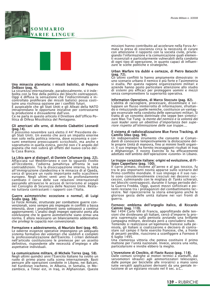 Rivista Militare n. 3/2008 missioni hanno contribuito ad accelerare nella Forza Armata la presa di coscienza circa la necessità di curare con attenzione il rapporto con la società civile, privilegiando l’informazione e la comunicazione quali elementi essenziali e particolarmente vulnerabili della condotta di ogni tipo di operazione, in quanto capaci di influenzare le scelte politiche e strategiche. Una minaccia planetaria: i missili balistici, di Peppino DeBiaso (pag. 4). La sicurezza internazionale, paradossalmente, si è indebolita con la fine della politica dei blocchi contrapposti. Oggi è diffusa la sensazione che l’indiscriminato e incontrollato proliferare dei missili balistici possa costituire una rischiosa opzione per i conflitti futuri. È auspicabile che gli Stati Uniti e gli Alleati della NATO intraprendano le opportune iniziative per contrastarne la produzione e dissuaderne dall’uso. Ce ne parla in questo articolo il Direttore dell’Ufficio Politica di Difesa Missilistica del Pentagono. Gli americani alle urne, di Antonio Ciabattini Leonardi (pag.14). Il prossimo novembre sarà eletto il 44° Presidente degli Stati Uniti. Un evento che avrà un impatto enorme non solo nella politica interna, dove economia e consumi emettono preoccupanti scricchiolii, ma anche e soprattutto in quella estera, perché non c’è angolo del pianeta che non subirà gli effetti del nuovo corso della Casa Bianca. La Libia apre al dialogo?, di Daniele Cellamare (pag. 22). Affacciata sul Mediterraneo e con lo sguardo rivolto all’Occidente, l’odierna Jamahiriya affronta le sue contraddizioni. Tra la disoccupazione interna, la lotta all’immigrazione clandestina e le minacce di al Qaeda, cerca di giocare un ruolo importante nello scacchiere europeo. Negli ultimi venti anni ha profondamente cambiato il corso delle sue relazioni internazionali passando attraverso le accuse di terrorismo al seggio nel Consiglio di Sicurezza delle Nazioni Unite. Restano tuttavia contrastanti i rapporti con l’Italia. Guerre asimmetriche: eccezione o norma?, di Luigi Scollo (pag. 38). Le Forze Armate, strutturate per combattere guerre convenzionali, sono sempre più impiegate in conflitti a bassa intensità, dove i procedimenti sono sottoposti a continui aggiornamenti. L’analisi degli impegni operativi porta alla conclusione che le guerre asimmetriche siano ormai una norma. È allora necessario un bilanciamento addestrativo che privilegi le capacità non convenzionali. Urban Warfare tra dubbi e certezze, di Pietro Batacchi (pag. 72). Gli ultimi conflitti lo hanno ampiamente dimostrato: in uno scenario urbano il nemico è più forte e l’asimmetria si esalta. Per questa ragione organizzazioni militari e aziende hanno posto particolare attenzione allo studio di sistemi più efficaci per proteggere uomini e mezzi senza compromettere la superiorità operativa. Information Operations, di Marco Stoccuto (pag. 82). L’abilità di raccogliere, processare, disseminare e sviluppare un flusso ininterrotto di informazioni, sfruttando o rintuzzando quelle nemiche, costituisce un vantaggio essenziale nella condotta delle operazioni militari. Si tratta di un concetto dottrinale che seppe ben sintetizzare Mao Tse Tung: la mente del nemico e la volontà dei suoi leader sono un obiettivo d’importanza ben superiore rispetto all’eliminazione delle sue truppe.... Il sistema di radiolocalizzazione Blue Force Tracking, di Camillo Sileo (pag. 94). Un indispensabile strumento che consente ai Comandanti di conoscere tempestivamente la dislocazione delle proprie Unità di manovra, fino ai minimi livelli organici. Il suo impiego ha fornito incoraggianti risultati in Iraq e Afghanistan. Il nostro Esercito lo ha efficacemente adottato nell’ambito dell’operazione «Leonte» in Libano. Le truppe corazzate italiane: origini ed evoluzione, di Filippo Cappellano (pag. 100). Il carro armato, insieme all’aereo e al gas tossico, fu tra le più importanti novità apparse sullo scenario del Primo conflitto mondiale. Il suo impiego e il suo ruolo sono considerevolmente cresciuti nei decenni successivi, culminando con le migliaia di Tanks schierati, nei blocchi contrapposti, durante il lungo periodo della Guerra Fredda. Oggi, questi mezzi sofisticati e potenti restano tra i protagonisti del combattimento terrestre. Nel ripercorrerne la storia emergono anche le gloriose gesta delle unità italiane nei vari fronti di guerra. Formazione e addestramento, di Maurizio Boni (pag. 46). Le odierne esigenze operative impongono un adeguato sistema formativo dei volontari che soddisfi e completi la professionalizzazione dell’Esercito. I criteri delineati nell’articolo costituiscono le premesse per un assetto definitivo, rispondente alle necessità d’impiego e alle aspettative individuali. Fornovo: emblema dell’orgoglio italico, di Riccardo Caimmi (pag. 110). Nel 1494 Carlo VIII di Francia, approfittando delle tensioni che dividevano gli Italiani, cercò d’imporre la propria supremazia sulla penisola avviando una brillante campagna militare, destinata però a concludersi male. Temendo si realizzasse un’egemonia francese sulla penisola, gli Italiani si coalizzarono e decisero di contrastare sul campo il forte esercito francese, che, a fronte di pesanti perdite, riuscirono a sconfiggere a Fornovo il 6 luglio 1495. Una clamorosa vittoria che poteva costituire il primo mattone per l’unità nazionale. Invece, ancora una volta, particolarismi e invidie ebbero la meglio. La comunicazione militare, di Michele Torres (pag. 58). Negli ultimi quindici anni l’Esercito Italiano ha svolto un ruolo di primo piano sulla scena internazionale. Basti pensare alle operazioni condotte in Libano, nei Balcani, nel Kurdistan iracheno, in Albania, in Somalia, in Mozambico, a Timor est, in Iraq, in Afghanistan. Queste L’invenzione di Ctesibio, di Flavio Russo (pag. 118). Dalle comuni siringhe ai motori termici a stantuffi, dai servomotori idraulici agli amm