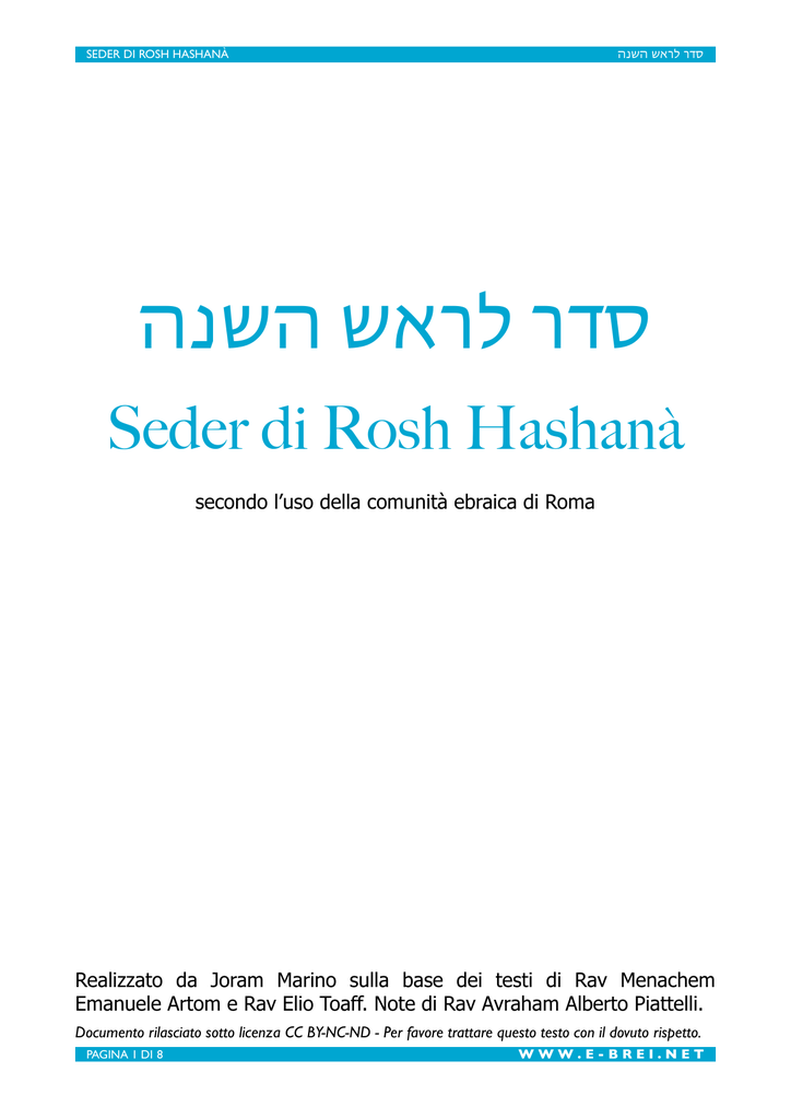 SEDER DI ROSH HASHANÀ סדר לראש השנה סדר לראש השנה Seder di Rosh Hashanà secondo l’uso della comunità ebraica di Roma Realizzato da Joram Marino sulla base dei testi di Rav Menachem Emanuele Artom e Rav Elio Toaff. Note di Rav Avraham Alberto Piattelli. Documento rilasciato sotto licenza CC BY-NC-ND - Per favore trattare questo testo con il dovuto rispetto. PAGINA 1 DI 8 WWW.E-BREI.NET SEDER DI ROSH HASHANÀ סדר לראש השנה Note al Seder di Rosh Hashanà L’usanza ebraica tanto diffusa di arricchire la mensa con cibi e pietanze particolari durante il giorno di Rosh Hashanà, quale segno di augurio e di benedizione, ha origine assai antica. Già nella Bibbia si trova qualche riferimento là dove si afferma: “Allora il molto onorato Nechemià ed Ezra, il sacerdote scriba, ed i leviti che ammaestravano il popolo dissero a tutto il popolo: "Questo giorno è santo per il Signore, vostro D-o. Non fate cordoglio e non piangete!". Poiché tutto il popolo piangeva ascoltando le parole della Legge egli aggiunse: "Andate, mangiate vivande grasse e bevete vini dolci e mandate pietanze a chi non ha niente di pronto, perché questo giorno è santo per il nostro Signore. Non affliggetevi, il gaudio del Signore è la vostra forza" (Nechemià 8, 9-10). In queste parole è chiaro il riferimento alla solennità e alla festività della giornata. Nel Talmud il riferimento assume connotati più chiari e netti. Vi si insegna, infatti: Abayé afferma: "Visto che è stato detto che il simbolo ha un significato reale – simanà miltà hi – ciascuno deve acquisire la corretta abitudine di mangiare all’inizio del nuovo anno zucca, finocchi, porri, bietola e datteri" (Talmud Bavlì Horaiot 12A e Keritot 6A). Rabbi Natronai Hagaon, in un suo responso, così scrive: "E circa quello che avete domandato, ossia di spiegarvi l’uso che noi abbiamo di prendere una testa di agnello e di mangiarlo nel giorno di Rosh Hashanà, è mia opinione che ciò sia di buon auspicio (Nachash letovà). I Saggi e tutti gli abitanti di Babilonia usano fare così: la sera di Rosh Hashanà si prende della carne o testa di agnello e si cuoce in una tisana o in qualche cosa di dolce, senza aggiungervi affatto aceto. Tutto ciò affinché l’anno a venire sia dolce e piacevole e non capiti in esso alcun malanno o disgrazia". Nel Machazor Vitry, compilato da rabbi Simcha, discepolo di Rashi, circa nel XIII secolo, si ricorda come: "Gli abitanti di Francia usano mangiare di Rosh Hashanà mele rosse, mentre in Provenza mangiano uva bianca, fichi bianchi, testa d’agnello ed ogni altra cosa nuova e prelibata come buon segno per tutto il popolo di Israele". Il Maharil (rabbi Ya’akov Halevi, 1365-1427) menziona l’uso presso le comunità ashkenazite di mangiare, all’inizio del pasto, una mela intinta nel miele e di dire: "Si rinnovi per noi un anno buono e dolce". Il medesimo uso viene riferito da rabbi Moshe Isserless. PAGINA 2 DI 8 WWW.E-BREI.NET SEDER DI ROSH HASHANÀ סדר לראש השנה Presso le comunità del nord Africa si trova l’uso di cuocere insieme, lasciandole intatte, tutte le verdure; ciò viene chiamato kederat yerachot (pentola di verdure). Dunque oggi in tutte le case si usa far precedere la cena della prima e della seconda sera di Rosh Hashanà da un seder in cui si mangiano queste pietanze, dopo il kiddush festivo, il lavaggio delle mani e la benedizione sul pane, recitando per ciascun alimento una formula particolare: Datteri: si richiama il nesso con la parola tamà, finire, in riferimento ai nostri nemici. Non manca poi l’allusione alla dolcezza del frutto. Fichi: considerata la dolcezza del frutto, in auspicio di un anno buono e dolce. Potrebbe essere inoltre un’allusione al popolo di Israele in base al versetto: come fichi primaticci ho prediletto i vostri padri (Osea 92, 13). Zucca: la parola kerà, zucca, richiama la radice karà, strappare, in riferimento al giudizio cattivo che si allontani da noi. Finocchio: si richiama il nesso con la parola ravà, aumentare, moltiplicare, in riferimento ai nostri meriti. Porri: si richiama il nesso con la parola karath, distruggere, in riferimento a tutti coloro che ci odiano. Bietola: si richiama il nesso con la parola salak, togliere, allontanare, sempre in riferimento ai nostri nemici. Melograno: numerosi riferimenti alla melagrana come simbolo di pienezza. Testa d’agnello: il riferimento è al versetto: il Signore ti porrà capo e non coda (Devarim 28, 13). Pesci: simboleggiano la prolificità, secondo la benedizione di Ya’akòv ai figli di Yossef: prolificheranno come pesci (Bereshit 48, 16). L’usanza del seder di Rosh Hashanà, oltre ad essere di augurio e di buon auspicio in generale, si presta ad altre interpretazioni: quella secondo cui tutto il cerimoniale è una richiesta di soddisfazione, da parte del Signore, dei beni materiali necessari all’uomo; questo avviene in tale forma dato che nel giorno di Rosh Hashanà il motivo che predomina è quello dell’esaltazione della Divinità. Secondo altri, invece, ogni fase del cerimoniale costituisce un richiamo ed uno stimolo allo studio della Torà e l’allusione ai benefici spirituali ed intellettuali che si ricavano da tale comportamento. Rav Avraham Alberto Piattelli in occasione del Bar-Mizwa' di Joseph R. Piattelli, Shabbath 'NizzavimVajelech' - 23 Elul 5739 - 15 settembre 1979 PAGINA 3 DI 8 WWW.E-BREI.NET סדר לראש השנה SEDER DI ROSH HASHANÀ קידוש Kiddush Di venerdi sera si comincia da qui: יֹום הַּׁשִּׁשִי וַיְכֻּלּו הַּׁשָמַיִם וְהָאֶָרץ וְכָל צְבָאָם :וַיְכַל אֱֹלהִים ּבַּיֹום הַּׁשְבִיעִי מְלַאכְּתֹו אֲׁשֶר עָׂשָה :וַּיִׁשְּבֹת ּבַּיֹום הַּׁשְבִיעִי מִּכָל מְלַאכְּתֹו אֲׁשֶר עָׂשָה :וַיְבֶָרְ אֱֹלהִים אֶת יֹום הַּׁשְבִיעִי וַי
