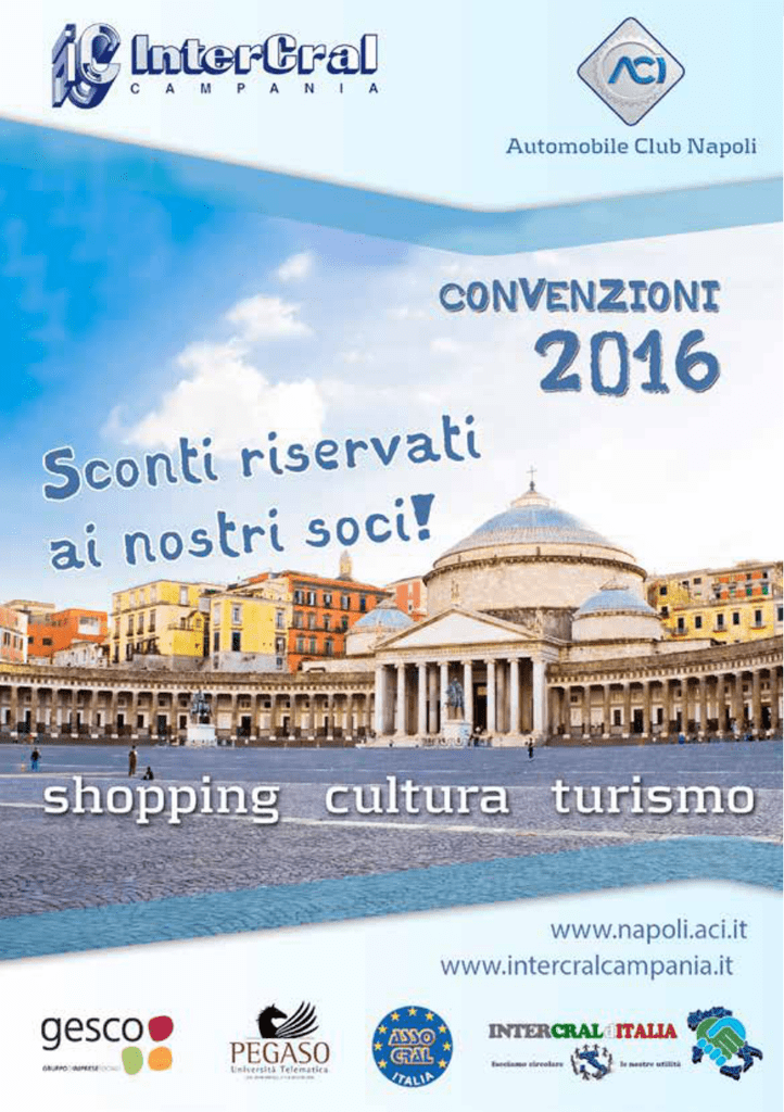 Intercral Campania 2016 1 Organigramma Intercral Campania Ideato e diretto da Carlo Postiglione Supervisori Paolo Lanza Renato Porcaro Realizzazione GRAFICA ed IMPAGINAZIONE Alfredo Esposito [email protected] 347.5811504 SEGRETERIA c/o Scoop Travel Via Tarantino, 12 (angolo Via Tino da Camaino) 80128 Napoli PRESIDENZA Via Campegna, 5/b 80125 Napoli Cell. 338.8754534 [email protected] Info point Salone ACI Napoli Piazzale Tecchio 80125 Napoli www.intercralcampania.it [email protected] 2 Intercral Campania 2016 Sommario 3 4 5 6 8 10 11 38 AI SOCI TUTTI Lettera del Presidente Intercral Campania ACI NAPOLI Presidente ACI Interviene GUIDA AI SERVIZI Vantaggi e opportunità riservate ai soci SODALIZI Elenco Sodalizi associati all’Intercral CINEMA Convenzioni riservate ai soci TEATRO Convenzioni riservate ai soci TURISMO Convenzioni turistiche suddivise per regione CONVENZIONI Elenco delle convenzioni suddivise per settore Lettera ai Soci Un altro anno è trascorso, ed è opportuno dirlo, molto proficuo per approcci ed espansione del nostro messaggio relativo al sociale. I nostri consociati hanno goduto di molteplici opportunità in tutti i campi, da quello turistico a quello merceologico. Abbiamo ricevuto ancora una volta fiducia, confermato anche dalle pubblicità presenti in questo guida ai servizi, mediante le quali ed in concorso con l’ACI di Napoli, sono andati in stampa circa 30,000 copie. La richiesta di aggregarsi alla nostra organizzazione, è cresciuta negli ultimi anni, al punto che sono affiliate anche diverse associazioni culturali e di volontariato. Penso che il nostro costante lavoro sia stato premiato con ampie soddisfazioni, anche con un limitato contributo di collaborazione di una parte dei sodalizi. Oggi, quasi vicini al trentennio dalla ns. nascita, nuove prospettive si aprono all’orizzonte: conseguentemente al nostro intervento “vincente”, a favore del fondo europeo caritatevole, presso il ministero dell’agricoltura, ed al convegno sulle nuove povertà da noi organizzato presso la Sala di Santa Maria la Nova, alcuni ministri sono interessati alla nostra partecipazione ad un convegno sullo stesso argomento in allestimento con la partecipazione del Vicariato del Papa a Roma. Non è di poca importanza la costituzione dell’Intercrald’Italia, con la Sardegna, Abruzzo e Vicenza, al fine di un interscambio di servizi, sempre a favore degli associati tutti, ed essere i referenti per l’Assocral Italia in Campania. Il nuovo assetto logistico, darà un rinnovato impulso alle nostre attività; ospitati dalla Scoop Travel (sede della Segreteria), e l’operativo Info-Point presso l’Aci, e l’avere coinvolto un quartetto di qualificati giornalisti, ci riempie di orgoglio, tanto per la diffusione di ciò che saremo in grado di ideare e proporre. L’attuale situazione economico-sociale, sia per scelte errate che per scarsa rappresentatività, crea uno scollegamento tra vertice e base associativa, quindi è necessario acquisire nuove strategie, nuovi strumenti, nuove finalità e superamento di vecchie logiche. L’individuazione di nuovi obiettivi e nuovi interlocutori, darà fiato per un rilancio al fine di soddisfare nuove esigenze. La comunione d’intenti con il presidente dell’Aci di Napoli, dott. Coppola, è un primo passo per raggiungere questi obiettivi, ed oggi apriamo un rinnovato capitolo per un progetto comune, che speriamo condiviso dalle tante realtà associative presenti. Prof. Carlo Postiglione Presidente Intercral Campania Intercral Campania 2016 3 Cari Soci, anche quest’anno, nonostante i limiti di bilancio imposti, da tempo ormai, dalla spending review, siamo riusciti a confermare il nostro impegno per arricchire di contenuti esclusivi la tessera ACI. La politica di attivare sul territorio una rete di solide relazioni e feconde sinergie, di cui il connubio con l’Intercral Campania è significativa testimonianza, ci consente, da sempre, di mettere al vostro servizio un ricco ventaglio di benefici ed opportunità. La presente guida, da sfogliare ed utilizzare con molta attenzione, ne è esempio concreto; essa illustra le innumerevoli agevolazioni a voi riservate, grazie alla forza di un’alleanza che coinvolge oltre centomila famiglie. Sport, turismo, tempo libero, shopping, artigianato, informatica, abbigliamento, arredamento, librerie sono solo alcuni dei settori in cui potete fruire di sconti talmente consistenti da poter recuperare, e persino superare, il costo della stessa tessera ACI. E’ una grande opportunità che l’Automobile Club e l’Intercral Campania vi offrono per orientare le vostre spese in direzione della qualità e della convenienza. L’associazione all’ACI prevede una quantità elevata di servizi e convenzioni di cui raramente si è pienamente a conoscenza. Infatti, spesso, la si utilizza soltanto in caso di estrema necessità: il soccorso stradale, che è sì il fiore all’occhiello del nostro Club, essendo la forma di assistenza tecnica più completa presente sul mercato, ma non è l’unica prestazione gratuita a cui avete diritto. Per questo motivo, vi invitiamo a leggere con attenzione il regolamento associativo e a consultare con maggiore assiduità il nostro sito (www.napoli.aci.it), onde essere continuamente informati su tutti i benefici 4 Intercral Campania 2016 che vi spettano. Aggiornamenti sulle nostre attività ed iniziative sono illustrati anche sulla rivista Mondoauto e sulle newsletters che potete ricevere semplicemente comunicandoci il vostro indirizzo di posta elettronica. Lo status di Socio ACI consente non soltanto di accedere ad esclusivi privilegi, ma, anche e soprattutto, di entrare a far parte di una grande famiglia che concorre alla promozione e realizzazione di una mobilità più efficiente, funzionale, sicura e pulita, in una parola “responsabile”. Il fiducioso sostegno ed i preziosi stimoli che ci date continuamente rappresentano per noi linfa vitale per fare di più e meglio al fine di
