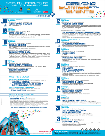 Breuil- cervinia Valtournenche Logo versione 1 Comune di Valtournenche CERVINO 2015 BREUIL-CERVINIA VALTOURNENCHE 150 ANNI DALLA CONQUISTA dal 09/08 al 21/08 Logo per 150 Cervino 2015 0816 09 dal al 04 12 da venerdì a sabato agosto Breuil-Cervinia | c/o Centro Sociale Sportivo Torneo e corsi di scacchi Info: +39 347 2306717 sabato VISCONTI E MENESTRELLI Serata musicale con una formazione composta da professionisti provenienti da realtà diverse fra loro: classica, jazz, rock. Verranno presentati brani riarrangiati e rivisti in chiave nuova ed energetica. XVII CERVINO CINEMOUNTAIN - Serata di apertura FESTA DELLE STELLE Presentazione del XVII Cervino Cinemountain, festival della filmografia di montagna. In collaborazione con Fondazione Film Commission Valle d’Aosta “E cinema fu...” Tradizionale cena di mezz’estate con falò, parapendio notturno, battesimo dell’aria con elicottero. Serata accompagnata con l’orchestra Acqua Marina domenica agosto 1317 14 dal Breuil-Cervinia | Arena Royaume du Cervin BATAILLES DE REINES Fase eliminatoria del tradizionale combattimento tra bovine della razza pezzata nera e castana Valtournenche | Ore 19 | P.zza delle Guide BASTARDI E SENZA GLORIA Presentazione del libro e discussione con Andrea Salieri e Daniele Babbini, con la moderazione del giornalista Walter Galli e a seguire degustazione di prodotti tipici di “La Crotta di Vegneron” e “Salumificio Maison Bertolin” (In caso di maltempo Sala Consiglio) al Opening night of the XVII Cervino Cinemountain Festival da mercoledì a domenica agosto Valtournenche | Centro Congressi XVII CERVINO CINEMOUNTAIN Proiezione di film di montagna vincitori di festival internazionali XVII International Cervino Cinemountain Film Festival giovedì agosto Valtournenche | Ore 11.30 | Gran Sometta Gran Sometta S. Messa Valtournenche | Ore 21 | Fraz. Cretaz e rientro Book presentation by authors Andrea Saleri and Daniele Babbini PROCESSIONE RELIGIOSA Fiaccolata in onore della Madonna con partenza dalla chiesa parrochiale di Sant’Antonio lunedì agosto Valtournenche | Ore 9.30 | Fraz. Cheneil Route Champlève-CheneiL Ore 9.30 Partenza della processione da Champlève - Ore 11.00 - S. Messa Valtournenche | Ore 21 | Centro Congressi MOUNTAIN FILM FORUM 15 Serata dedicata ai film di montagna Mountain film projections Religious torchlight procession venerdì agosto Breuil-Cervinia | Valtournenche | Dal mattino FERRAGOSTO: FESTA DELLE GUIDE ALPINE E DEI MAESTRI DI SCI Tradizionale sfilata delle associazioni, giochi per bambini e dimostrazioni di soccorso in montagna MOSTRE E MUSEI Da Luglio a Settembre Breuil-Cervinia - Sede Società Guide del Cervino | Tutti i giorni 9.30/12.30 - 14.30/18.30 • Museo della Montagna | Mountain museum • la conquista italiana del K2 - Omaggio a Achille Compagnoni | K2- First-ever ascent 1954 Dal 13 luglio al 14 settembre Valtournenche | Centrale CVA di Maen | Tutti i giorni 16/19 - Ingresso libero Étoiles Valdôtaines | Aosta Valley stars Servizi per bambini www.visualdesigner.it Valtournenche | Ore 21 | Centro Congressi Breuil-Cervinia | Ore 21 | Cinéma des Guides Valtournenche | Dalle ore 19 | Loc. Maen Traditional “Bataille des Reines” combat between cows 11 agosto Musical concert agosto Traditional mid-summer food festival and bonfire night 10 martedì Dal 15 luglio al 31 agosto animazione estiva | kids entertainment Servizio gratuito per bambini dai 4 anni dal martedì al venerdì dalle 14,30 alle 18. Ritrovo davanti alla piscina di Valtournenche. Navetta gratuita da Breuil-Cervinia a Valtournenche con partenza davanti alla chiesa del Breuil alle ore 14.45. Info 0166 92698. Free service for kids from 4 years - from the 15th july to the 31st august. thuesday to friday, from 2.30pm to 6 pm. Meeting at Valtournenche’s swimming pool Free shuttle from Cervinia to Valtournenche, in front of Cervinia’s Church at 2.45 pm. Info 0166 92698. Scopri tutte le altre attività presso gli Uffici del Turismo 16 17 19 20 Midsummer Festival with traditional Alpine Guides and Ski Instructors parade sabato agosto Breuil-Cervinia | Ore 19 | c/o Hotel Punta Maquignaz Il Cacciatore di Libertà Presentazione del libro di Aimé Maquignaz edito da Mondadori Book presentation by author Aimé Maquignaz domenica agosto Breuil-Cervinia | Ore 13 | Arena Royaume du Cervin BATAILLES DES CHEVRES Tradizionale combattimento tra capre Traditional “Bataille des Chevres” combat between goats martedì agosto Breuil-Cervinia NOTTE BIANCA - WHITE NIGHT Attività di intrattenimento, sportive e dj set per una notte scintillante Evening of music, entertainment, exhibitions and demonstrations along the main pedestrian street mercoledì agosto Valtournenche | Ore 21 | Centro Congressi Alla scoperta della fauna della Valtournenche A cura del Corpo Forestale Valdostano e dal fotografo Rupani 21 Local Forestry Corps presentation of the territory and their work giovedì agosto Valtournenche | Ore 21 | Centro Congressi FRANCESS E I SUOI Spettacolo musicale dell’artista Francess accompagnato dalla sua band di tre musicisti con batteria, basso e chitarra acustica Concert by musician Francess and band www.cervinia.it www.comune.valtournenche.ao.it | www.lovevda.it Office du Tourisme Valtournenche +39 0166 92029 | Breuil-Cervinia +39 0166 949136