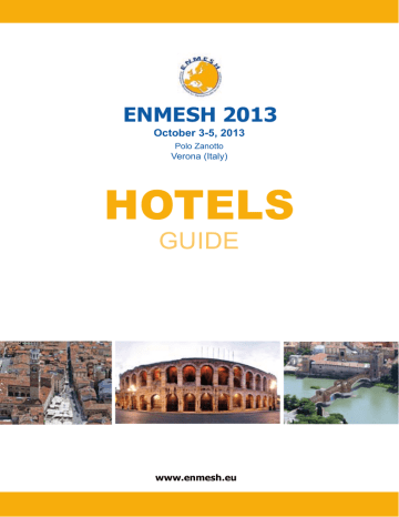 ENMESH 2013 October 3-5, 2013 Polo Zanotto Verona (Italy) HOTELS Guide www.enmesh.eu ENMESH 2013 October 3-5, 2013 Polo Zanotto - Verona (Italy) 1 2 3 4 PIAZZA ERBE CASTELVECCHIO PIAZZA BRA Gran Guardia 1 CORSO PORTA NUOVA 5 VERONA PORTA NUOVA RAILWAY STATION 6 POLO ZANOTTO A 2 F 3 6 4 B E C D 5 A HOTEL ACCADEMIA Via Scala, 12 B HOTEL VERONA Corso Porta Nuova, 47/49 C HOTEL GIBERTI Via M. Giberti , 7 D GRAND HOTEL Corso Porta Nuova, 105 E HOTEL DE’ CAPULETI Via del Pontiere, 26 F HOTEL MASTINO Corso Porta Nuova, 16 A 2 ENMESH 2013 October 3-5, 2013 Polo Zanotto - Verona (Italy) SUGGESTED ACCOMMODATIONS HOTEL ACCADEMIA Via Scala, 12 - 37121 Verona Historical palace, in 1880 it has been changed in an elegant hotel facing Mazzini’s street, the most exclusive road of the town for shopping. It’s located in the historical city centre, between the Arena and Juliet’s balcony. The hotel has modular meeting rooms, fine restaurant and garage. DOUBLE USED AS SINGLE ROOM € 156,00 DOUBLE ROOM € 168,00 HOTEL GIBERTI Via M. Giberti , 7 - 37122 Verona Hotel Giberti, classic and elegant, is located in a very central area of Verona, close to the Arena, to the Railway Station and to the Exhibition Center. The staff, professional and kind, will let you have a pleasant stay. The 80 rooms are comfortable and suitable for all types of guests. Garage and car parking available (13,00- Euro). Public bus lines n° 11, 12, 13, 72 from Corso Porta Nuova to Verona Porta Nuova Station where you can catch n° 21, 61, 83 to VeronaFiere. DOUBLE USED AS SINGLE ROOM € 105,00 DOUBLE ROOM € 127,00 3 ENMESH 2013 October 3-5, 2013 Polo Zanotto - Verona (Italy) GRAND HOTEL Corso Porta Nuova, 105 - 37122 Verona In an excellent central position, only 5 minutes walk from the Arena, the hotel still keeps the tradition of its Liberty facade, while inside the classic blends with the modern style of a business hotel. The rooms recently renovated and equipped with all comforts from air conditioning to direct Internet access. The hotel has wi-fi area and meeting rooms, with a capacity from 15 to 150 seats. Garage available (15,00- 20,00 Euro, It depends on the kind of car). Public bus lines n° 11, 12, 13, 72 from Corso Porta Nuova to Verona Porta Nuova Station where you can catch n° 21, 61, 83 to VeronaFiere. DOUBLE USED AS SINGLE ROOM € 108,00 DOUBLE ROOM € 144,00 4 ENMESH 2013 October 3-5, 2013 Polo Zanotto - Verona (Italy) HOTEL DE’ CAPULETI Via del Pontiere, 26 - 37122 Verona The Best Western Hotel De’ Capuleti is in the heart of the city, few metres from the Arena, easily reachable from the main motorway exits. Free parking facilities on the street or garage on payment close to the hotel (14,00- Euro). Each rooms with private bathroom, air conditioning, minibar, satellite Tv and Wi-Fi connection. Every morning rich buffet breakfast with fresh cakes of own production, fruit, cheese and salami. You can catch the public bus lines n° 11, 12, 13, 72 from Piazza Bra to Verona Porta Nuova Station where you can catch n° 21, 22, 61 to VeronaFiere. DOUBLE USED AS SINGLE ROOM € 99,00 DOUBLE ROOM € 109,00 HOTEL MASTINO Corso Porta Nuova, 16 - 37122 Verona In the historical centre of Verona, just few steps far from the Arena, reachable by car. Elegant and comfortable, the hotel has recently undergone a complete renovation and now includes a meeting room, a bar and a car park with private covered parking spaces. Located inside an old historical building, our rooms all has high quality accessories and comforts, private bath with either a shower or a Jacuzzi bathtub. DOUBLE USED AS SINGLE ROOM € 95,00 DOUBLE ROOM € 100,00 5 ENMESH 2013 October 3-5, 2013 Polo Zanotto - Verona (Italy) HOTEL VERONA Corso Porta Nuova, 47/49 - 37122 Verona A small hotel centrally located, equipped with air conditioning, telephone, colour TV and wired radio. 27 rooms, 50 beds, elevator, meeting room, bar, small garden, garage, parking. Pets allowed. DOUBLE USED AS SINGLE ROOM € 86,00 DOUBLE ROOM € 109,00 6