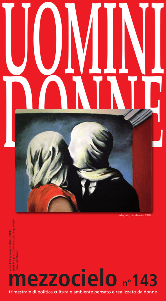 uomini donne anno XXII primavera 2014 - € 8,00 sped. in a.p. art. 2 comma 20/c legge 662/96 Filiale di Palermo Magritte, Les Amants, 1928 mezzocielo 143 n° trimestrale di politica cultura e ambiente pensato e realizzato da donne politica La democrazia è troppo faticosa Simona Mafai Cerco un filo, individuando il quale, tirandolo e srotolandolo, sia possibile dare una lettura agli eventi politici degli ultimi mesi: dalle vicende internazionali (crisi della Crimea e dinamiche estensive della NATO verso oriente), ad Obama che chiede all’Europa maggiore solidarietà (e forse più spese militari?); dalla grave situazione economica e morale italiana, dove si registrano permanere e forse estensione della criminalità organizzata, alla crescita esponenziale della corruzione al Nord come al Sud; fino ai tragici episodi di disperazione per una disoccupazione, che non si riesce a tamponare… Come far fronte – donne e uomini – a questa massa di problemi? Come individuare alcune linee d’intervento attorno a cui costruire una pressione critica ma anche positiva, di massa, includente gli sforzi di milioni di cittadine e cittadini onesti? E’ una domanda che travalica le responsabilità e le capacità della redazione di questo giornale, che oggi riprende orgogliosamente – dopo mesi di silenzio – la sua presenza nella società siciliana ed italiana. I problemi su indicati originano da questioni complesse e difficili, riguardanti la struttura delle nazioni, i loro rapporti di collaborazione o sudditanza, la possibilità dei “governati” (cittadine e cittadini) di prendere nelle mani il proprio futuro, esercitando una effettiva capacità di intervento. Tra i tanti possibili fili di analisi, ne individuo almeno uno, forse utile per costruire su di esso una riflessione comune. E questo filo è una riflessione sulla democrazia, che è la pratica politica attraverso la quale abbiamo creduto di poter intervenire – dal dopoguerra ad oggi – sullo svolgimento degli eventi politici interni (e, almeno in parte, sugli eventi europei e internazionali); sulla efficacia di questa pratica che ci ha assistito per oltre mezzo secolo (dal 1947, anno della approvazione della Costituzione, ad oggi); sulle sue caratteristiche, sulla sua funzionalità, sulla sua capacità reale di dare voce alla popolazione, comprese le donne e gli strati sociali meno organizzati, sulle speranze crescenti di cui è stata innestata, sulle delusioni che ha suscitato. Siamo da un pezzo nel nuovo secolo. Il ’900 è passato – anche se continuiamo a parlarne, a rimpiangerlo o a demonizzarlo ma i problemi che abbiamo di fronte vanno affrontati e risolti con l’ottica di oggi, senza riportarli dentro una cornice ormai inadeguata e insufficiente: l’antifascismo, la guerra, il dopoguerra, l’arco costituzionale, e via dicendo. Le personalità che dominano oggi la scena politica sono troppo diverse da quelle di ieri. Commuoviamoci pure vedendo il film continua in terza di copertina uomini donne uomini donne Antonio Canova, Amore e psiche, 1788-1793, Museo del Louvre, Parigi diecirighe Francesca Traina Se avessi parole per dire tradurrei quest’impaccio muto. Ne farei un suono perforante la cortina dell’immenso, mi lascerei nelle note dei lupi per un rimpianto d’angelo, per uno swing, un blues di Billie Holiday, un accordo di viola. Se avessi occhi da mandare in giro vedrei la fatica del tempo, la sua giostra di ore e di stagioni. Vedrei chi muove il vento e nel vento il mondo. Se avessi mani toccherei la roccia, la goccia che lenta la scava e la trafigge senza dolore né pianto. Se avessi dita intreccerei capelli e fili per sospendermi più in là di questo nulla. E se avessi gambe non resterei soltanto per resistere. Andrei dove nasce il vento, dove incomincia il tempo per una supplica di riparazione. Perché si ricomponga il due, perché l’uno rispetti il due e il due l’uno. E che sia donna, uomo o altro indefinito non importa purché non si sottragga vita. 1 mezzocielo n° 143 aprile 2014 uomini donne uomini donne Basta quella volta Tracce di una conversazione sull’amore tra Egle Palazzolo e l’analista Paola Camassa Ciao Paola, non so ancora quanto il tuo ultimo libro abbia merito o “colpa”, ma certamente verrà fuori, nell’indurmi a riprendere con te la storia, vecchia come il mondo, pure per qualche verso nuova di zecca, dell’uomo e della donna, del loro rapporto, e diciamolo immediatamente, dell’amore tra loro. Se c’è, quale è, quando c’è, se lo si riconosce, se si è capaci o determinati a difenderlo, a preservarlo. Come si fa dei beni, materiali e immateriali, che costituiscono il nostro patrimonio. Che ci identificano. Se diciamo amore di coppia ben sappiamo che il discorso può farsi ormai palesemente più ampio e indicare altre strade e magari altre risorse e soluzioni, ma qui cerchiamo di ripartire, se non proprio da Adamo ed Eva, da una diversità di genere, non si sa davvero quanto usurata , mesta, feroce, segregata, estrema e spesso irriconoscibile. Persino colpevole di non aver trovato, la maggior parte delle volte il segno vero. Ci sono colpevoli di grande statura, la mia piccola colpa è di avere raccontato una storia d’amore che dura, che resiste. Senza vincere. Da questa esperienza ho tratto la mia conclusione: l’amore è una coppia unita dal pieno appagamento sessuale. Ma questo pieno appagamento è quasi sempre l’esperienza più catastrofica per l’IO, che lotterà contro la perdita della sua integrità, autarchia, egemonia. La gratitudine che porto alla coppia dei miei genitori è che mi ha permesso di annettere la coppia sessuale alla sfera dell’ideale dell’Io. Credo che tutti l’abbiamo intravista, tutti portiamo l’immagine immaginata, la “preconcezione” della coppia sessuale, ma inesorabilmente la preconcezione viene distrutta (dall’esperienza della coppia genitoriale o della propria). Scrive Yeats del matrimonio: “e quando quel crimine è compiu