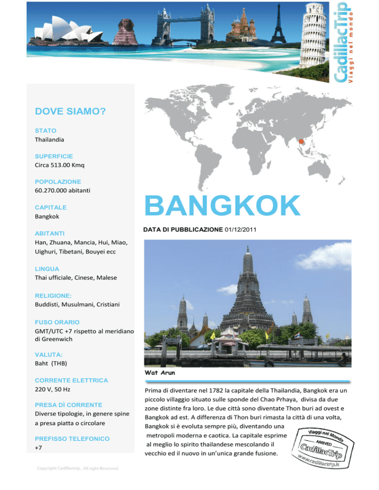 Tt DOVE SIAMO? STATO Thailandia SUPERFICIE Circa 513.00 Kmq POPOLAZIONE 60.270.000 abitanti CAPITALE Bangkok ABITANTI BANGKOK DATA DI PUBBLICAZIONE 01/12/2011 Han, Zhuana, Mancia, Hui, Miao, Uighuri, Tibetani, Bouyei ecc LINGUA Thai ufficiale, Cinese, Malese RELIGIONE: Buddisti, Musulmani, Cristiani FUSO ORARIO GMT/UTC +7 rispetto al meridiano di Greenwich VALUTA: Baht (THB) Wat Arun CORRENTE ELETTRICA 220 V, 50 Hz Prima di diventare nel 1782 la capitale della Thailandia, Bangkok era un piccolo villaggio situato sulle sponde del Chao Prhaya, divisa da due PRESA DÌ CORRENTE zone distinte fra loro. Le due città sono diventate Thon buri ad ovest e Diverse tipologie, in genere spine Bangkok ad est. A differenza di Thon buri rimasta la città di una volta, a presa piatta o circolare Bangkok si è evoluta sempre più, diventando una metropoli moderna e caotica. La capitale esprime PREFISSO TELEFONICO al meglio lo spirito thailandese mescolando il Questo documento è proprietà di CadillacTrip.it. Qualsiasi utilizzo o riproduzione, anche parziale, di +7 il nuovo in un’unica esso da parte di terzi senza autorizzazionevecchio è vietata.ed©CadillacTrip.it - 1 di 14grande fusione. Bangkok oltre ad essere una delle città più belle di tutta l'Asia è anche la capitale della Thailandia. La città è ricca di fascino, storia, cultura, sport e tecnologia allo stesso tempo, tanto da renderla unica nel suo genere. Qui si possono trovare dai templi Buddhisti ai locali a luci rosse, dai mercatini del “contraffatto” alle boutique più prestigiose, tutti elementi in totale sintonia tra loro, nonostante l’evidente incompatibilità in qualsiasi altra città del mondo. Un tempo la città era chiamata la Venezia d'Oriente per i molteplici fiumi presenti. Oggi molti di essi non ci sono più, rimane però il Damnoen Saduak , dove si svolge il Floating Market il “Mercato galleggiante”, una delle attrazioni preferite dai turisti. INFORMAZIONI UTILI Il centro del business a Bangkok è favorito da due importanti vie, Silom Road e l’area di Siam Square. Quest'ultima è il luogo ideale per lo shopping diurno ed il divertimento notturno. A Silom Road si può trovare il miglior mercato di tutta Bangkok, con apertura dalle 18.00 fino alle 00.30. Ricordatevi sempre l’arte della contrattazione, per i Thailandesi è un gioco, per il turista può divenire un considerevole risparmio. La sera lo scenario cambia, tanto da far diventare Silom Road una delle vie più ricercate ed eccitanti di tutta la Thailandia. Silom Soi 4, con la vicinanza di altre due strade, Pat Pong 1 e Pat Pong 2, costituiscono la famosa area a luci rosse, ovvero la parte più antica e famosa della vita notturna della capitale. Nella parte antica della città è possibile visitare il Grand Palace, per entrare in Templi e luoghi Sacri è necessario avere spalle e gambe coperte. Il Lumphini Park è la più grande area verde recintata della città, misura un chilometro quadrato ed al suo interno è presente un lago artificiale dove è possibile effettuare un tour in barca. Veduta di Bangkok La città ha 3 grandissimi problemi, in primo luogo il traffico, talmente esagerato da far perdere la pazienza, a seguire l'inquinamento, difficile respirare liberamente soprattutto in estate, ed infine la persistenza incessante dei forti odori che provengono da ogni angolo delle strade. Nonostante ciò, è possibile vivere l’atmosfera dei luoghi tranquillamente, con la consapevolezza che dopo qualche giorno ci si abitua facilmente. Il nome Bangkok significa “CITTA' DEGLI ANGELI”, offre tutto quello che una persona può desiderare dalla vita, alberghi di lusso, grattacieli, aree verdi, centri commerciali ultra moderni, centri massaggi specializzati, intrattenimento di vario genere con incontri di box Thailandese, mercatini, discoteche e quant'altro si desideri avere a portata di mano. Fiume Chao Phraya Siam Square è la zona tecnologica e moderna, dove si trova anche il più elegante centro commerciale, il Siam Paragon, raggiungibile facilmente con lo Sky train o con la moderna metropolitana, nonché punto di incontro degli autobus urbani. Nella piazza sono presenti ottimi Questo documento è proprietà di CadillacTrip.it. Qualsiasi utilizzo o riproduzione, anche parziale, di esso da parte di terzi senza autorizzazione è vietata. ©CadillacTrip.it 2 di 14 ristoranti di genere Europeo ed Internazionale, alcuni dei maggiori locali, caffè, bar e banchetti, con oggetti caratteristici di vario genere, tanto da renderlo uno dei luoghi da non perdere. La zona più tranquilla e meno caotica,per quanto riguarda il traffico, è Sukhumvit Road. La via è popolata dagli stranieri residenti, gli immancabili negozi e molti turisti “zaino in spalla”. Per gli amanti della tecnologia consigliamo una visita a Petchburi Road, vicino a Siam Square, è possibile trovare un grande centro commerciale di 4 piani che vende esclusivamente prodotti elettronici all' avanguardia. Il Centro della città si espande lungo il fiume Chao Prhaia e attraverso la Khao San Road, la zona più turistica e affascinante di tutta la città. Thai Boxe Dopo i monumenti e lo shopping, non fatevi sfuggire uno degli eventi più spettacolari di tutta la città, ovvero un incontro di Thai boxe, molto violento ma di sicuro fascino. E' incredibile l'entusiasmo dei tifosi sulle gradinate la maggior parte legato sicuramente al giro di scommesse, e l’incitamento ai combattenti. Gli stadi dove si possono trovare questi combattimenti sono il Lumphini Stadium e il Ratchadamnoen Stadium. Importante informarsi su giorni e orari degli incontri per evitare di trovare gli impianti deserti. Khao San Road Sono presenti alberghi di medio e basso livello, Call Center ed il quartiere China Town, con molti prodotti provenienti dalla Cina. Gate per China Town Il Gran Palazzo è la maggiore attrazione turistica di tutta la città, nelle sue vicinanze troverete il Buddha disteso il Wat Po, con i sui 46 metri di