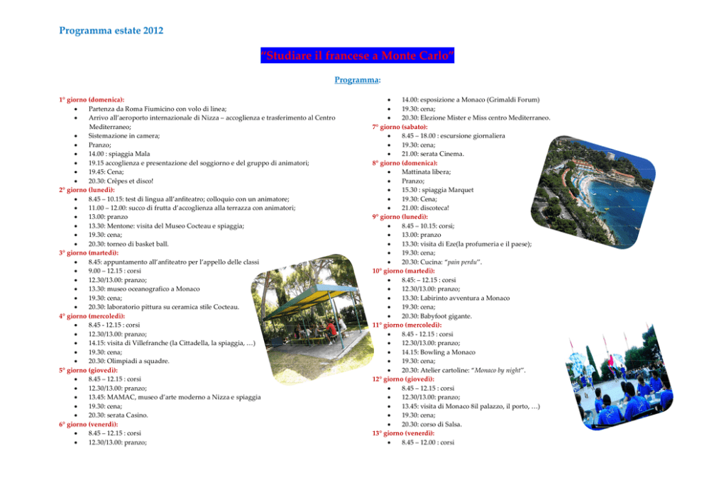 Programma estate 2012 “Studiare il francese a Monte Carlo” Programma: 1° giorno (domenica): Partenza da Roma Fiumicino con volo di linea; Arrivo all’aeroporto internazionale di Nizza – accoglienza e trasferimento al Centro Mediterraneo; Sistemazione in camera; Pranzo; 14.00 : spiaggia Mala 19.15 accoglienza e presentazione del soggiorno e del gruppo di animatori; 19.45: Cena; 20.30: Crêpes et disco! 2° giorno (lunedì): 8.45 – 10.15: test di lingua all’anfiteatro; colloquio con un animatore; 11.00 – 12.00: succo di frutta d’accoglienza alla terrazza con animatori; 13.00: pranzo 13.30: Mentone: visita del Museo Cocteau e spiaggia; 19.30: cena; 20.30: torneo di basket ball. 3° giorno (martedì): 8.45: appuntamento all’anfiteatro per l’appello delle classi 9.00 – 12.15 : corsi 12.30/13.00: pranzo; 13.30: museo oceanografico a Monaco 19.30: cena; 20.30: laboratorio pittura su ceramica stile Cocteau. 4° giorno (mercoledì): 8.45 - 12.15 : corsi 12.30/13.00: pranzo; 14.15: visita di Villefranche (la Cittadella, la spiaggia, …) 19.30: cena; 20.30: Olimpiadi a squadre. 5° giorno (giovedì): 8.45 – 12.15 : corsi 12.30/13.00: pranzo; 13.45: MAMAC, museo d’arte moderno a Nizza e spiaggia 19.30: cena; 20.30: serata Casino. 6° giorno (venerdì): 8.45 – 12.15 : corsi 12.30/13.00: pranzo; 14.00: esposizione a Monaco (Grimaldi Forum) 19.30: cena; 20.30: Elezione Mister e Miss centro Mediterraneo. 7° giorno (sabato): 8.45 – 18.00 : escursione giornaliera 19.30: cena; 21.00: serata Cinema. 8° giorno (domenica): Mattinata libera; Pranzo; 15.30 : spiaggia Marquet 19.30: Cena; 21.00: discoteca! 9° giorno (lunedì): 8.45 – 10.15: corsi; 13.00: pranzo 13.30: visita di Eze(la profumeria e il paese); 19.30: cena; 20.30: Cucina: “pain perdu”. 10° giorno (martedì): 8.45: – 12.15 : corsi 12.30/13.00: pranzo; 13.30: Labirinto avventura a Monaco 19.30: cena; 20.30: Babyfoot gigante. 11° giorno (mercoledì): 8.45 - 12.15 : corsi 12.30/13.00: pranzo; 14.15: Bowling a Monaco 19.30: cena; 20.30: Atelier cartoline: “Monaco by night”. 12° giorno (giovedì): 8.45 – 12.15 : corsi 12.30/13.00: pranzo; 13.45: visita di Monaco 8il palazzo, il porto, …) 19.30: cena; 20.30: corso di Salsa. 13° giorno (venerdì): 8.45 – 12.00 : corsi 12.00: consegna degli attestati 12.30/13.00: pranzo; 14.30: mini-golf e giardino esotico a Monaco 19.30: cena; 20.30: consegna dei premi dei tornei e a seguire “Disco revival”. 14° giorno (sabato): Dopo la prima colazione, trasferimento in pullman all’aeroporto internazionale di Nizza. Partenza per Roma con volo di linea; Arrivo aeroporto Roma Fiumicino. TUTTO COMPRESO: Volo Roma/Nizza e ritorno, pensione completa, corso di lingua, visite culturali e attività sportive pomeridiane, animazioni serali, escursione giornaliera del sabato, trasferimento da e per l’aeroporto di Nizza. I corsi di lingua francese: 15 allievi per classe; 15 ore a settimana (totale 30 ore di lingua); Test d’ingresso all’arrivo; Attestato Europeo di Studi Francesi (secondo il Portfolio del Consiglio d’Europa) conseguito a fine soggiorno se la frequenza ai corsi è stata regolare Gli insegnanti sono tutti esperti, laureati e specializzati nell’insegnamento del Francese Lingua Straniera). Orario giornaliero dei corsi: • 8.45 – 10.15: francese generale (pratica dello scritto e soprattutto conversazione) • 10.15 – 10.45: ricreazione • 10.45 – 12.15: ateliers di espressione creativa (teatro, poesia, canzone francese, stampa e media, …) Estate 2012 - Date 1° gruppo 2° gruppo 3° gruppo 4° gruppo da 17 giugno 24 giugno 29 luglio 5 agosto a 30 giugno 7 luglio 11 agosto 18 agosto Età dei partecipanti: 13/18 anni COSTO INDIVIDUALE DI PARTECIPAZIONE: 1.700,00 EURO