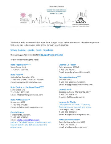 Venice has wide accommodation offer, form budget hotels to five-star resorts. Here below you can find some tips to book your hotel online through search engines: trivago - booking – expedia – kayak – tripadvisor through suggested websites for B&B, apartments or hostel or directly contacting the hotel: Hotel Papadopoli **** Santa Croce, 245 T. + 39 041 710400 Hotel Falier** Salizada San Pantalon, 130 T. +39 041 710882 / +39 041 711005 E-mail: [email protected] Hotel Carlton on the Grand Canal**** Santa Croce 578 T. + 39 041 2752200 Email: [email protected] Hotel Al Malcanton** Dorsoduro 3587 T. +39 041 2750897 E-mail: [email protected] Ostello Venezia Fondamenta Zitelle 86 T. +39 342 5767349 email: [email protected] Indicate “SeSaMO" in your email request and you will benefit of a 10% discount on the official rates. Locanda Ca’ Foscari Calle Marcona, 3887/B T. +39 041 710401 Email: [email protected] Palazzetto Madonna**** San Polo 2902 T. +39 041 5246781/5232335 Email: [email protected] Locanda Matir Dorsoduro, Santa Margherita, 3677 T. +39 041 5287624 E-mail: [email protected] Locanda del Ghetto Only open on 16th and 17th January Reservationonly by email and phone Cannaregio, 2892-2893 T. +39 041 2759292 email: [email protected] Hotel Canada Venezia** Castello Campo San Lio, 5659 T. +39 041 5229912 email: [email protected] Hotel Adua** Sestriere Cannaregio, 233 T. +39 041 716184 Hotel Airone Santa Croce, 557 T. +39 041 5204800 email: [email protected] Locanda Herion Cannaregio, 1697/a T. +39 041 2759422 email: [email protected] Hotel San Geremia Habitaciones privadas y compartidas Campo San Geremia, 283 T. +39 041 715561 email: [email protected] Palazzo Rosa Apartamentos y habitaciones Open from 16th January Cannaregio 5590/a T. +39 041 2960188 email: [email protected] Foresteria Levi San Marco, 2893 T. +39 041 277 0542 – +39 041 277 0574 Guest house Don Orione Artigianelli Zattere Dorsoduro 909/a T. + 39 041 5224077 Email: [email protected]