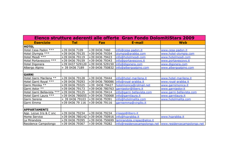 Elenco strutture aderenti alle offerte Gran Fondo DolomitiStars 2009 Esercizio Tel Fax HOTEL Hotel Cesa Padon *** Hotel Olympia *** Hotel Mesdì *** Hotel Portavescovo *** Hotel Digonera Albergo Alpino +39 0436 7109 +39 0436 79135 +39 0436 79119 +39 0436 79159 +39 0437 529120 + 39 0436 7189 +39 +39 +39 +39 +39 +39 0436 0436 0436 0436 0436 0436 GARNì Hotel Garni Marilena ** Hotel Garnì Royal *** Garni Monika ** Garni Astor ** Hotel Garnì Bellavista *** Hotel Garnì Laura *** Garni Serena Garni Emma +39 0436 79128 +39 0436 79293 +39 0436 79325 +39 0436 79173 +39 0436 79125 +39 0436 780055 + 39 0436 79103 +39 0436 79 116 +39 +39 +39 +39 +39 +39 +39 +39 APPARTAMENTI App. Lezuo Iris & C snc Home Service La Mirandola Residence Campolongo +39 +39 +39 +39 +39 +39 +39 +39 0436 0436 0436 0436 79234 780142 79395 79367 7460 79354 79423 79343 529150 750832 E-mail Web [email protected] [email protected] [email protected] [email protected] [email protected] [email protected] www.cesa-padon.it www.hotel-olympia.com www.hotelmesdi.com www.portavescovo.it www.digonera.com www.albergoalpino.com 0436 79444 0436 780086 0436 79427 0436 780763 0436 79414 0436 750068 0436 79391 0436 79116 [email protected] [email protected] [email protected] [email protected] [email protected] [email protected] [email protected] [email protected] www.hotel-marilena.it www.royal-arabba.it www.garnimonica.it www.garniastor.it www.garni-bellavista.com www.garnilaura.it www.hotelmalita.com 0436 0436 0436 0436 [email protected] [email protected] www.hsarabba.it [email protected] [email protected] www.residencecampolongo.net 79234 750916 750699 79282