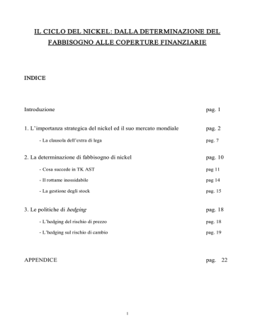 IL CICLO DEL NICKEL: DALLA DETERMINAZIONE DEL FABBISOGNO ALLE COPERTURE FINANZIARIE INDICE Introduzione pag. 1 1. L’importanza strategica del nickel ed il suo mercato mondiale pag. 2 La clausola dell’extra di lega pag. 7 2. La determinazione di fabbisogno di nickel pag. 10 Cosa succede in TK AST pag 11 Il rottame inossidabile pag 14 La gestione degli stock pag. 15 3. Le politiche di hedging pag. 18 L’hedging del rischio di prezzo pag. 18 L’hedging sul rischio di cambio pag. 19 APPENDICE pag. 22 1 INTRODUZIONE Il lavoro condotto in queste pagine cerca di fornire un quadro di tutte quelle attività che in diversa maniera sono coinvolte nel processo di determinazione del fabbisogno di nickel, di acquisto e, quindi, di quelle che sono le operazioni finanziarie di copertura dal rischio di prezzo e di cambio. Abbiamo dedicato uno spazio maggiore, all’interno del 3 capitolo e nell’appendice, nel dettagliare sull’utilizzo di alcuni strumenti di copertura dal rischio di cambio, avendo comunque cercato di fornire una visione complessiva e chiara di tutto il processo, comunque indispensabile per comprenderne la sua essenzialità e criticità. Guardando alle grandi aziende di trasformazione si è sempre data una importanza maggiore a tutta quella che è l’attività tipica di acquisto, trasformazione e vendita del prodotto finito, ma è importante, in questo caso, osservare il forte peso che qui gioca una materia e quindi tutto quello che la sua gestione comporta, non solo in termini di pura trasformazione tecnica. Il nickel, sia puro che da rottame, rappresenta il 67% circa dei costi di tutte le materie prime acquistate in un esercizio (su oltre 700.000.000 euro ne rappresenta quasi 500.000.000 di euro); ed, inoltre, rappresenta circa il 65% dei costi variabili operativi di esercizio (che sono oltre il miliardo di euro). Questi dati vogliono solo far riflettere sul grande volume di capitali che direttamente l’impiego di nickel richiede e, quindi, di quanto complessa e delicata possa essere la gestione delle interrelazioni funzionali e dei flussi informativi, finalizzati a rendere economico il processo nei sui vari aspetti. Vedremo come la programmazione commerciale fornirà i sui piani pluriennali ed annuali di produzione, a come si è caratterizzata la vendita per commessa, agli impegni di lungo periodo verso i fornitori, al rispetto dei vincoli di giacenza (dato l’elevato valore del nickel) e agli strumenti finanziari utilizzati per garantire il margine di guadagno: tutti, attraverso scambi bidirezionali di informazioni e condivisioni di know how, coinvolti in vario modo e col fine ultimo e comune di massimizzare l’economicità di tutto il processo, comunque inserito all’interno di un sistema azienda il cui core resta la produzione di coils. La complessità del processo ed il rispetto di notevoli vincoli, sia esogeni che endogeni al sistema azienda TK AST, vedremo richiederà ad alcune funzioni notevole flessibilità nell’attuazione delle loro politiche operative e questo perché una eccessiva rigidità avrebbe richiesto oneri, diretti ed impliciti, troppo elevati da sostenere, oltre che un forte rischio di errate valutazioni puntuali. La gestione finanziaria, nell’acquisto di consistenti volumi di dollari (necessari per acquistare nickel, ed altre materie), come vedremo, si è sviluppata in maniera tale da fornire ampi margini d’azione, soprattutto, come vedremo, a causa della forte aleatorietà del prezzo del nickel primario, in parte trasferita indirettamente anche nell’acquisto del rottame, e noto comunque solo in un momento in cui le operazioni di copertura sono state già dovute essere avviate. Nell’appendice cercheremo di descrivere un momento concreto delle operazioni poste in essere, e soprattutto di come strumenti come le opzioni sappiano dare, oltre che una maggiore flessibilità, anche un minor impatto su eventuali oscillazioni svaforevoli del tasso di cambio. 2 1. L’IMPORTANZA STRATEGICA DEL NIKEL ED IL SUO MERCATO MONDIALE In questa prima parte si vuole solo fornire un overview generica sul nickel ed il suo mercato, per far riflettere sulla criticità ed essenzialità di questo metallo, al fine di meglio inquadrare tutte quelle fasi operative che si generano in azienda e che sono strettamente collegate, e che comunque non sono di secondaria importanza rispetto a quello che è il processo vero e proprio di trasformazione e di produzione dell’acciaio; abbiamo, quindi: il momento della determinazione del fabbisogno di materie prime (sulla base di quelli che sono gli obbiettivi e le previsioni di vendita), l’acquisto sul mercato fisico e le coperture finanziarie che vengono poste in essere a tutela del prezzo e della valuta utilizzata per le forniture. Nella descrizione, più o meno dettagliata, di queste attività faremo diretto riferimento a quello che avviene in TK AST cercando comunque fin da subito di lanciare un messaggio sulla complessità delle interrelazioni funzionali che come vedremo non sono solo sequenziali (unidirezionali) ma a ben vedere il valore aggiunto del processo sarà dato proprio dalle sinergie di “scambio bidirezionale”(feedback) e di knoledge sharing che queste funzioni sanno darsi. E’ un insieme di attività che deve saper gestire e ottimizzare al meglio l’efficienza e la produttività tecnico impiantistica da un lato e quella economica (costi) e di mercato (disponibilità) dall’altro. E’ un processo che vede quindi combinarsi sia variabili esterne che interne al sistema azienda TK AST, dove l’aleatorietà di alcuni eventi e la volatilità di alcuni fattori rendono il tutto molto difficile e complesso da gestire. Le proprietà del nickel, che con il ferro cromo rappresentano la materia prima principale per la produzione di acciaio inossidabile, lo rendono particolarmente adatto alla produzione di leghe ferrose (di cui, in effetti, troviamo prevalenza rispetto a quelle non ferrose e alle superleghe), soprattut