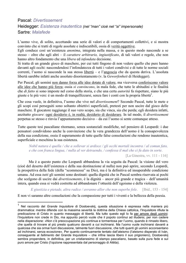 Pascal: Divertissement Heidegger: Esistenza inautentica (nel “man” cioè nel “si” impersonale) Sartre: Malafede L’uomo vive, di solito, accettando una serie di valori e di comportamenti collettivi, e si mostra convinto che si tratti di regole assolute e indiscutibili, ossia di verità oggettive. Egli conduce così un’esistenza anonima, integrata nella massa, e in questo modo nasconde a se stesso – oltre che agli altri – il carattere arbitrario, ingiustificato, di tali valori e regole, che non hanno altro fondamento che una libera ed infondata decisione. Si tratta di un grande gioco di maschere, per cui tutti fingono di non vedere quello che pure hanno davanti agli occhi: nascondendosi l’infondatezza di tutti i valori condivisi e di tutte le norme sociali correnti, l’uomo si nasconde la sua stessa libertà – e l’angoscia che da questa deriva. L’assoluta libertà sarebbe infatti anche assoluto disorientamento (v. la Geworfenheit di Heidegger). Per Pascal, gli uomini non danno forza alle idee dotate di valore, ma viceversa conferiscono valore alle idee che hanno più forza; ossia si convincono, in mala fede, che tutte le abitudini e le finalità che di fatto si sono imposte nel corso della storia, e che una certa autorità fa rispettare, siano le più giuste e le più vere: è un modo di tranquillizzarsi, senza fare i conti con la propria libertà1. Che cosa vuole, in definitiva, l’uomo che vive nel divertissement? Secondo Pascal, tutte le mete e gli scopi così perseguiti sono soltanto obiettivi superficiali, pretesti per non uscire dal gioco delle maschere. Il giocatore raggiunge il suo vero scopo, sia che vinca, sia che perda; egli desidera infatti, anzitutto giocare: ogni desiderio è, in realtà, desiderio di desiderare. In tal modo, il divertissement perpetua se stesso e rinvia l’appuntamento decisivo – da cui l’uomo si sente comunque atteso. Tutte queste tesi pascaliane ritornano, senza sostanziali modifiche, nel pensiero di Leopardi: i due pensatori condividono anche la convinzione che la vera grandezza dell’uomo è la consapevolezza della sua condizione, ossia il superamento di tutte quelle false consolazioni che rendono inautentica, superficiale e meschina la sua esistenza. Nobil natura è quella / che a sollevar si ardisce / gli occhi mortali incontra / al comun fato, e che con franca lingua, / nulla al ver detraendo, / confessa il mal che ci fu dato in sorte. [La Ginestra, vv. 111 - 116] Ma è a questo punto che Leopardi abbandona la via seguita da Pascal: la visione del vero (cioè del deserto dell’esistenza e della sua destinazione al nulla) non può aprire, secondo Leopardi, la prospettiva della fede (della “scommessa” su Dio), ma è la definitiva ed insuperabile condizione umana. Ad essa tutti gli uomini sono destinati: quella dignità che in Pascal sembra riservata ai pochi che scelgono di uscire dai divertissements, è la dignità – ancor più grande e tragica – dell’umanità intera, quando essa si vedrà costretta ad abbandonare l’ottusità dell’egoismo e della violenza. E giustizia e pietade, altra radice / avranno allor che non superbe fole. [Ibid., 153 - 154] E non vi saranno altre consolazioni che la compassione per tutti i viventi e la bellezza della poesia. 1 Nel racconto del Grande Inquisitore di Dostoevskij, questa situazione è espressa nella maniera più drammatica: mentre difende con la massima severità la dottrina della Chiesa cattolica, l’Inquisitore rifiuta la predicazione di Cristo in quanto messaggio di libertà. Ma tutto questo egli lo fa per amore degli uomini: l’Inquisitore non crede in Dio, ma appunto perciò vuole che il popolo continui ad illudersi, per non cadere nella disperazione: «Non c’è preoccupazione più continua e tormentosa per l’uomo, quando è rimasto libero, che quella di trovare al più presto qualcuno davanti a cui inchinarsi. Ma l’uomo vuole inchinarsi davanti a qualcosa che sia ormai fuori discussione, talmente fuori discussione, che tutti quanti gli uomini acconsentano ad inchinarsi, senza eccezione». Per quanto continuamente tentato dall’ateismo (l’ateismo disperato di Ivàn, conseguente al fallimento del Grande Inquisitore – che infine lascia libero il suo prigioniero), Dostoevskij sembra propendere, in definitiva, per un cristianesimo di stampo pascaliano, basato sulla pura fede e sul puro amore per Cristo (l’opzione rappresentata dal personaggio di Alëša).