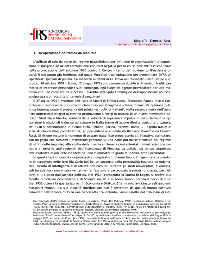 Biografie: Ernesto Rossi L'arresto di Rossi da parte dell'Ovra 1. Un’operazione poliziesca da manuale L’utilizzo di spie da parte del regime mussoliniano per infiltrare le organizzazioni d’opposizione e spingerle ad azioni terroristiche con esiti negativi per la causa dell’antifascismo trova nella provocazione dell’autunno 1930 contro il Centro interno del movimento Giustizia e Libertà il suo punto più insidioso, dal quale Mussolini trae ispirazione per denominare OVRA gli ispettorati speciali di polizia. La manovra ai danni di GL trova nell’avvocato Carlo Del Re (Codroipo, 18 ottobre 1901 - Roma, 17 giugno 1978) uno strumento duttile e dinamico: traditi per motivi di interesse personale i suoi compagni, egli funge da agente provocatore per una manovra che – se coronata da successo – avrebbe infangato l’immagine dell’opposizione politica, equiparata a un’accolita di terroristi sanguinari. Il 27 luglio 1929 l’evasione dall’isola di Lipari di Emilio Lussu, Francesco Fausto Nitti e Carlo Rosselli rappresenta uno smacco clamoroso per il regime e solleva dinanzi all’opinione pubblica internazionale il problema dei prigionieri politici italiani1. Nella seconda metà dell’anno i tre antifascisti sfuggiti al confino promovuono a Parigi la nascita di un nuovo movimento politico: Giustizia e libertà, animato dalla volontà di superare l’impasse in cui si trovano le opposizioni tradizionali e deciso ad attuare in Italia forme di azione diretta contro la dittatura. Nel 1930 si costituiscono in alcune città - Milano, Torino, Firenze, Roma... - i primi nuclei di attivisti clandestini, coordinati dal gruppo milanese animato da Riccardo Bauer2 e da Ernesto Rossi. Si ritiene maturo il momento di passare dalla fase preparatoria all’iniziativa esemplare, con un gesto che richiami l’attenzione generale su una delle più invise strutture del regime: gli uffici delle imposte; alla vigilia della marcia su Roma alcuni attentati dimostrativi prenderanno di mira le sedi regionali dell’Intendenza di Finanza. La polizia, da tempo sospettosa dell’esistenza di una rete clandestina, non si dimostra in grado di individuarne i promotori. In questa fase di crescita organizzativa i cospiratori milanesi hanno l’ingenuità e la sventura di accogliere nelle loro fila Carlo Del Re, un soggetto dalla personalità inquieta ed enigmatica, fornito di intelligenza e di astuzia non comuni. Durante gli studi universitari, a Venezia, egli ha aderito - non ancora ventenne - al fascismo e partecipato a scontri di piazza, per ritirarsi di lì a poco dall’attività politica. Nel 1921, conseguita la laurea in Legge, si iscrive alle facoltà di Scienze economiche e di Scienze sociali e in breve tempo corona il corso di studi (nel 1932 otterrà la quarta laurea, in Economia e Diritto). Si è intanto avvicinato agli ambienti massonici friulani. La sua vivacità intellettuale non è sostenuta da qualità morali positive; coinvolto nell’ottobre 1925 in una bancarotta fraudolenta, viene assolto dal Tribunale di Udi1 2 Un resoconto dell’evasione in Emilio Lussu, La catena, Paris, Res Publica, 1930 (riedizione Milano, Baldini & Castoldi, 1997, a cura di Mimmo Franzinelli), Carlo Rosselli, Fuga in quattro tempi, in Almanacco politico socialista 1931, Parigi, Psi, 1930 (Id., Scritti politici e autobiografici, Napoli, Polis, 1944, pp. 76-89 e Francesco Fausto Nitti, Le nostre prigioni e la nostra evasione, Napoli, Edizioni Scientifiche Italiane, 1946. Riccardo Bauer (Milano, 1896 - 1982), volontario nella grande guerra e pluridecorato, collabora al periodico gobettiano “Rivoluzione liberale” e dirige “Il Caffè”, quindicinale antifascista stampato a Milano dal luglio 1924 al maggio 1925. Arrestato il 30 ottobre 1930, riacquista la libertà nell’estate 1943. Membro della giunta militare del CLN, nel dopoguerra presiede la Società Umanitaria. Cfr. Mario Melino (a cura di), Riccardo Bauer, Milano, Angeli, 1985 e Riccardo Bauer, Quello che ho fatto. Trent’anni di lotte e di ricordi, Roma-Bari, Laterza, 1987. www.fondazionerossisalvemini.eu 1 [email protected] Biografie: Ernesto Rossi L'arresto di Rossi da parte dell'Ovra ne per insufficienza di prove. L’eco del procedimento giudiziario lo induce a trasferirsi a Milano, dove l’anno successivo svolge il praticantato in uno studio legale. L’accostamento a Giustizia e libertà avviene verso la fine del 1929, per i tramiti massonici: l’avv. Marco Ciriani3 lo raccomanda a Raffaele Cantoni, un ragioniere veneziano stabilitosi a Milano per motivi di lavoro, interessato alla ripresa clandestina della Massoneria e collegato con Bauer e altri esponenti antifascisti di orientamento repubblicano. Del Re ostenta sentimenti di ammirazione sfrenata verso Giuseppe Mazzini e i maggiori cospiratori del Risorgimento; i complotti lo affascinano e agogna l’azione clandestina, concepita come un’entusiasmante avventura esistenziale. I massoni milanesi concedono piena fiducia al giovane confratello, affidandogli il compito di stabilire i collegamenti con Parigi, dove si è trasferita, dopo la messa al bando della Massoneria, la direzione del Grande Oriente. Invaghitosi di una collega di lavoro, che sposa il 30 agosto 1930 con rito civile, l’avvocato friulano si è permesso nella prima metà dell’anno un tenore di vita di gran lunga superiore alle sue possibilità, dilapidando circa 125.000 lire ricevute in custodia giudiziale in qualità di perito del Tribunale di Milano. Al ritorno dal viaggio di nozze l’insostenibilità della posizione finanziaria e la rovina professionale incombono. Soppesate e scartate le vie d’uscita del suicidio o della fuga all’estero, egli intravvede la via d’uscita nella delazione ai danni dei suoi compagni. Nonostante il coinvolgimento recente nella struttura antifascista clandestina, Del Re (nomi di copertura: Carletti, Carletto) conosce l’identità di decine di giellisti, è al corrente dei canali di comunicaz