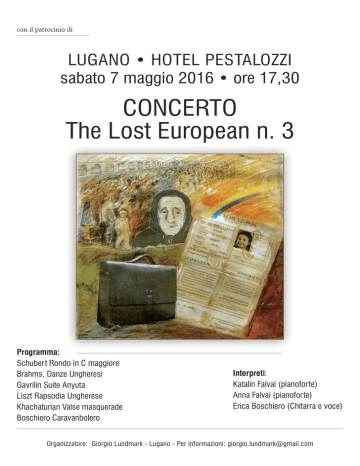 con il patrocinio di LUGANO • HOTEL PESTALOZZI sabato 7 maggio 2016 • ore 17,30 CONCERTO The Lost European n. 3 Programma: Schubert Rondo in C maggiore Brahms, Danze Ungheresi Gavrilin Suite Anyuta Liszt Rapsodia Ungherese Khachaturian Valse masquerade Boschiero Caravanbolero Interpreti: Katalin Falvai (pianoforte) Anna Falvai (pianoforte) Erica Boschiero (Chitarra e voce) Organizzatore: Giorgio Lundmark - Lugano - Per informazioni: [email protected] con il patrocinio di LUGANO • HOTEL PESTALOZZI domenica 8 maggio 2016 • ore 17,30 CONCERTO The Lost European n. 4 Programma: a sorpresa Interpreti: Luca Ghielmetti & amici ((Chitarra e voce) Erica Boschiero (Chitarra e voce) Organizzatore: Giorgio Lundmark - Lugano - Per informazioni: [email protected]