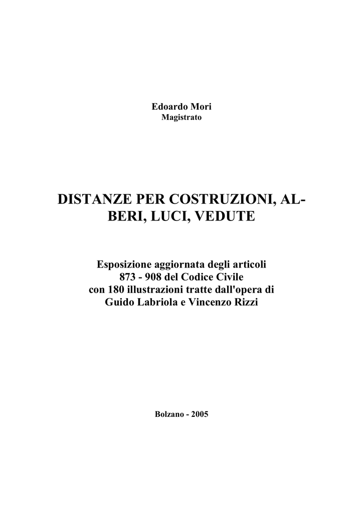 Edoardo Mori Magistrato DISTANZE PER COSTRUZIONI, ALBERI, LUCI, VEDUTE Esposizione aggiornata degli articoli 873 - 908 del Codice Civile con 180 illustrazioni tratte dall'opera di Guido Labriola e Vincenzo Rizzi Bolzano - 2005 AVVERTENZA Ho provato senza successo a rintracciare gli eredi di G. Labriola e Vincenzo Ricci. Se qualcuno avesse diritti da vantare, sono a sua disposizione. La presente opera è coperta da copyright, ma può essere utilizzata, con indicazione degli Autori, per scopi non commerciali. 2 DISTANZE PER COSTRUZIONI, ALBERI, LUCI, VEDUTE Articoli 873 - 908 del Codice Civile Le distanze fra le costruzioni sono regolate dalle legge per vari motivi: perché ogni proprietario possa godere del suo immobile con il minor sacrificio per i vicino o, se necessario, con pari sacrificio, per evitare che si creino situazioni insalubri o fonti di discordia, ecc. La legge quindi prevede che chi edifica deve rispettare i piani regolatori e i regolamenti comunali (artt. 869-871 C.C.) e che non è consentito violare le norme sulle distanze contenute negli artt. 873-899 C.C. e le norme dei regolamenti che questi articoli richiamano. In caso di violazione chi la ha subita può richiedere la rimessione in pristino (art. 872 C.C.), vale a dire che la costruzione che viola le distanze sia rimossa fino alla distanza di legge. Se sono violate norme amministrative diverse da quelle richiamate, chi ha subito la violazione può chiedere solo il risarcimento del danno. La giurisprudenza del passato, troppo vincolata a vecchi dogmatismi ignoti alla lettera della legge, ha sovente affermato che le norme sulle distanze nelle costruzioni hanno per scopo principale quello di evitare la formazioni di intercapedini antigieniche, così che non sarebbero norme integrative del codice civile quelle norme di regolamenti comunali aventi diversa funzione (estetica, urbanistica, ecc.). Ora ci si è resi conto che la distanza fra gli edifici risponde ad esigenze multiple, tutte di egual importanza anche sul piano costituzionale (igiene, sicurezza da accessi, sicurezza da incendi, difesa della privacy. In una parola difesa della qualità della vita) per cui non ha senso arrampicarsi sugli specchi per difendere chi edifica abusivamente. Si consideri tra l'altro che l'argomento dell'igiene e salubrità non è certamente invocabile per le distanza degli alberi dal confine! La regola ormai prevalentemente accettata è quindi che ogni norma sulle distanze delle costruzioni, siano esse nel codice civile, o in regolamenti comunali, o in leggi speciali (costruzioni sismiche) può essere invocata per la rimessione in pristino. Le norme stabilite dai regolamenti comunali e da altre leggi speciali sono inderogabili (così Cass. 19449/2004, dopo assurde diverse affermazioni del passato) e quindi non possono essere derogate per convenzione fra le parti. Anche le distanze fissate dagli artt. 873-899 sono inderogabili, ma è possibile acquisire per usucapione ventennale la servitù di tenere la costruzione (o pozzo, o albero, ecc.) a distanza inferiore a quella legale. Dice la S. C. "Anche se il potere di far valere le limitazioni della proprietà nei rapporti di vicinato e imprescrittibile, nondimeno e ammissibile la costituzione per usucapione di una servitù il cui contenuto contrasti con una delle dette limitazioni. ( nella specie e stata ritenuta ammissibile la costituzione per usucapione del diritto di tenere una costruzione a distanza inferiore a quella dalla costruzione del vicino e dal confine prescritta dal regolamento edilizio)" (Cass. 1422/1970) 3 Si può quindi concludere che chi vede violare una distanza legale inderogabile in suo danno può sempre agire civilmente per la sua regolarizzazione purché non siano trascorsi vent'anni a partire dal momento in cui la violazione è stata manifesta, e che se sono state violate altre disposizioni amministrative può agire in via amministrativa per l'annullamento di concessioni o licenze e per il risarcimento del danno, fino a che l'azione non si sia prescritta o vi siano stati una sanatoria o un condono edilizi. La giurisprudenza della Cassazione ha talvolta attenuato la normativa sulle distanze per costruzioni e vedute in ambito condominiale. Si ha l'impressione che spesso abbia ecceduto nel riconoscere il diritto del singolo ad usare delle parti comuni senza tener conto del diritto prevalente del singolo a non veder peggiorata la sua situazione. Le norme del codice civile sulle distanza fra le costruzioni e le distanze per luci, vedute, prospetti, le relative norme sulle servitù prediali, frutto di una elaborazione millenaria, sono molto chiare, ma richiedono che l'interprete possieda un po' di nozioni di edilizia e comprenda esattamente il significato dei termini usati e che sappia applicare la norma alla situazione concreta. L'esposizione della materia deve essere perciò accompagnata da disegni che rendano esplicita la situazione dei luoghi e ciò che il legislatore ha inteso dire. Già nell'Ottocento si rinvengono opere del genere come quella di Piccoli Luigi, Le servitù prediali ridotte in casi pratici incisi in rame e geometricamente dimostrate. Nuova edizione riformata coll’applicazione dei rami al Codice Universale della monarchia autriaca in cui sono comprese anche le servitù personali con annotazioni relative al codice italiano cessato, al diritto romano ed a’ classici autori. Milano, Batelli e Fanfani, 1818., oppure quella di Castelli Giuseppe Antonio, Questioni diverse sulle servitù prediali. Milano, Visaj, 1820. Preziosa opera sull'argomento, più vicina ai nostri tempi, era il testo Le Servitù Prediali dell'avv. Guido Labriola e dell'ing. Vincenzo Rizzi, pubblicato a Bari nel 1948, arrivato alla terza edizione nel 1951, a cui attingerò, specialmente per le immagini, per questa mia esposizione molto sintetica della materia. Il testo delle didascalie è stata variato per sintesi e per adattarlo alla giurisprudenza posteriore. Avverto che la giurisprud