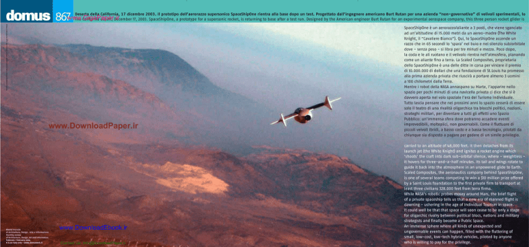 867www.GigaPaper.ir Periodico mensile/Spedizione in abbonamento postale 45%/art.2/comma 20/B, legge 662/96 Filiale di Milano Deserto della California, 17 dicembre 2003. Il prototipo dell’aerorazzo supersonico SpaceShipOne rientra alla base dopo un test. Progettato dall’ingegnere americano Burt Rutan per una azienda “non-governativa” di velivoli sperimentali, lo The California desert, December 17, 2003. SpaceShipOne, a prototype for a supersonic rocket, is returning to base after a test run. Designed by the American engineer Burt Rutan for an experimental aerospace company, this three person rocket glider is www.DownloadPaper.ir Rivista mensile di Architettura, Design, Arte e Informazione Monthly review of Architecture, Design, Art and Information Febbraio / February 2004 € 8.50 Italy only - www.domusweb.it www.DownloadEbook.ir Contact Us: [email protected] SpaceShipOne è un aerorazzo/aliante a 3 posti, che viene sganciato ad un’altitudine di 15.000 metri da un aereo-madre (The White Knight, il “Cavaliere Bianco”). Qui, lo SpaceShipOne accende un razzo che in 65 secondi lo ‘spara’ nel buio e nel silenzio sub/orbitale dove - senza peso - si libra per tre minuti e mezzo. Poco dopo, la coda e le ali ruotano e il velivolo rientra nell’atmosfera, planando come un aliante fino a terra. La Scaled Composites, proprietaria dello SpaceShipOne è una delle ditte in corsa per vincere il premio di 10.000.000 di dollari che una fondazione di St.Louis ha promesso alla prima azienda privata che riuscirà a portare almeno 3 uomini a 100 chilometri dalla Terra. Mentre i robot della NASA annaspano su Marte, l’apparire nello spazio per pochi minuti di una navicella privata ci dice che si è davvero aperta nel volo spaziale l’era del Turismo Individuale. Tutto lascia pensare che nei prossimi anni lo spazio cesserà di essere solo il teatro di una rivalità oligarchica tra blocchi politici, nazioni, strateghi militari, per diventare a tutti gli effetti uno Spazio Pubblico: un’immensa sfera dove potranno accadere eventi imprevedibili, molteplici, non governabili. Come il fluttuare di piccoli veivoli ibridi, a basso costo e a bassa tecnologia, pilotati da chiunque sia disposto a pagare per godere di un simile privilegio. carried to an altitude of 48,000 feet. It then detaches from its launch jet (the White Knight) and ignites a rocket engine which ‘shoots’ the craft into dark sub-orbital silence, where - weightless it hovers for three-and-a-half minutes. Its tail and wings rotate to guide it back into the atmosphere in an unpowered glide to Earth. Scaled Composites, the aeronautics company behind SpaceShipOne, is one of several teams competing to win a $10 million prize offered by a Saint Louis foundation to the first private firm to transport at least three civilians 328.000 feet from terra firma. While NASA’s robotic probes mosey around Mars, the brief flight of a private spaceship tells us that a new era of manned flight is dawning - ushering in the age of Individual Tourism in space. It could well be that that space will soon cease to be only a stage for oligarchic rivalry between political blocs, nations and military strategists and finally become a Public Space. An immense sphere where all kinds of unexpected and ungovernable events can happen, filled with the fluttering of small, low-cost, low-tech hybrid vehicles, piloted by anyone who is willing to pay for the privilege. www.GigaPaper.ir Periodico mensile/Spedizione in abbonamento postale 45%/art.2/comma 20/B, legge 662/96 Filiale di Milano 867 Deserto della California, 17 dicembre 2003. Il prototipo dell’aerorazzo supersonico SpaceShipOne rientra alla base dopo un test. Progettato dall’ingegnere americano Burt Rutan per una azienda “non-governativa” di velivoli sperimentali, lo The California desert, December 17, 2003. SpaceShipOne, a prototype for a supersonic rocket, is returning to base after a test run. Designed by the American engineer Burt Rutan for an experimental aerospace company, this three person rocket glider is www.DownloadPaper.ir Rivista mensile di Architettura, Design, Arte e Informazione Monthly review of Architecture, Design, Art and Information Febbraio / February 2004 € 8.50 Italy only - www.domusweb.it www.DownloadEbook.ir Contact Us: [email protected] SpaceShipOne è un aerorazzo/aliante a 3 posti, che viene sganciato ad un’altitudine di 15.000 metri da un aereo-madre (The White Knight, il “Cavaliere Bianco”). Qui, lo SpaceShipOne accende un razzo che in 65 secondi lo ‘spara’ nel buio e nel silenzio sub/orbitale dove - senza peso - si libra per tre minuti e mezzo. Poco dopo, la coda e le ali ruotano e il velivolo rientra nell’atmosfera, planando come un aliante fino a terra. La Scaled Composites, proprietaria dello SpaceShipOne è una delle ditte in corsa per vincere il premio di 10.000.000 di dollari che una fondazione di St.Louis ha promesso alla prima azienda privata che riuscirà a portare almeno 3 uomini a 100 chilometri dalla Terra. Mentre i robot della NASA annaspano su Marte, l’apparire nello spazio per pochi minuti di una navicella privata ci dice che si è davvero aperta nel volo spaziale l’era del Turismo Individuale. Tutto lascia pensare che nei prossimi anni lo spazio cesserà di essere solo il teatro di una rivalità oligarchica tra blocchi politici, nazioni, strateghi militari, per diventare a tutti gli effetti uno Spazio Pubblico: un’immensa sfera dove potranno accadere eventi imprevedibili, molteplici, non governabili. Come il fluttuare di piccoli veivoli ibridi, a basso costo e a bassa tecnologia, pilotati da chiunque sia disposto a pagare per godere di un simile privilegio. carried to an altitude of 48,000 feet. It then detaches from its launch jet (the White Knight) and ignites a rocket engine which ‘shoots’ the craft into dark sub-orbital silence, where - weightless it hovers for three-and-a-half minutes. Its tail and wings rotate to guide it b